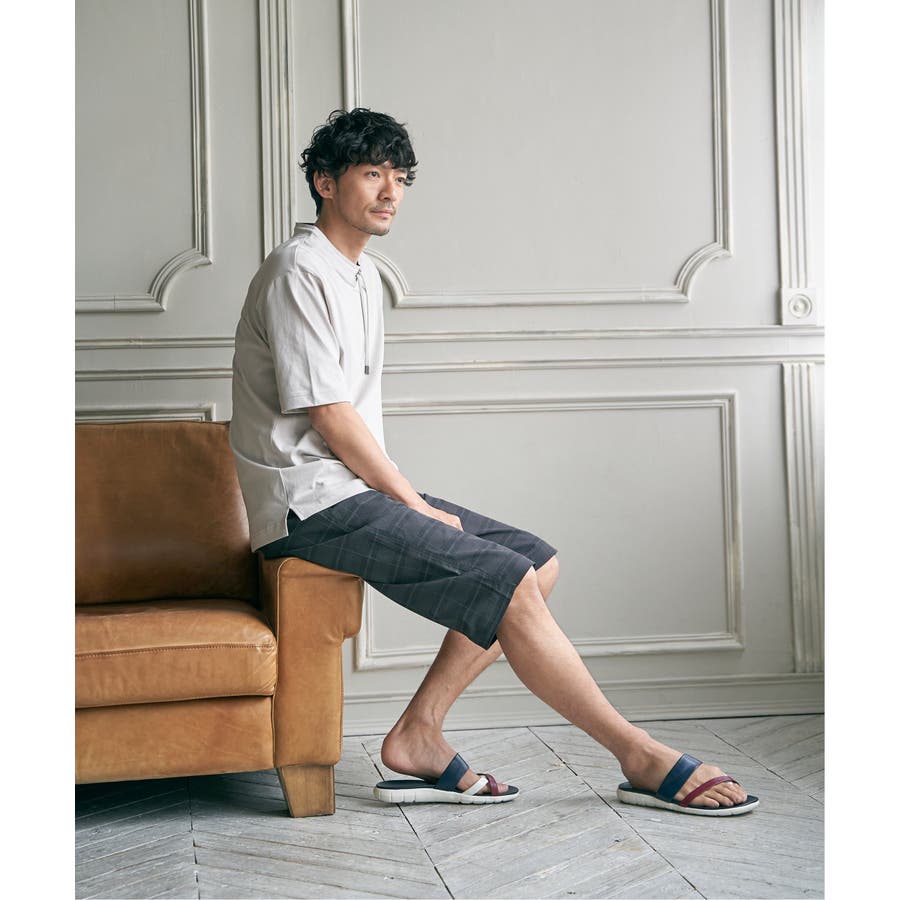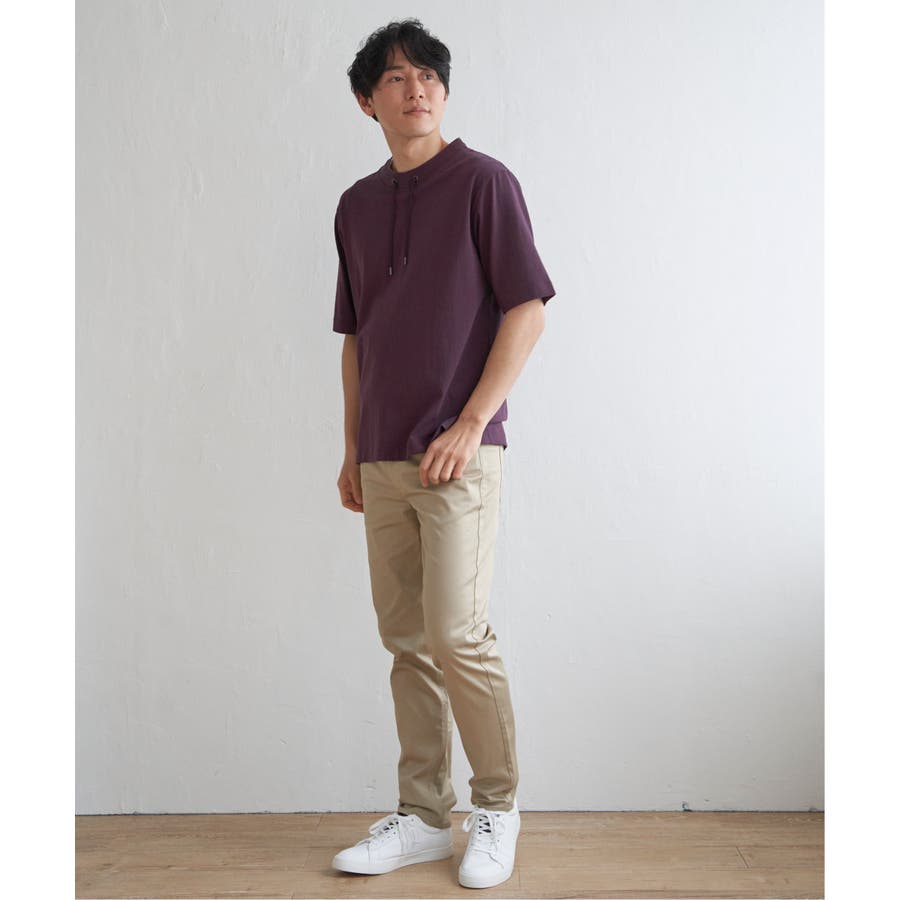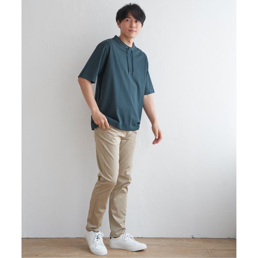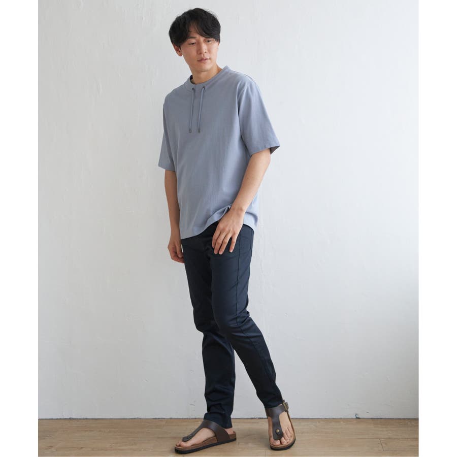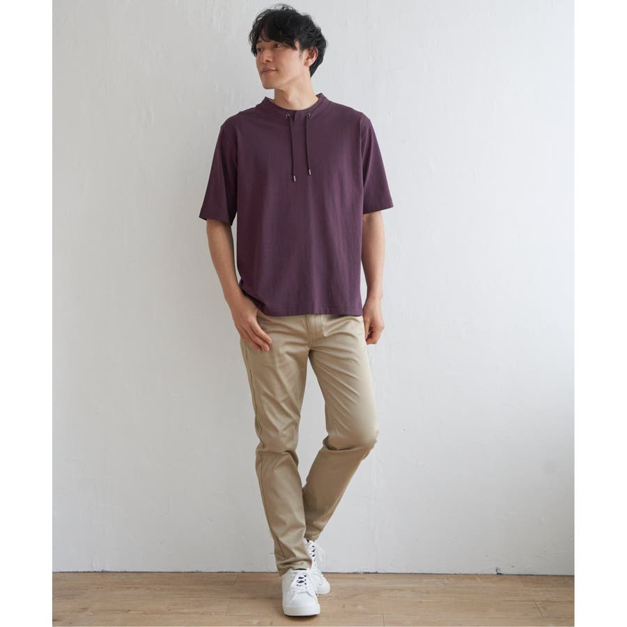 ルーイカラーと呼ばれる、スタンド襟にスピンドル(紐)を通した首回りのデザインが特徴的な5分袖Tシャツ。