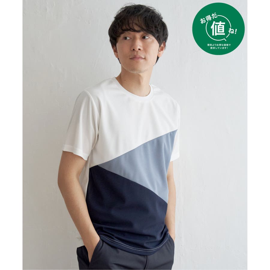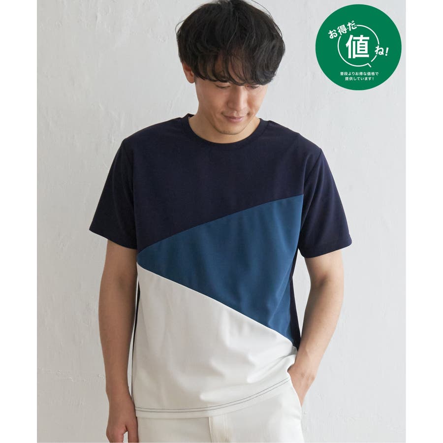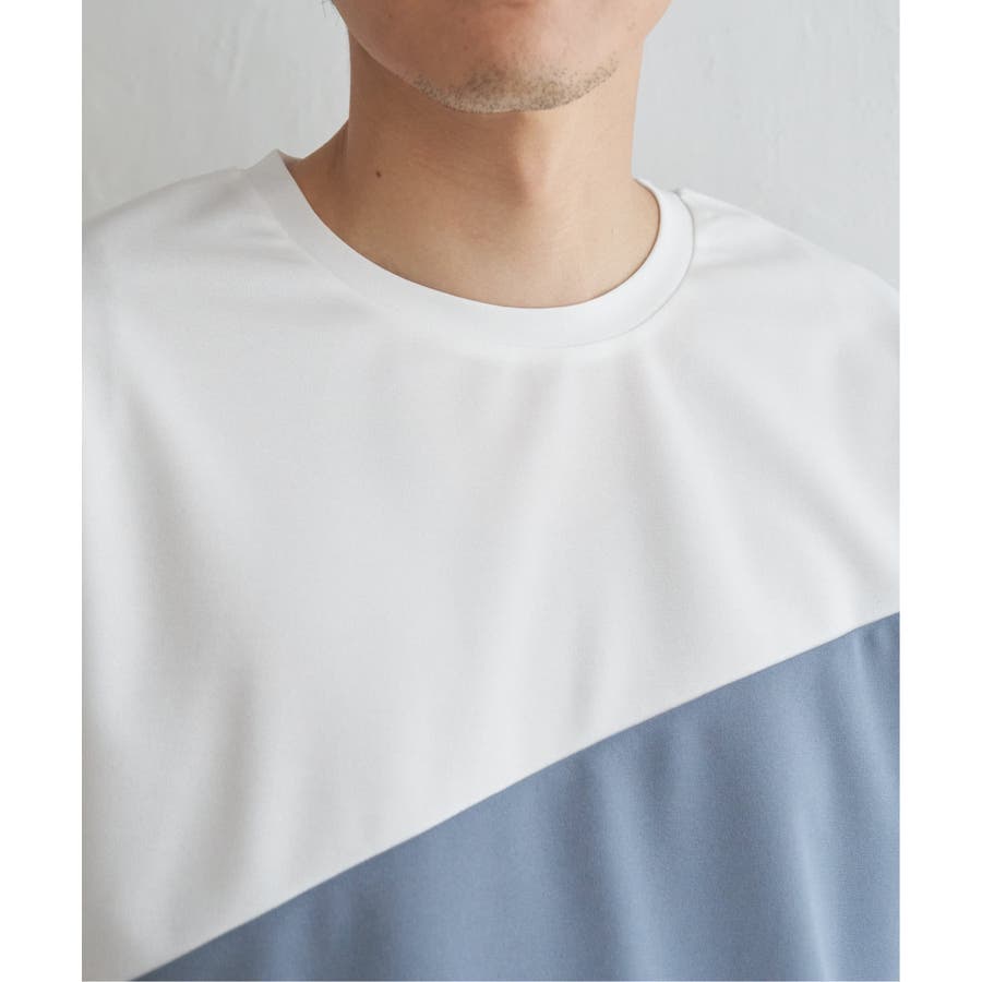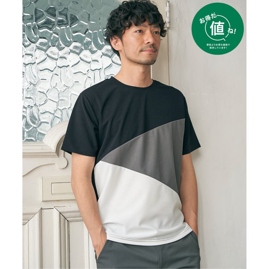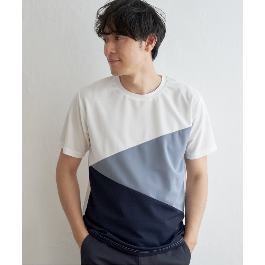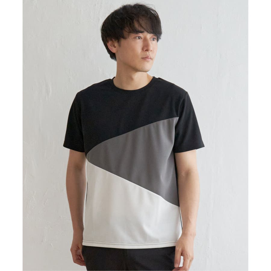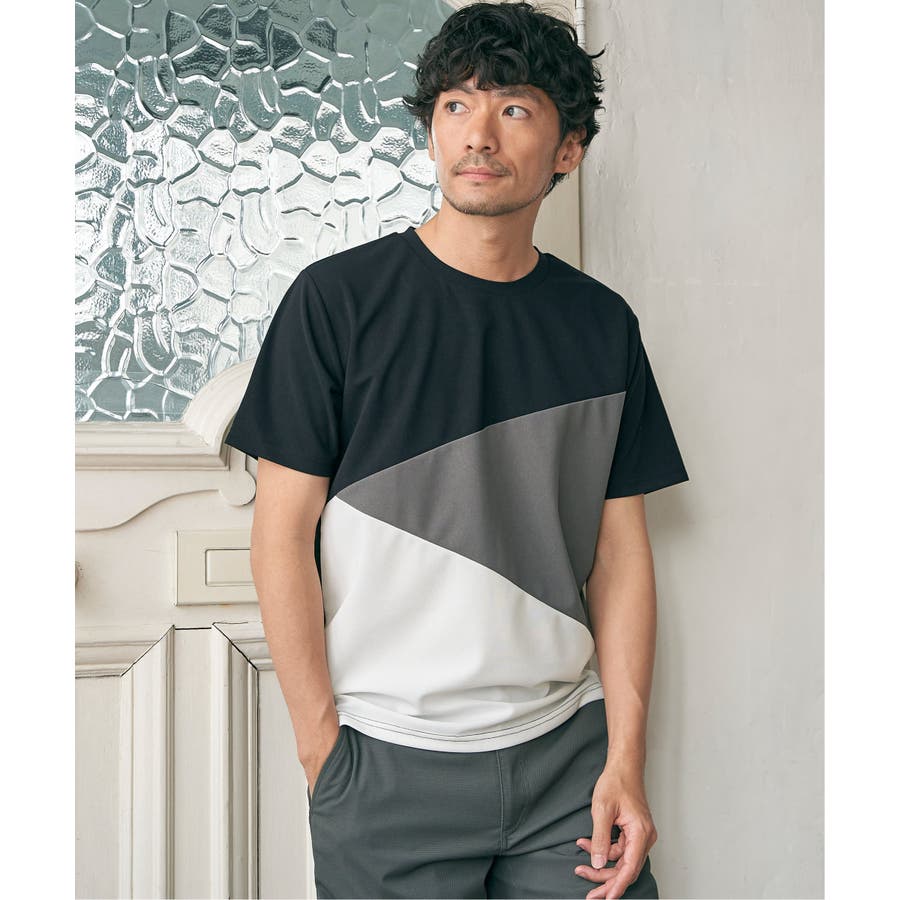 前身頃を3配色で斜めに切り替えた半袖Tシャツ。