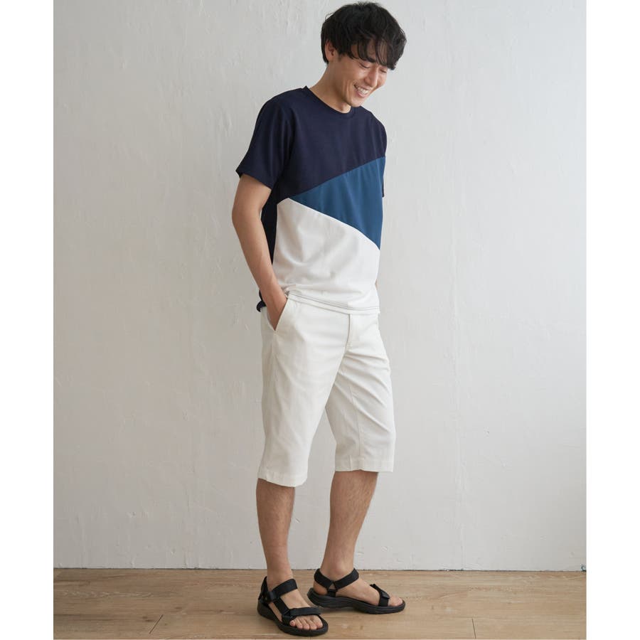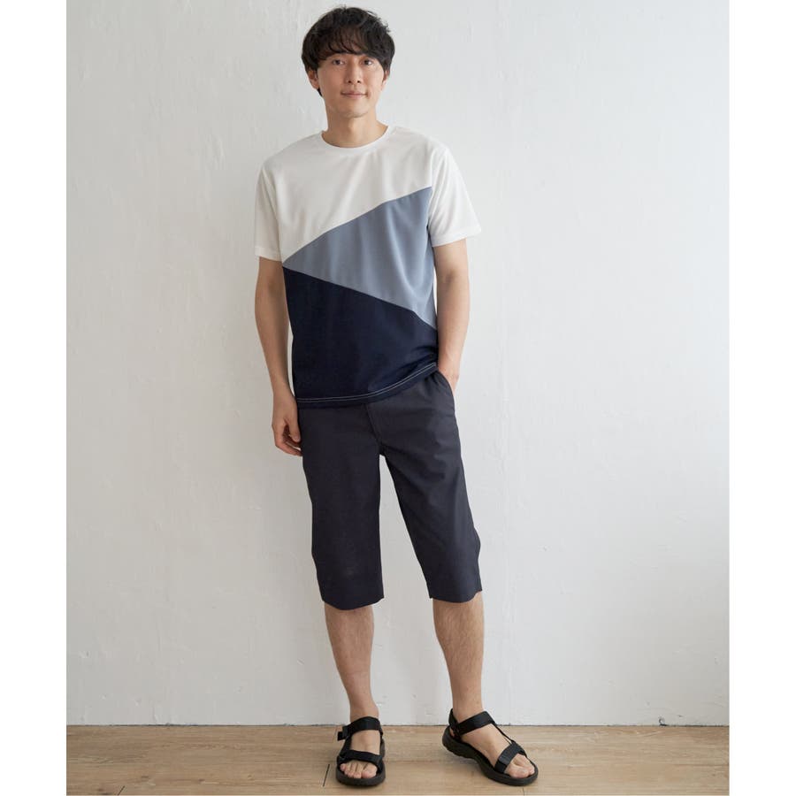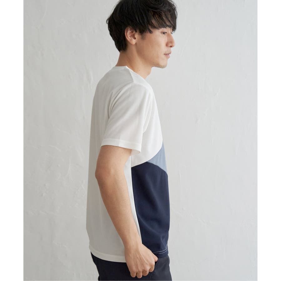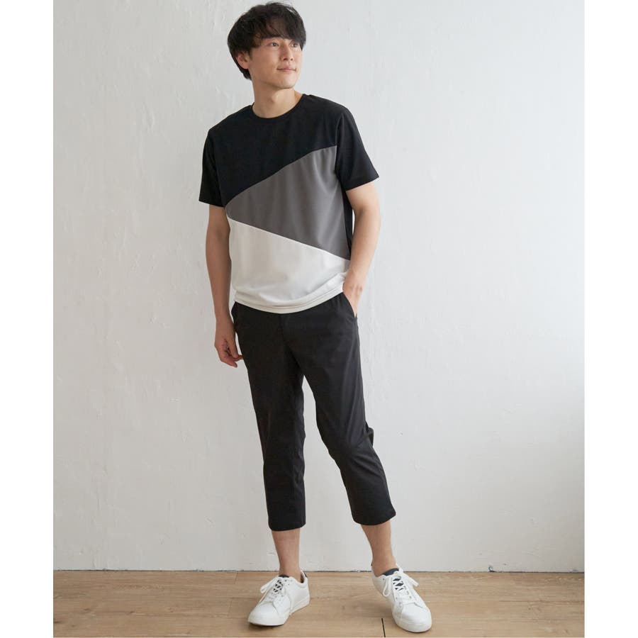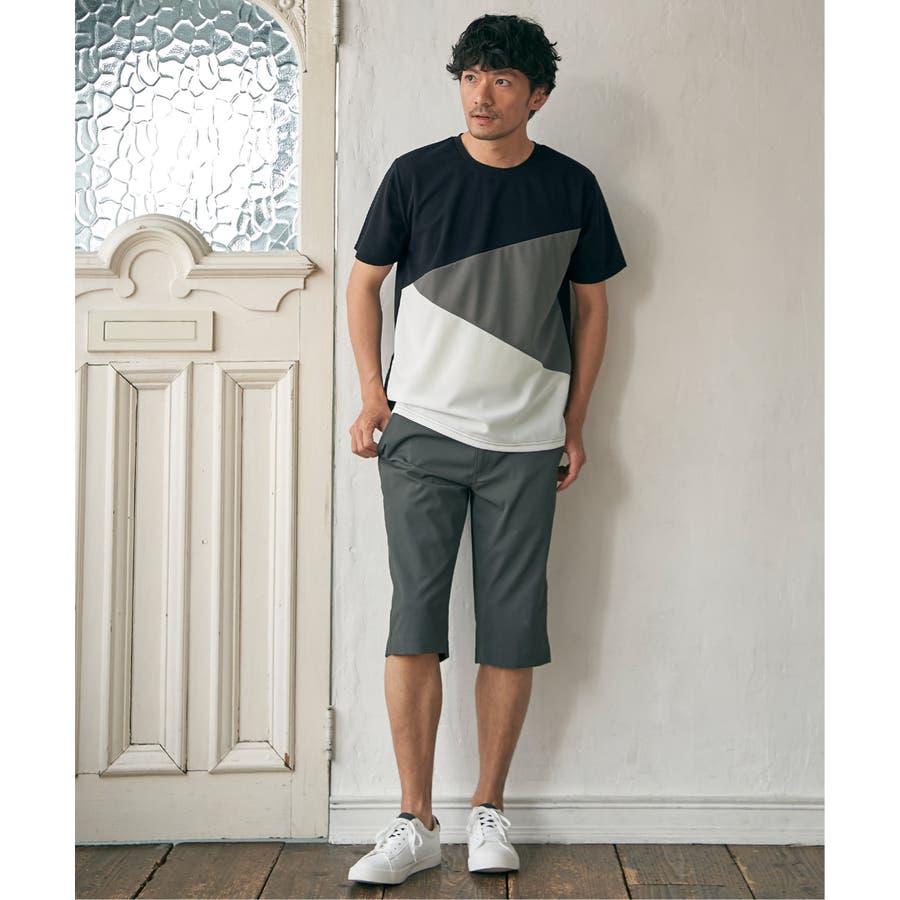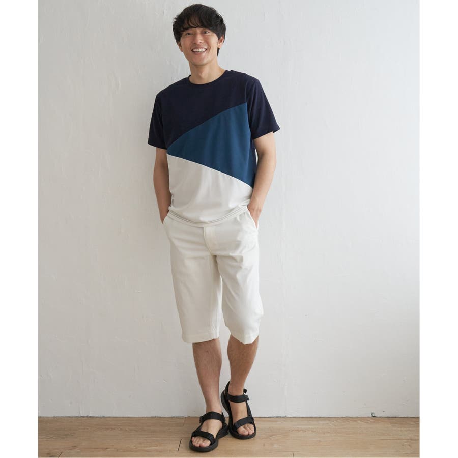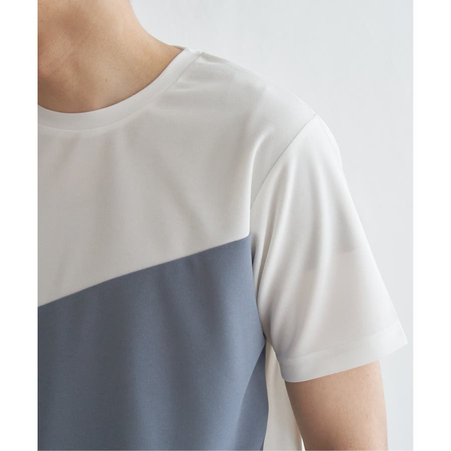 前身頃を3配色で斜めに切り替えた半袖Tシャツ。