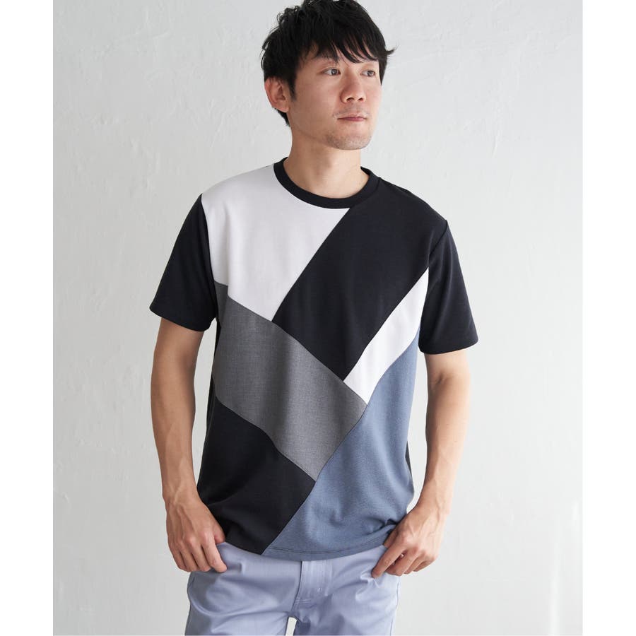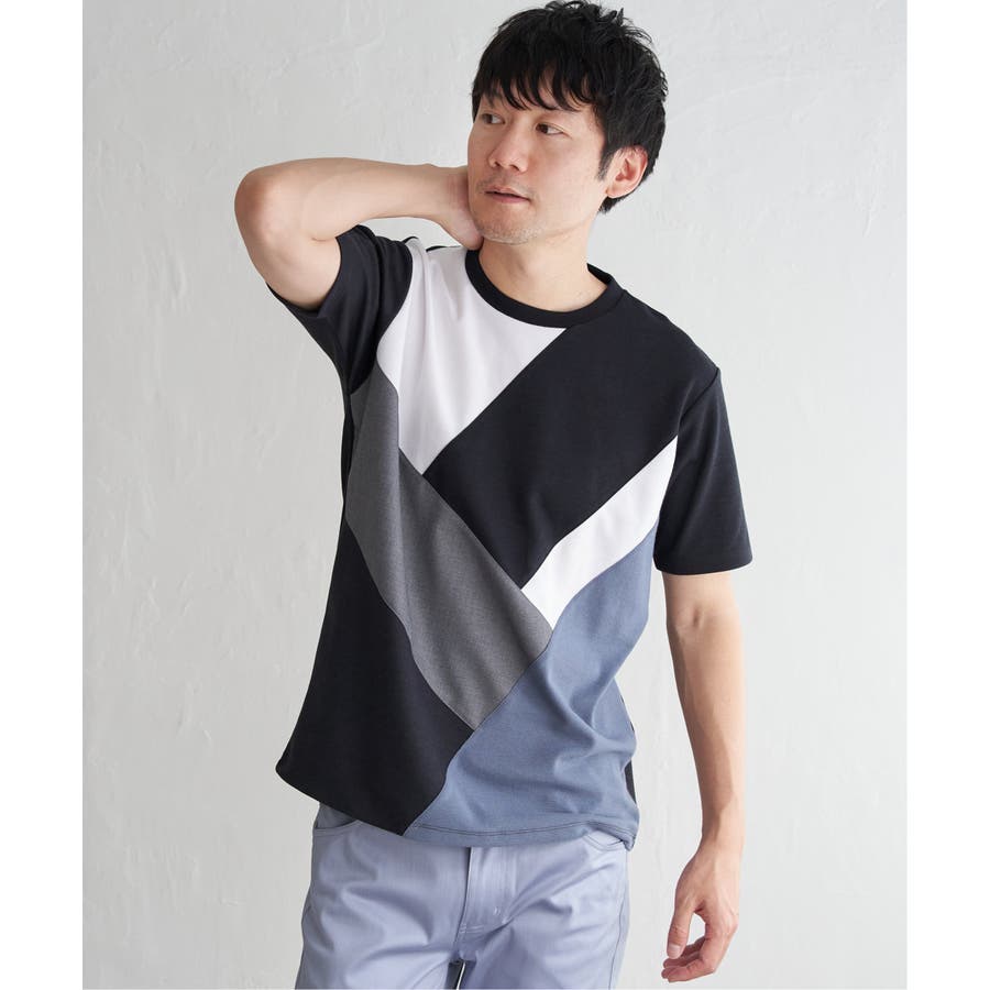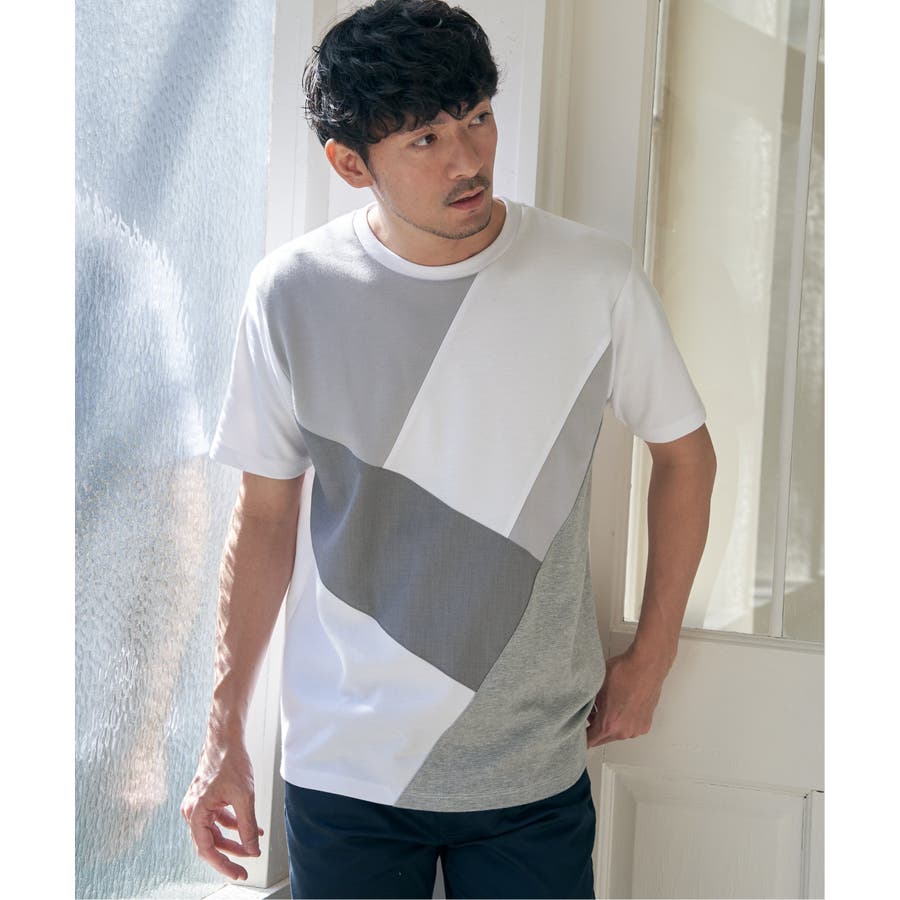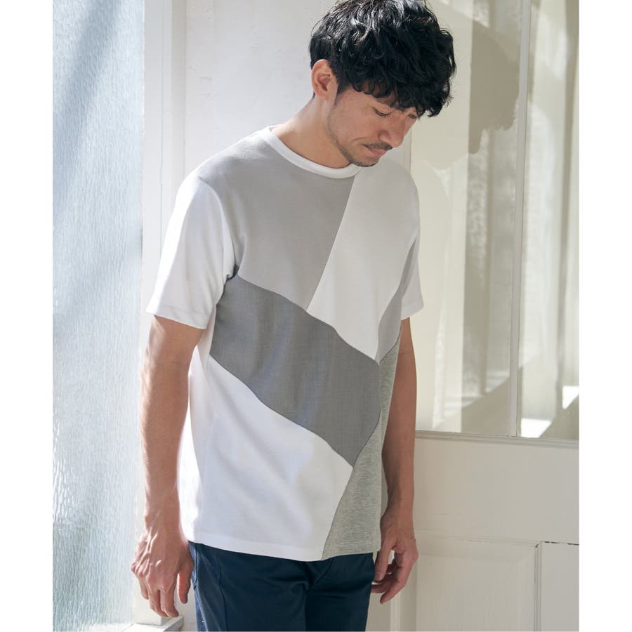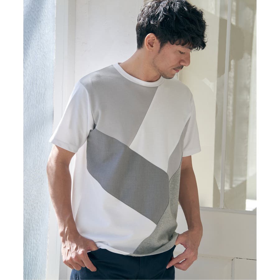 ポンチ・リップル・布帛の3種類の素材を使用した、半袖の切り替えTシャツ。