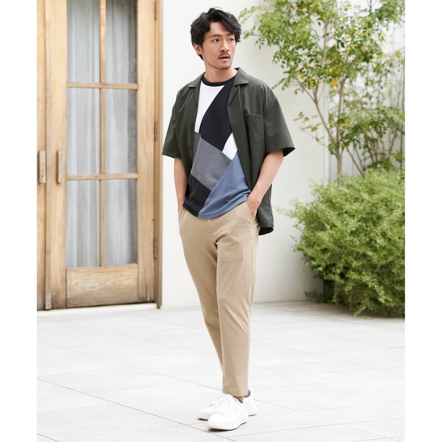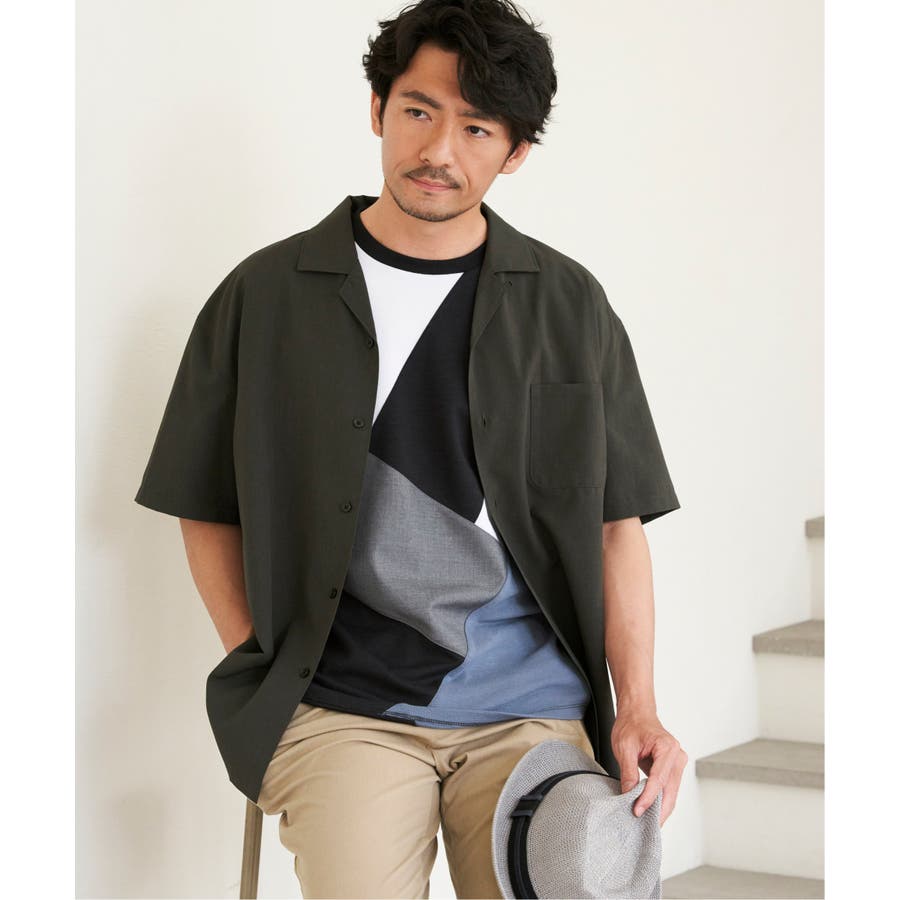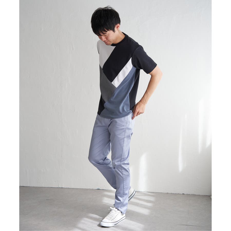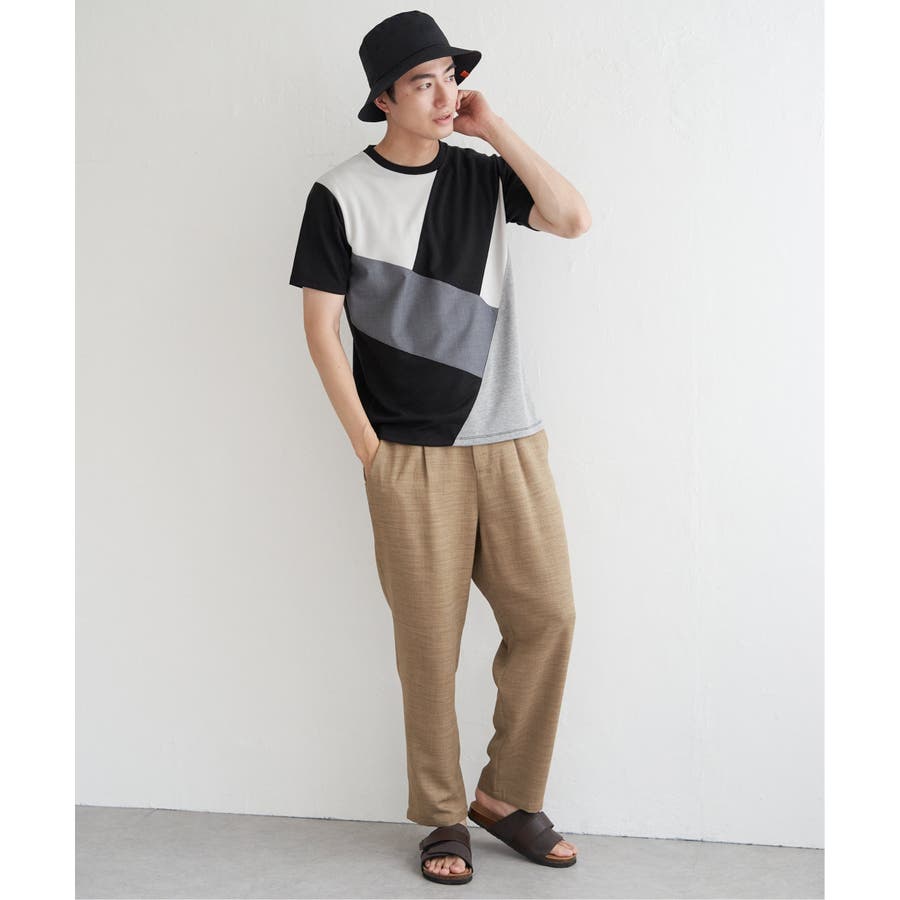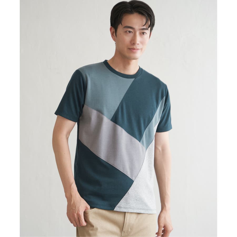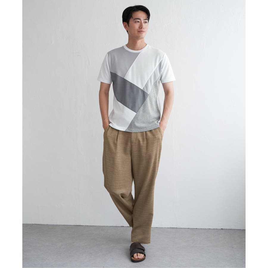 ポンチ・リップル・布帛の3種類の素材を使用した、半袖の切り替えTシャツ。