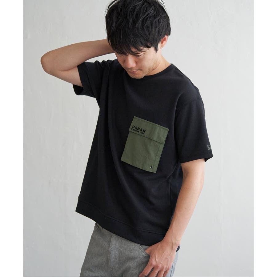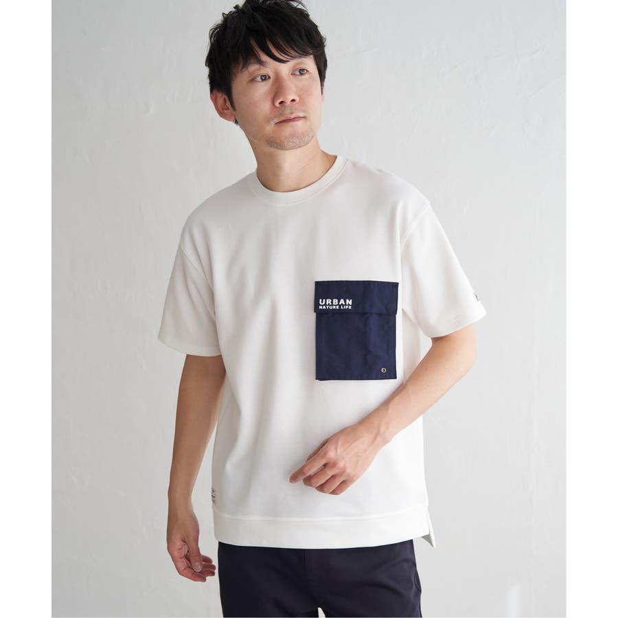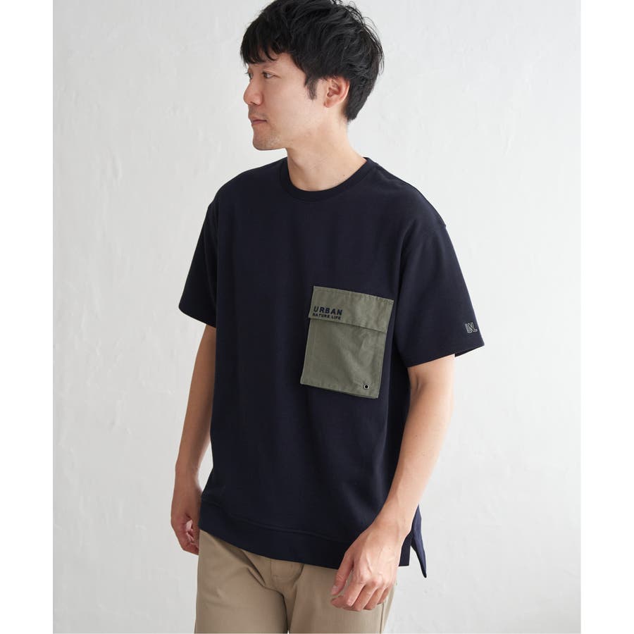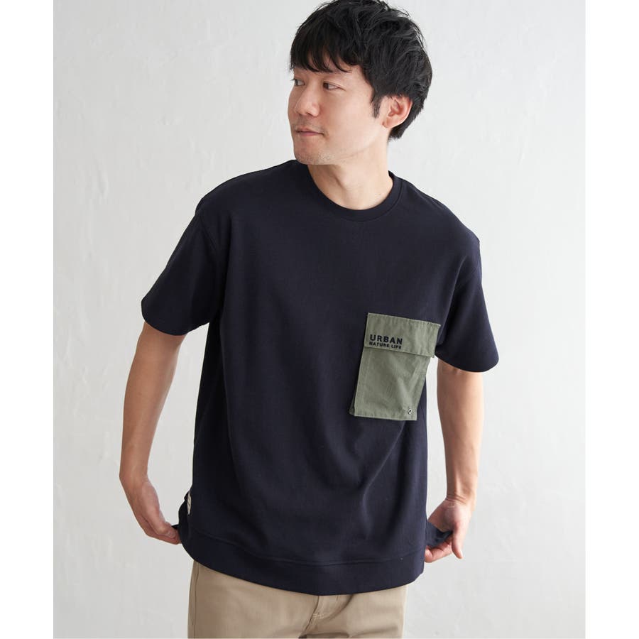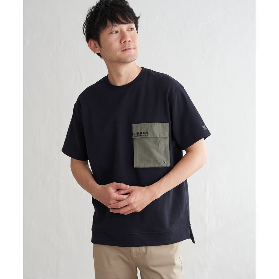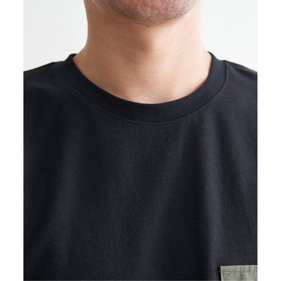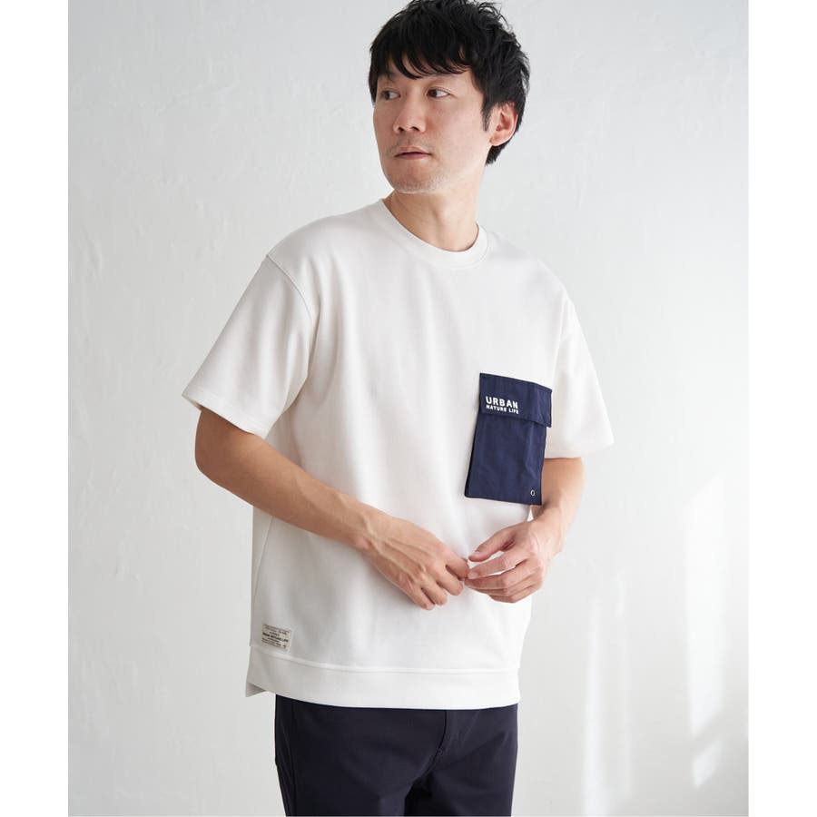 左胸に布帛の配色フラップポケットが付いた半袖Tシャツです。