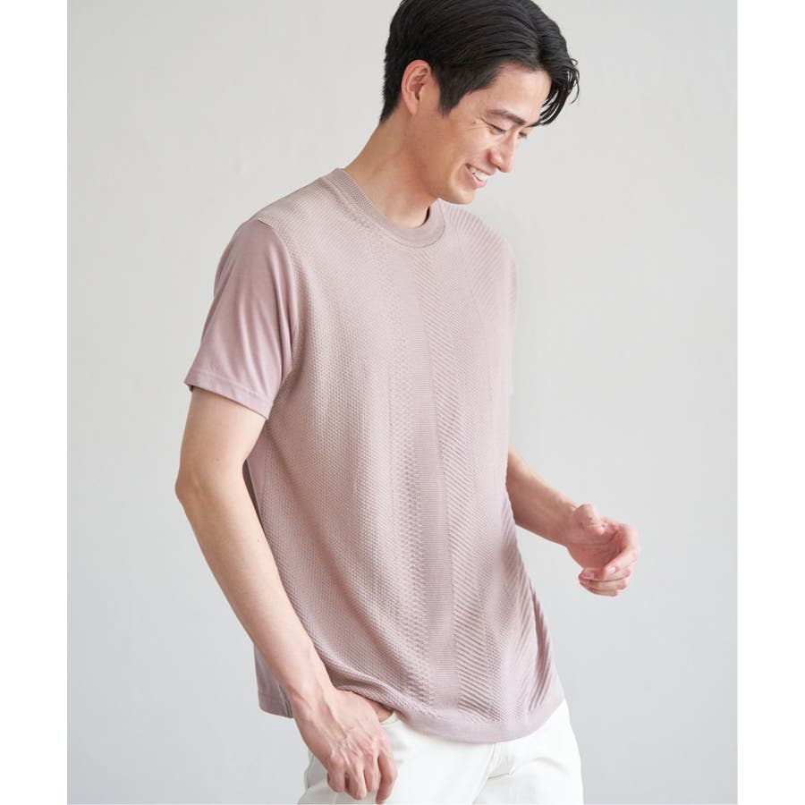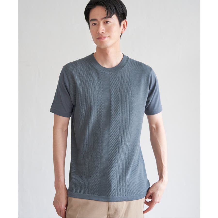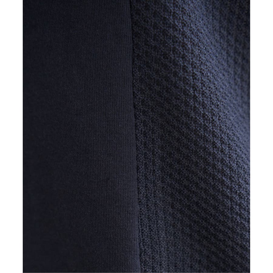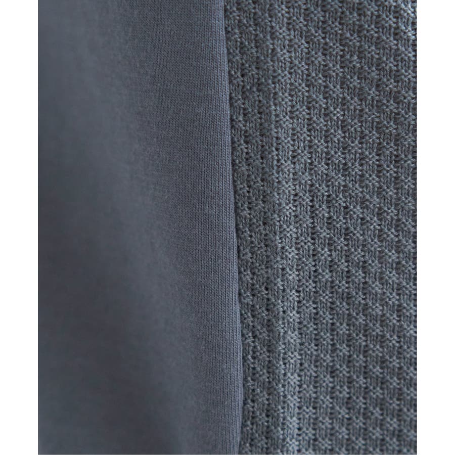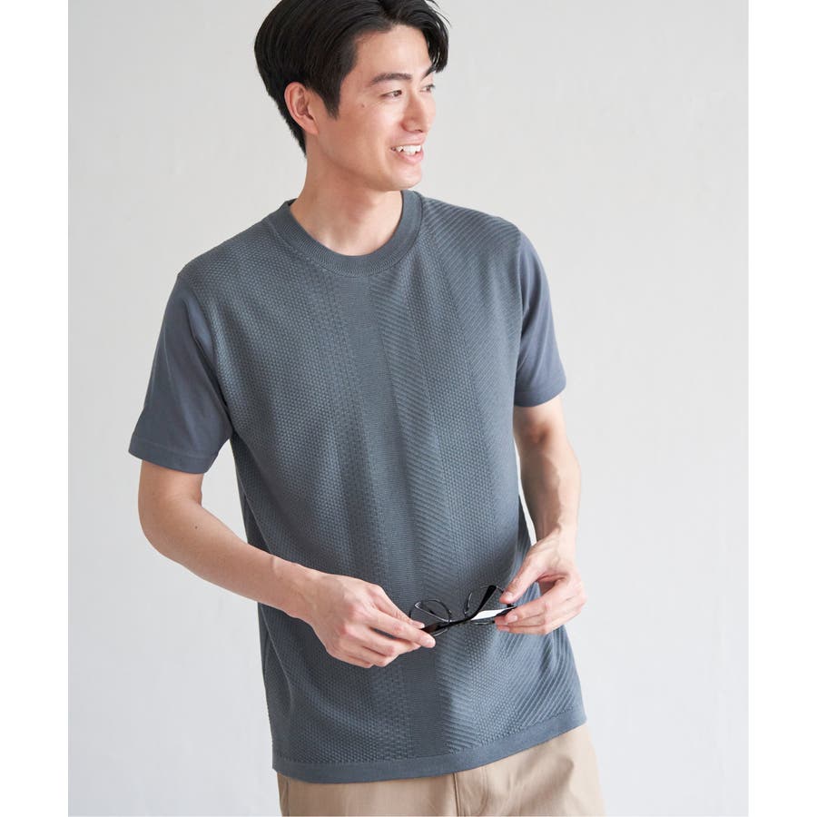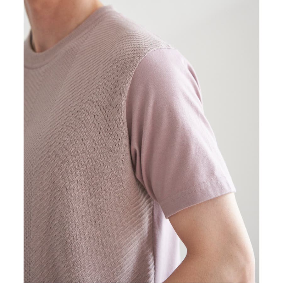 前身頃は編地切り替えのニット、袖と背中はTシャツ生地で切り替えた異素材ドッキングのTシャツ。