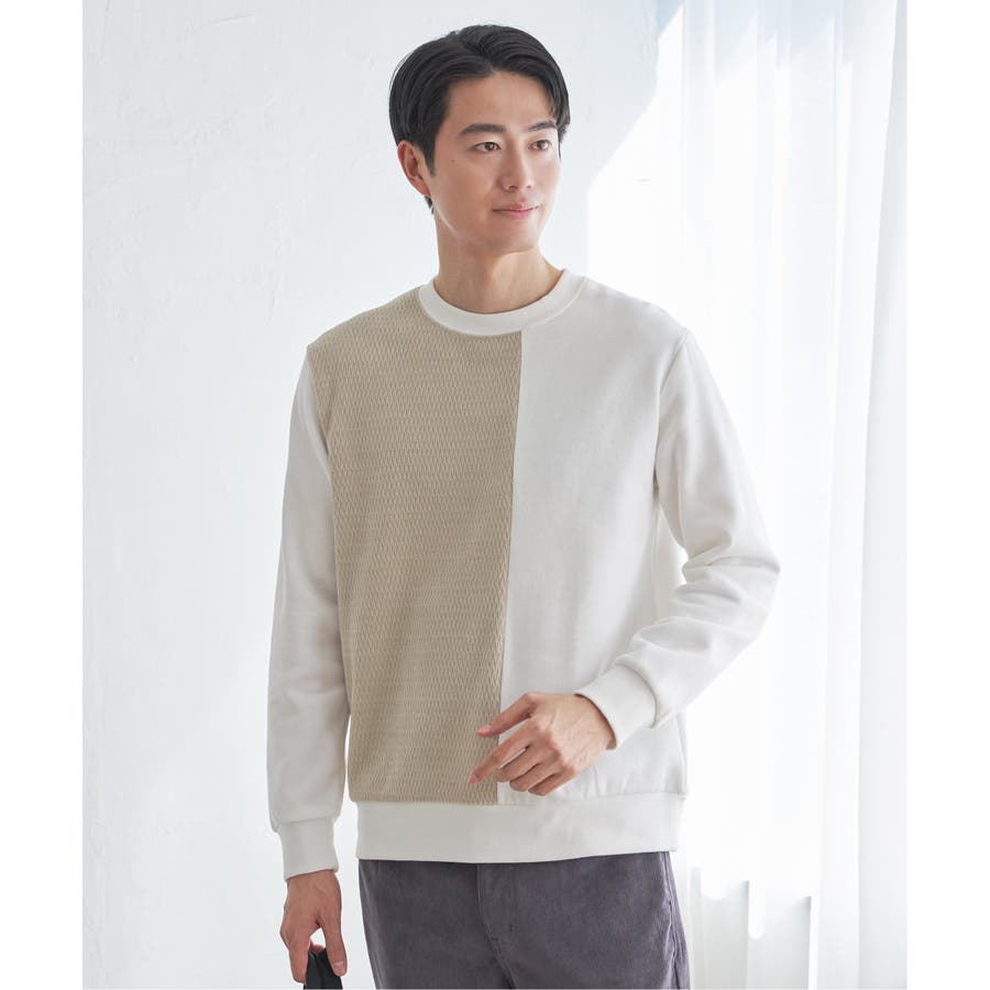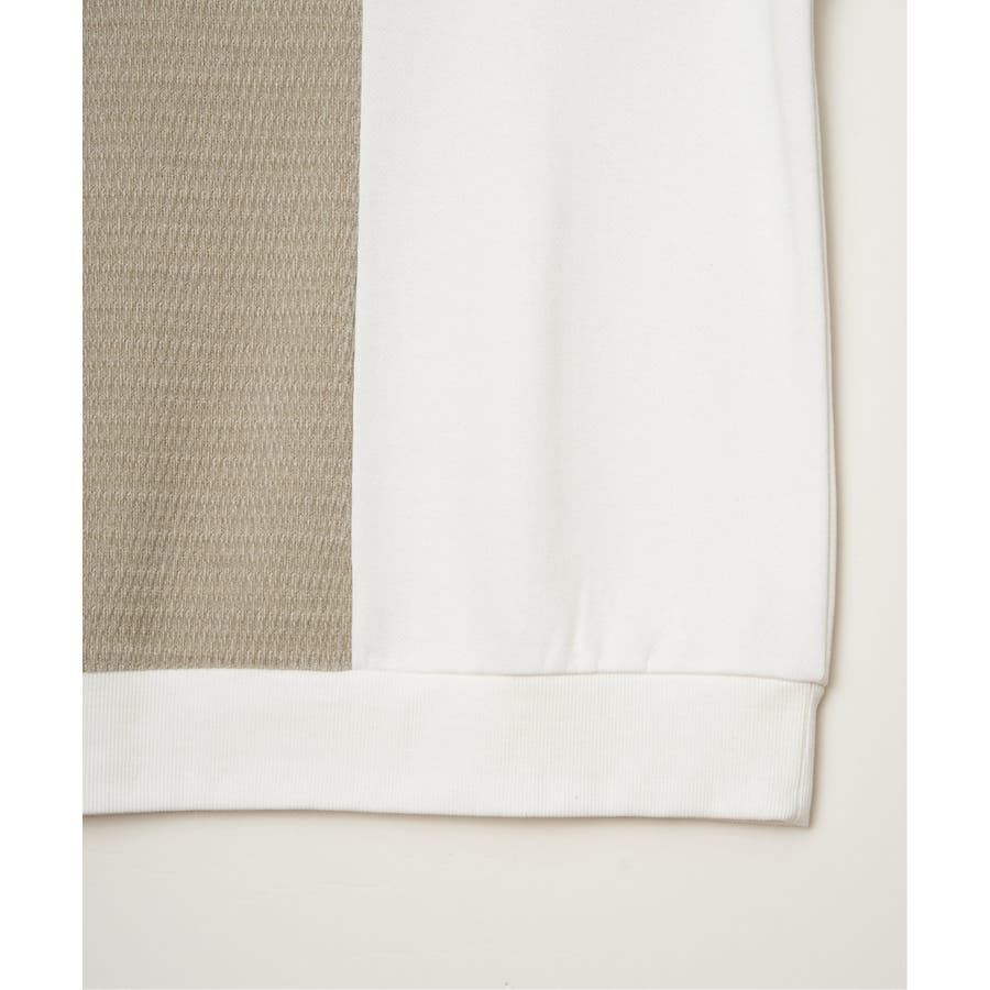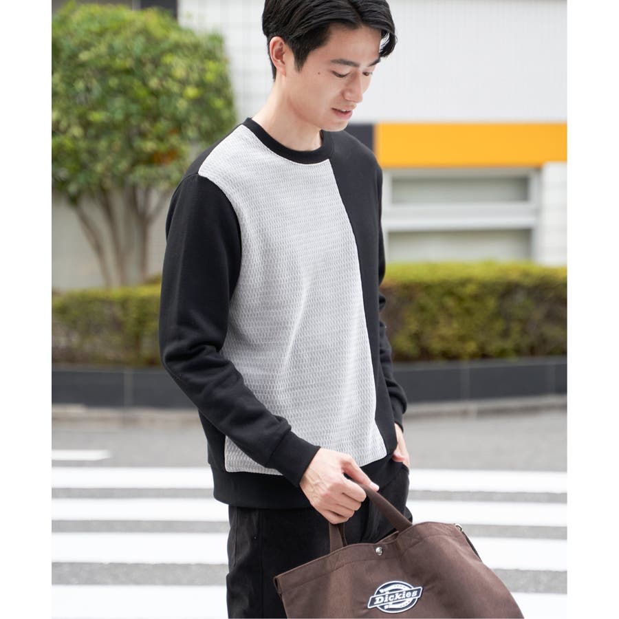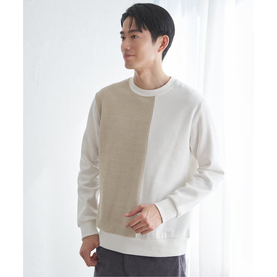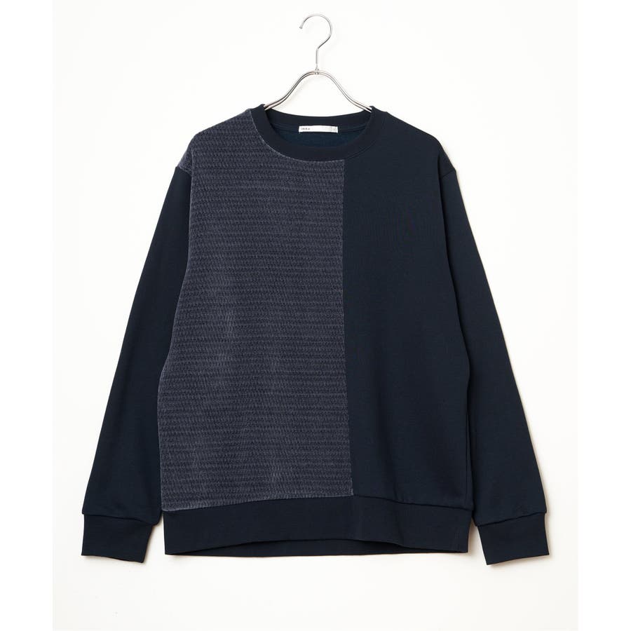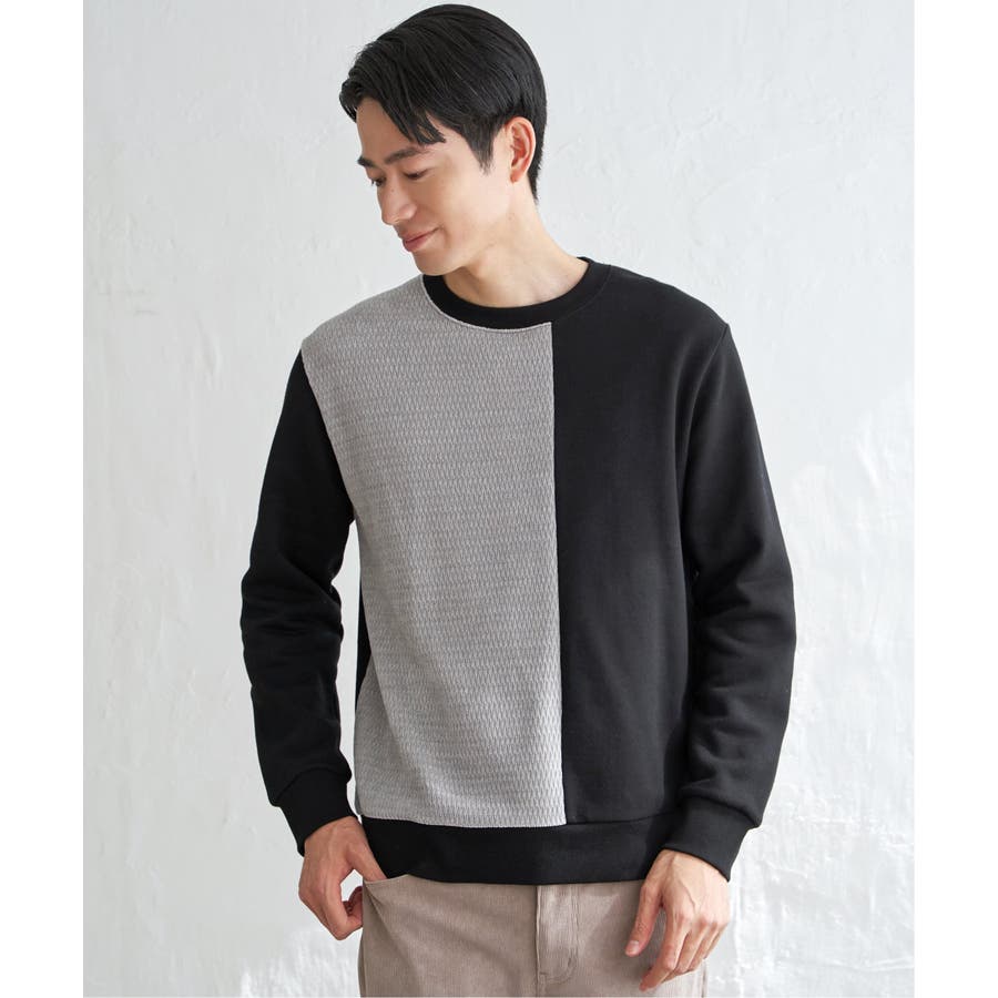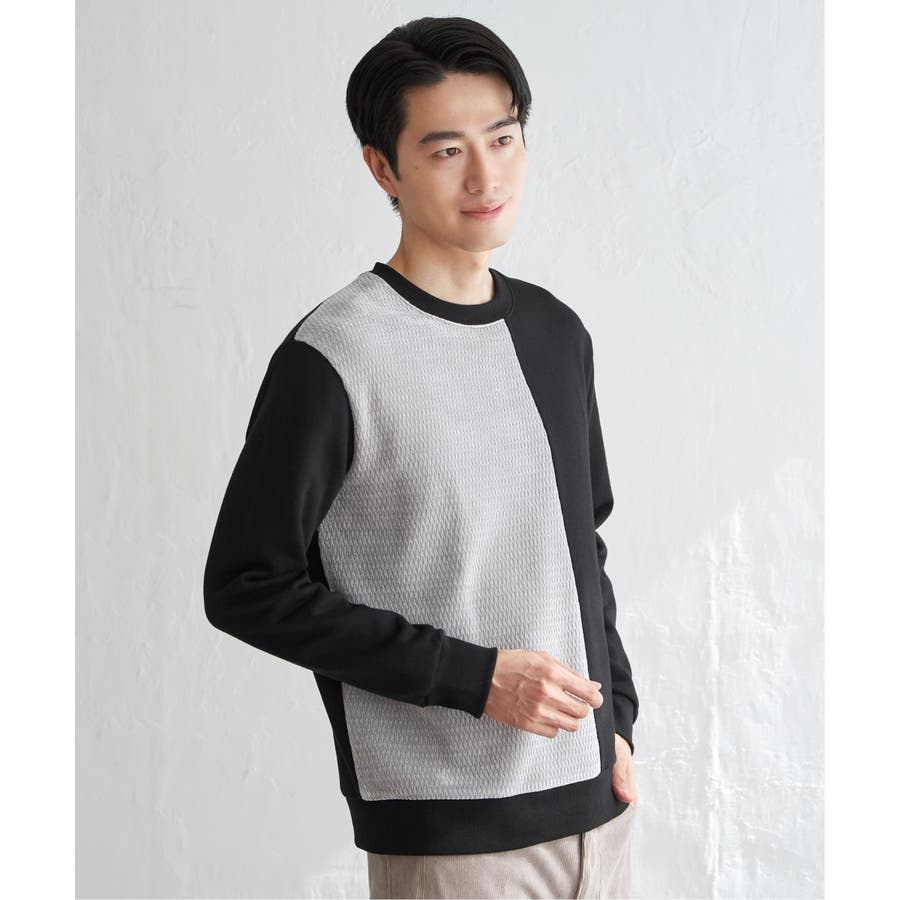前身頃が異素材切り替えになったクルーネックプルオーバー。