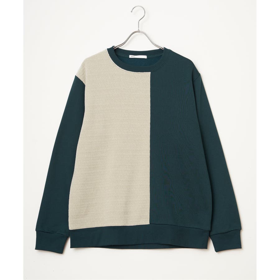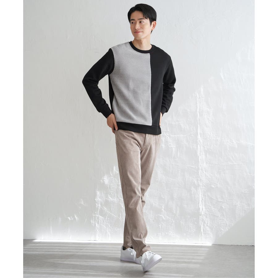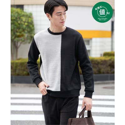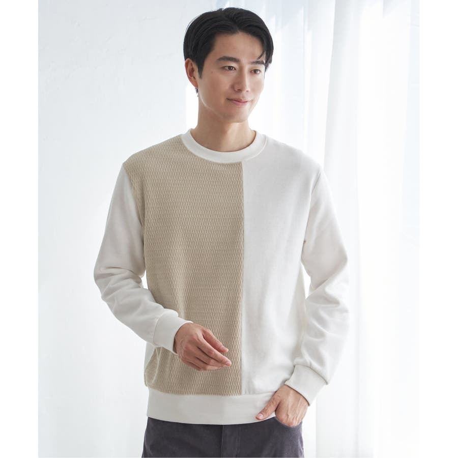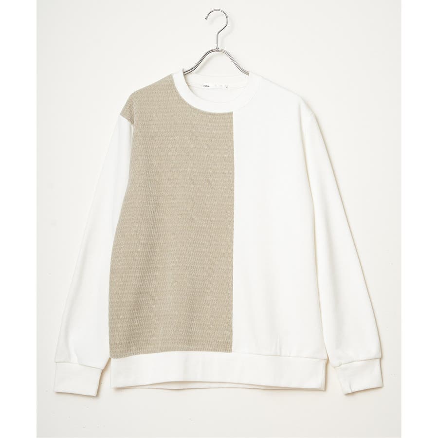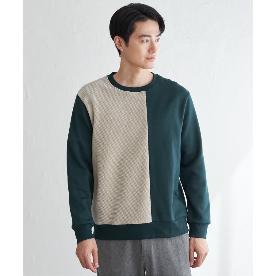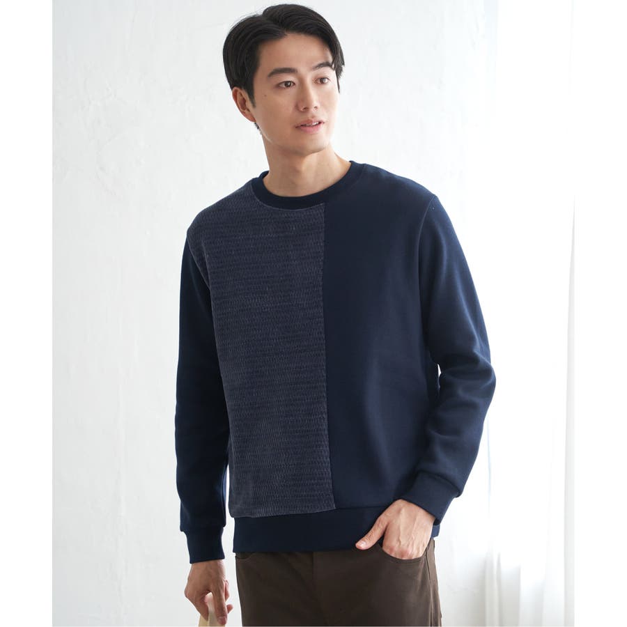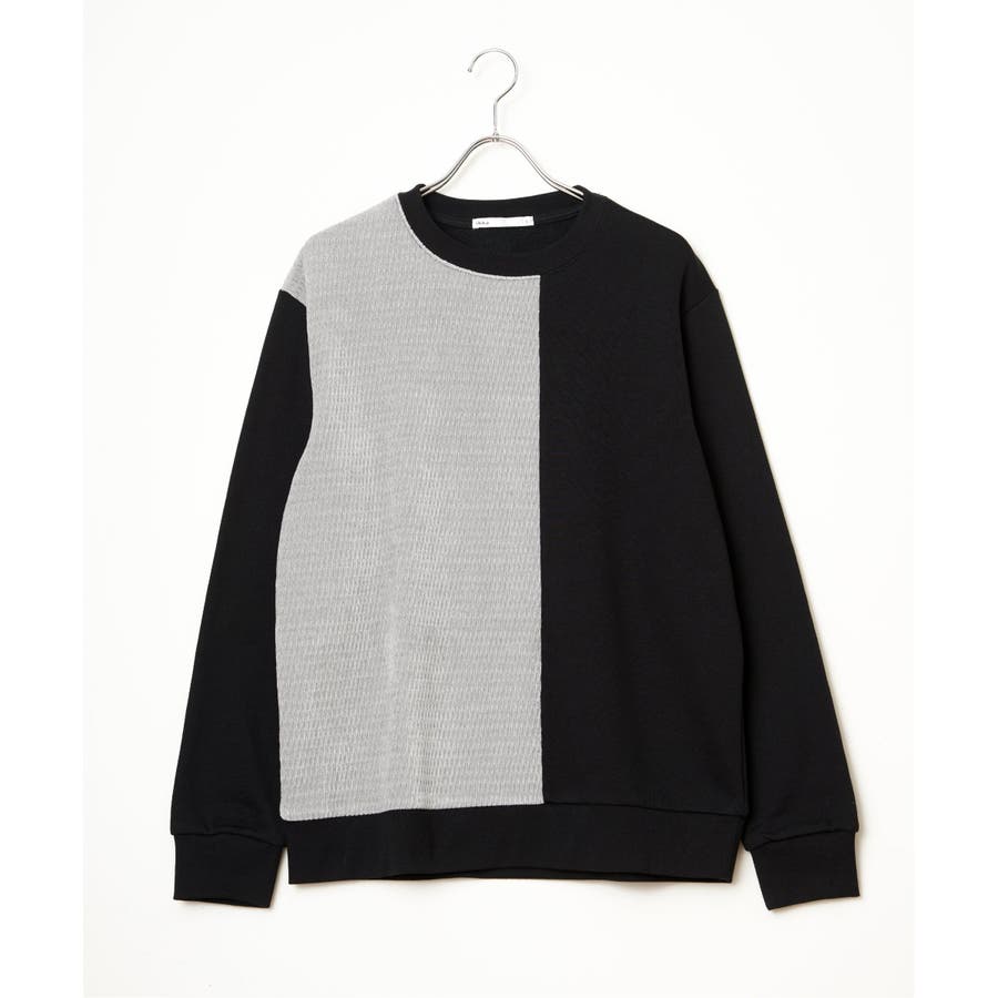 前身頃が異素材切り替えになったクルーネックプルオーバー。