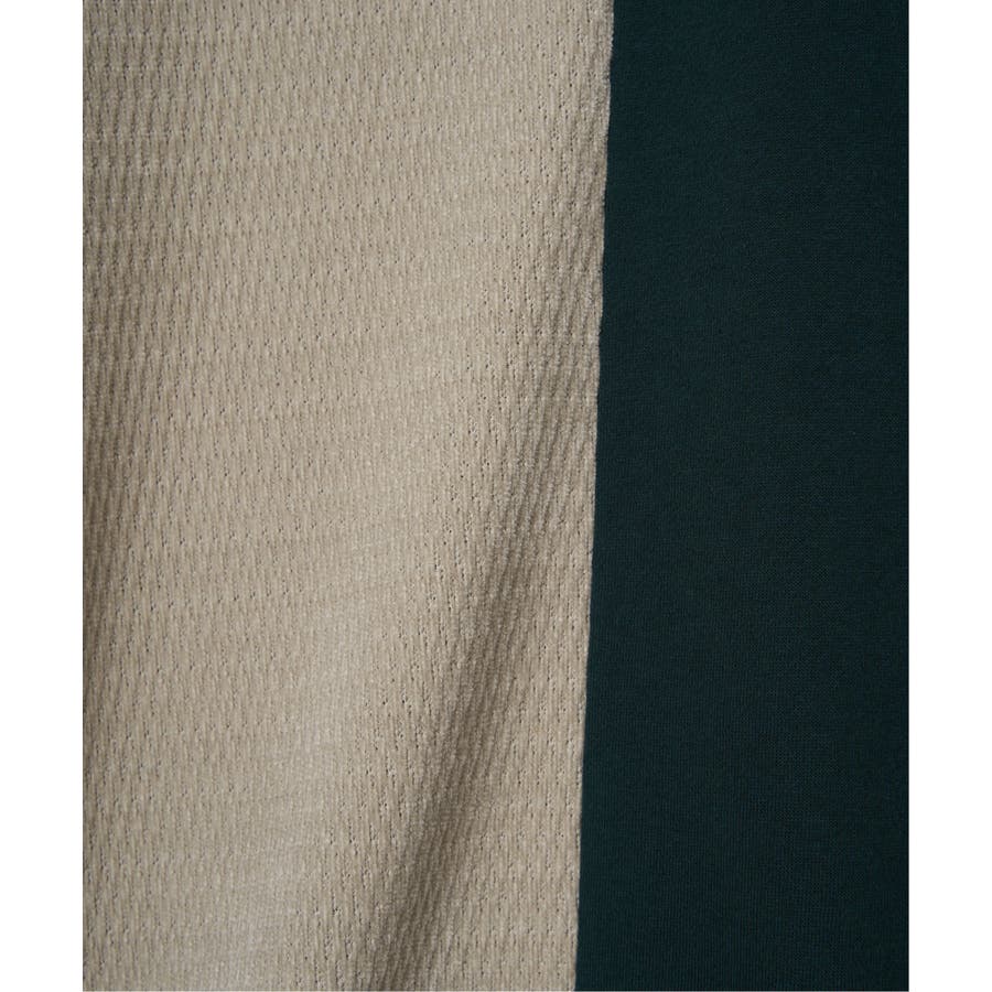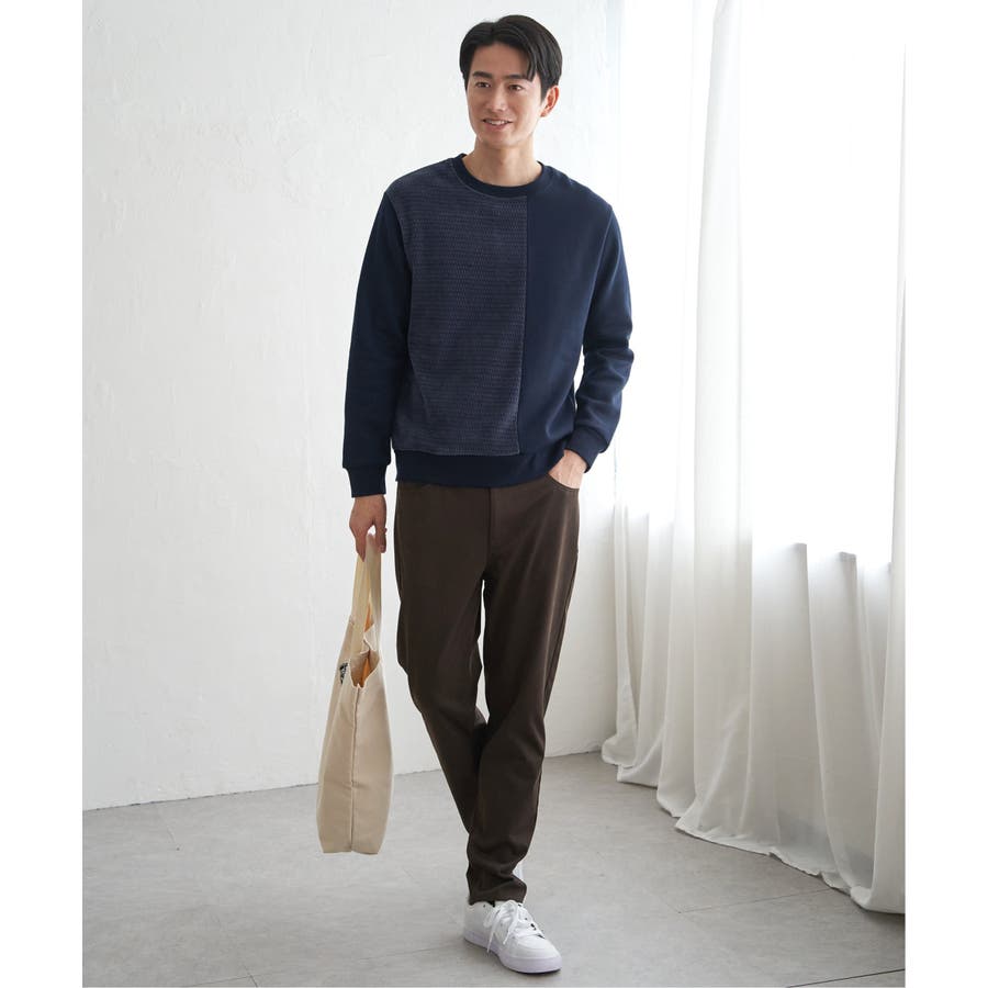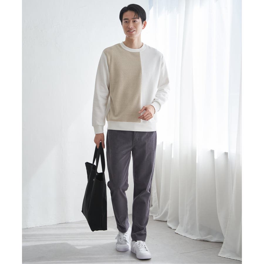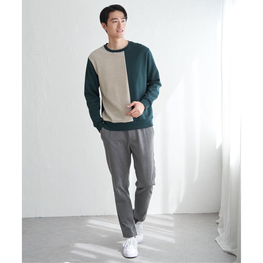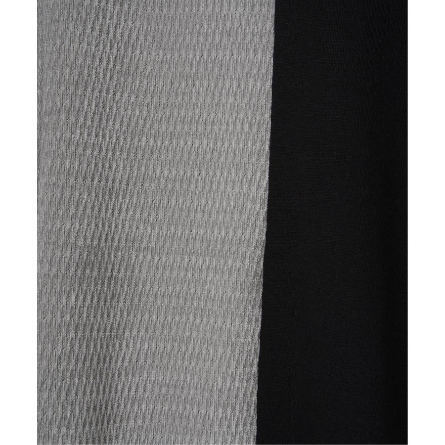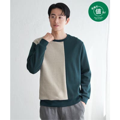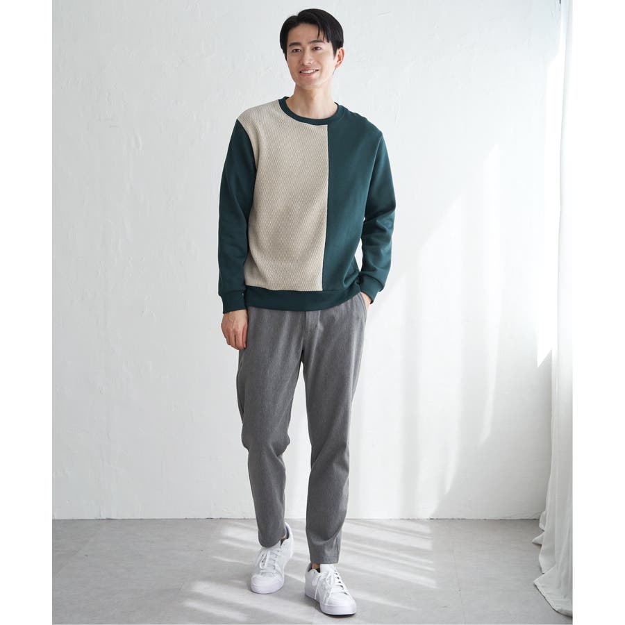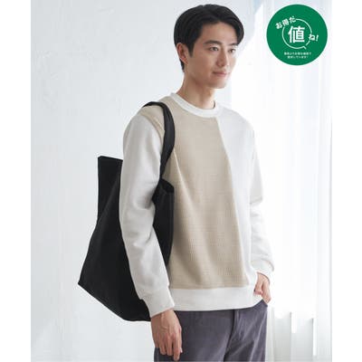 前身頃が異素材切り替えになったクルーネックプルオーバー。