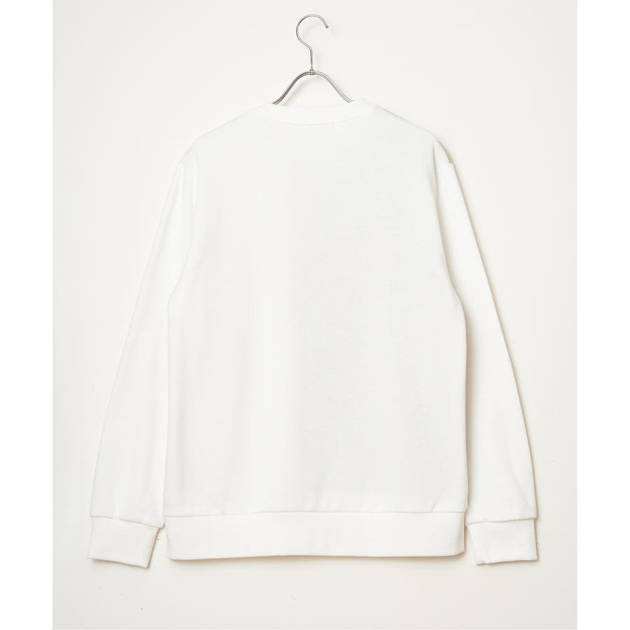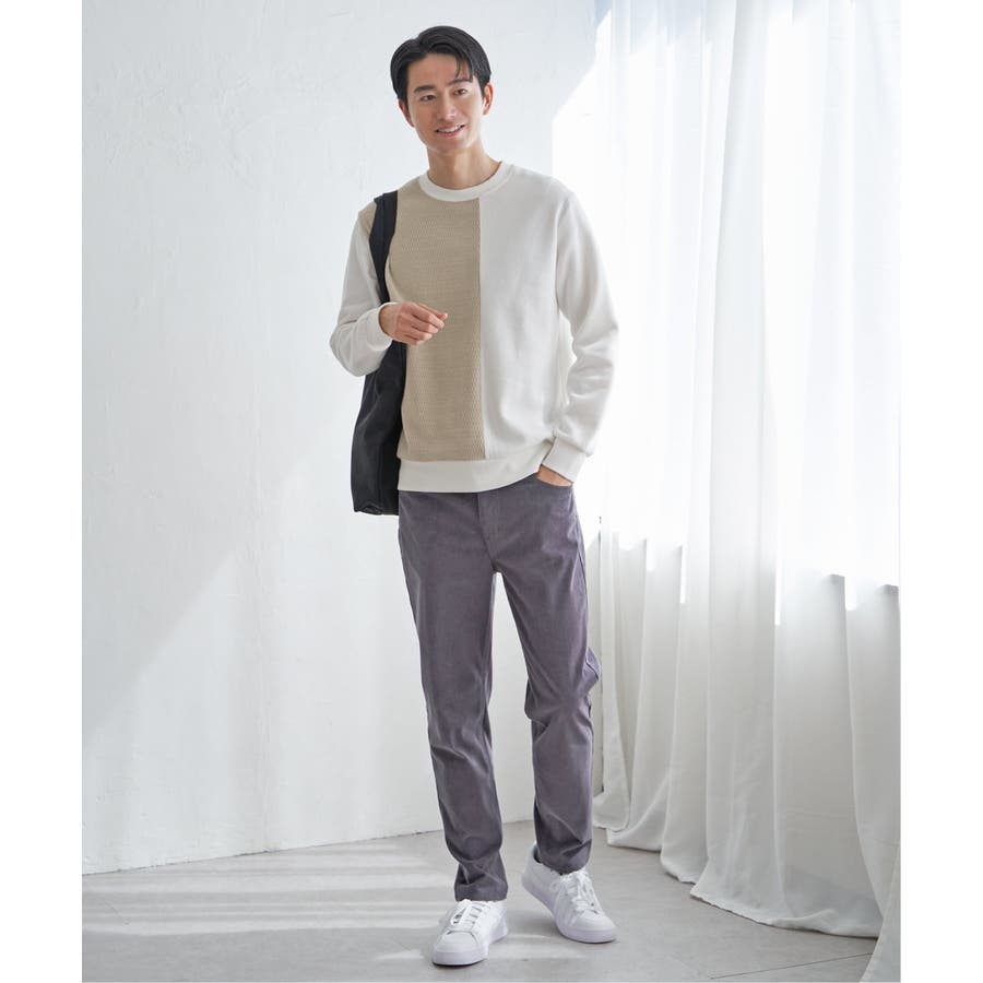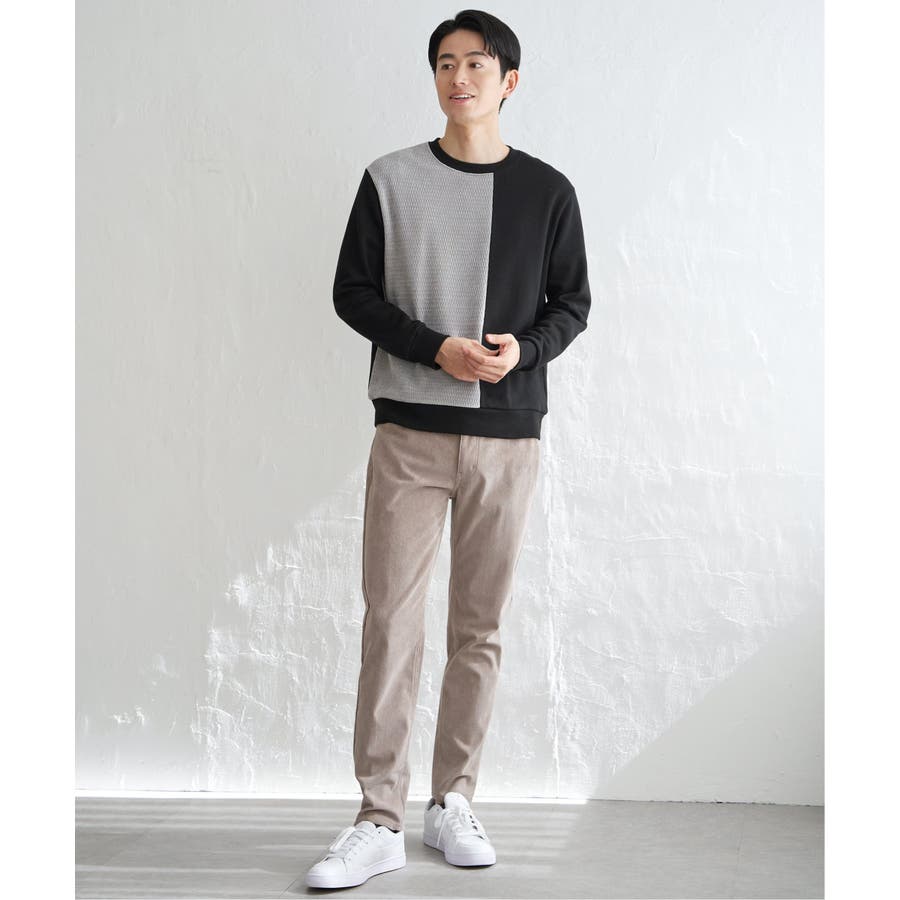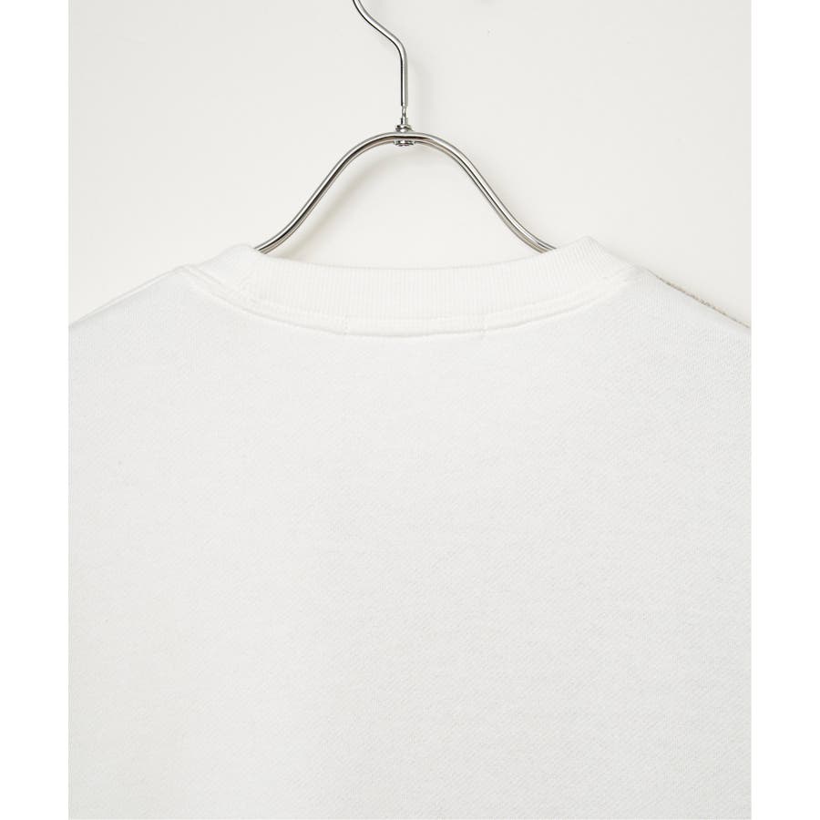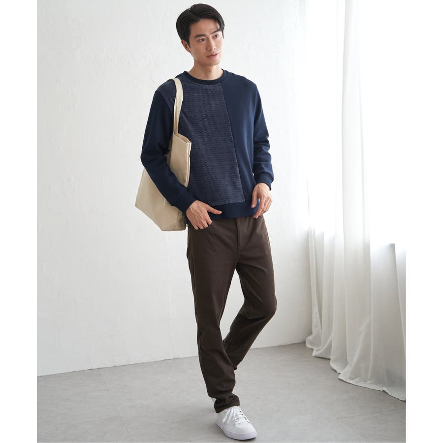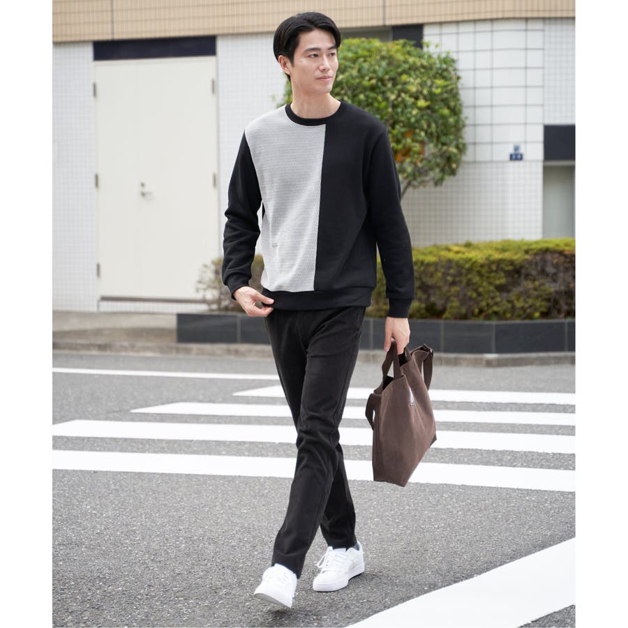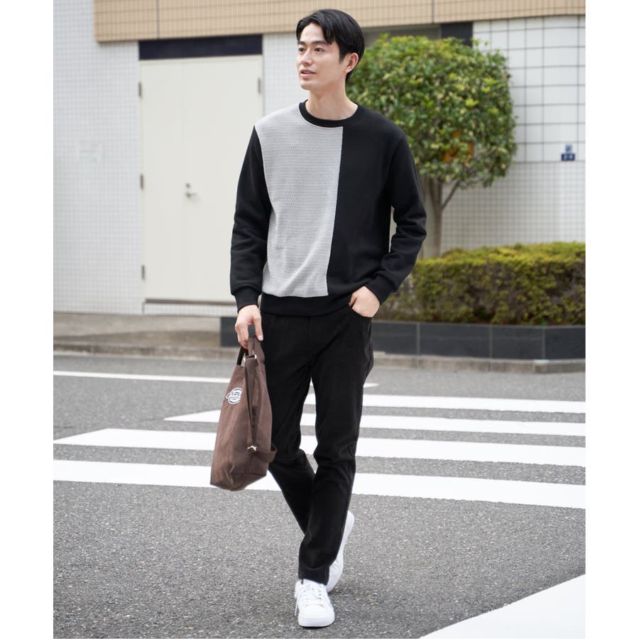 前身頃が異素材切り替えになったクルーネックプルオーバー。