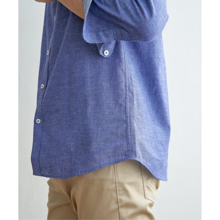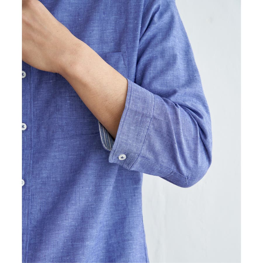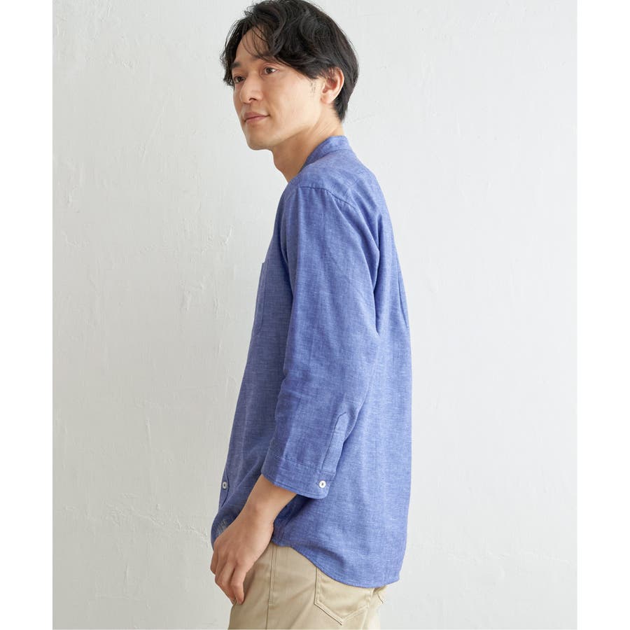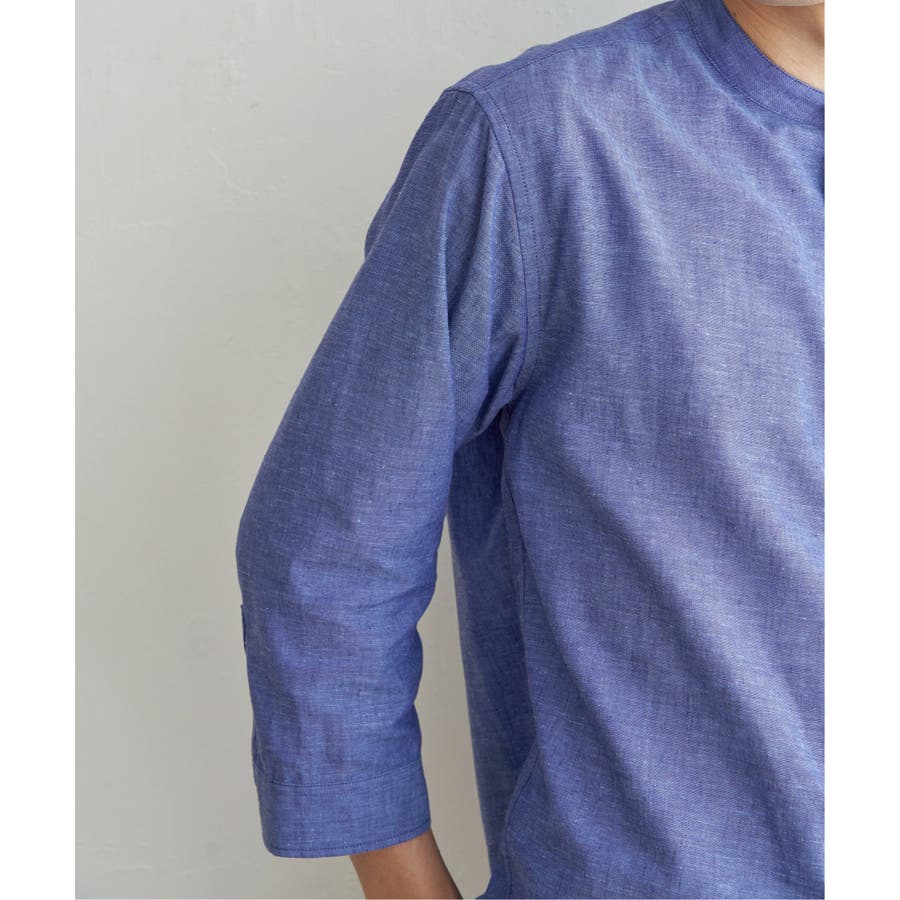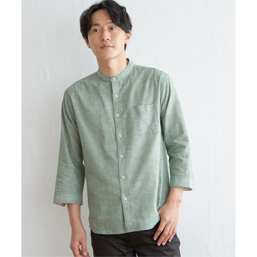 速乾性とイージーケア加工が施された、お手入れ簡単な7分袖バンドカラーリネンシャツ。