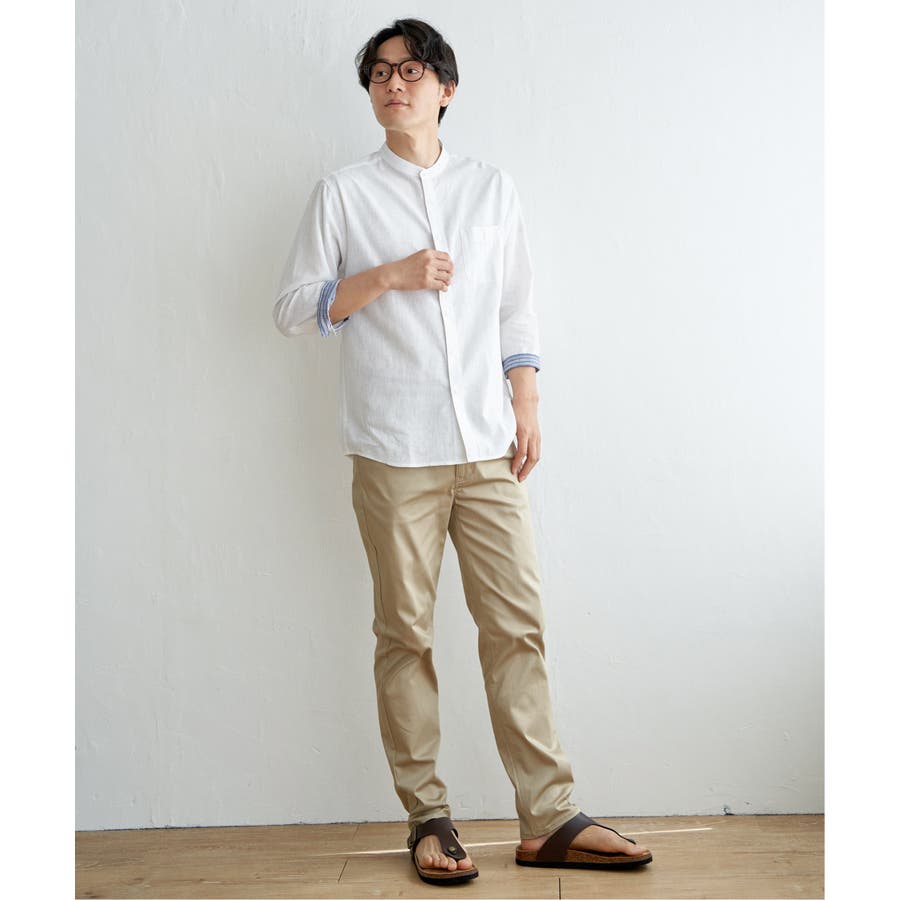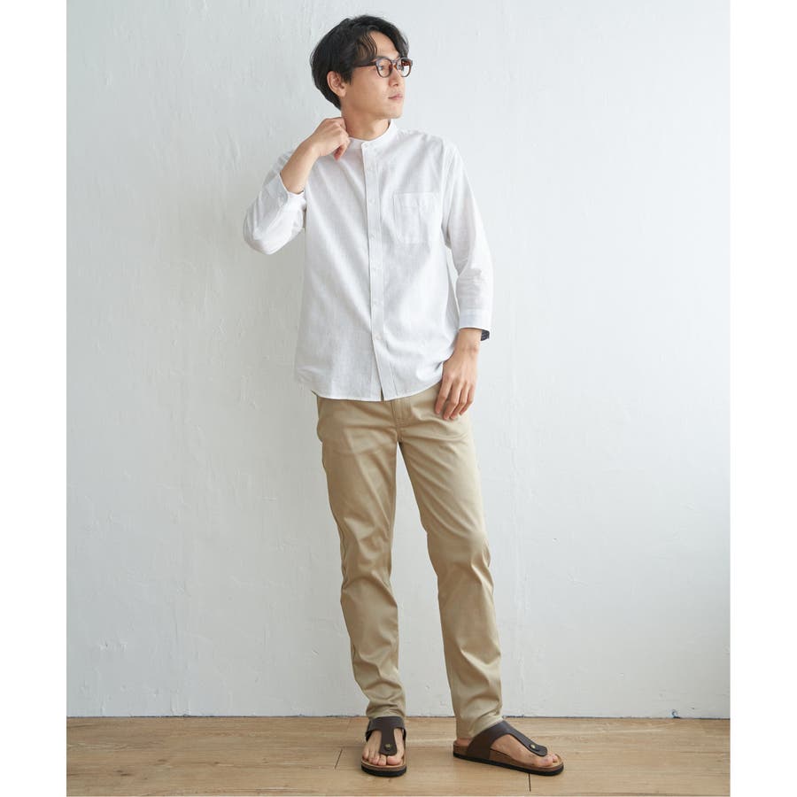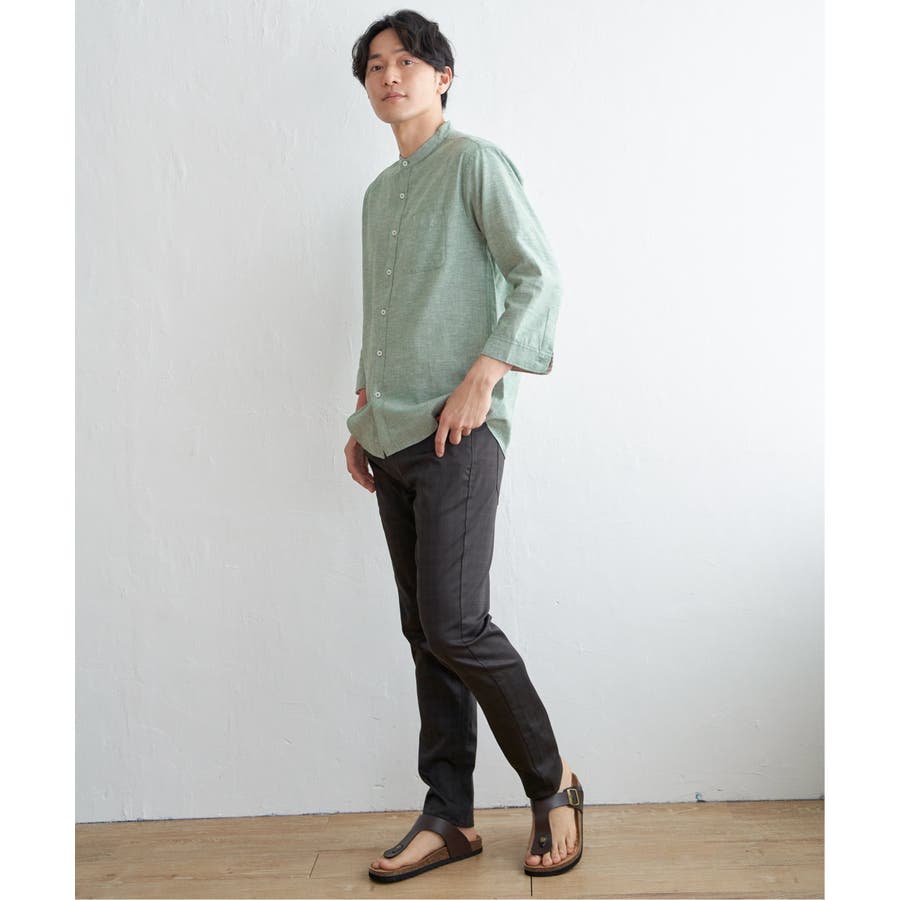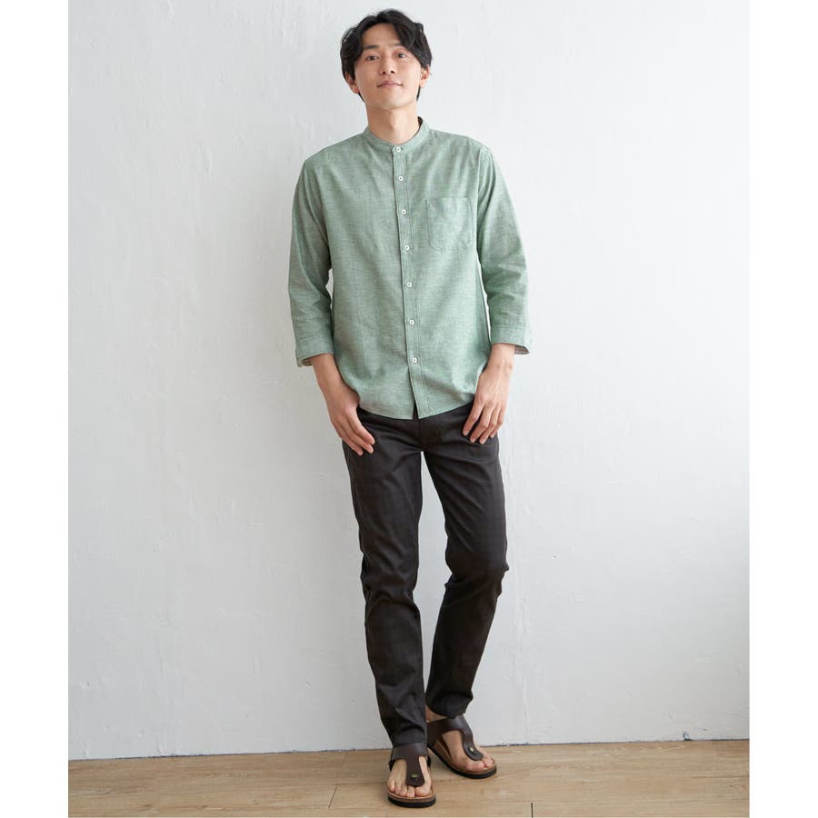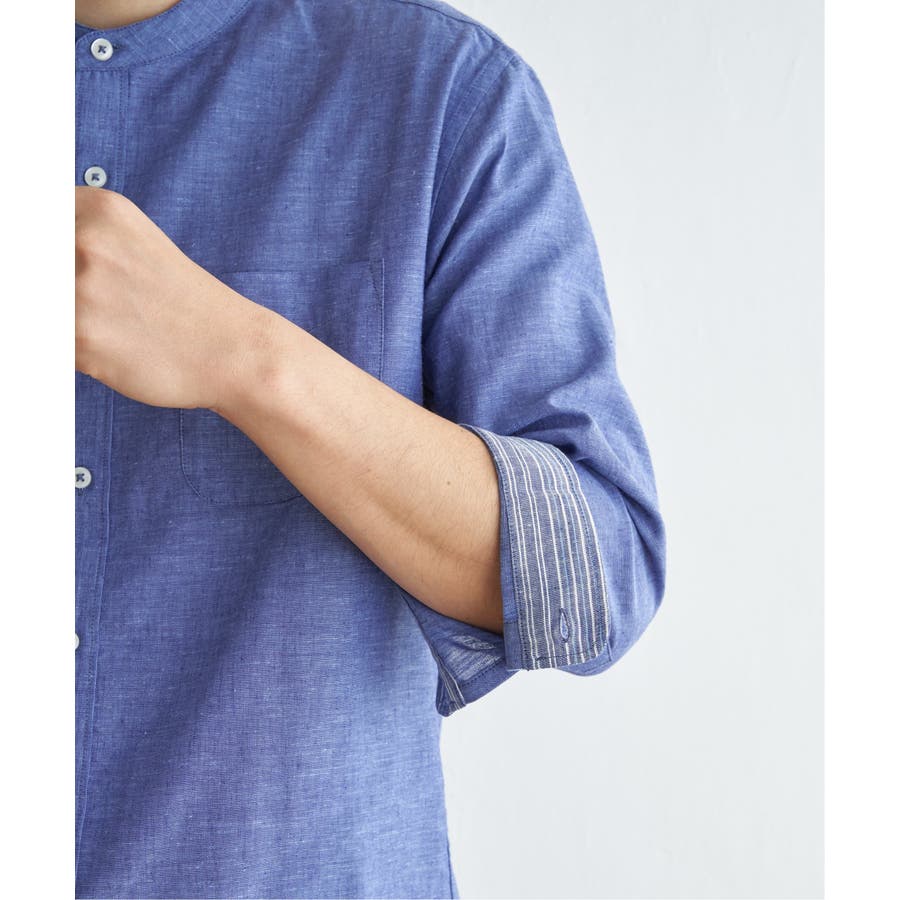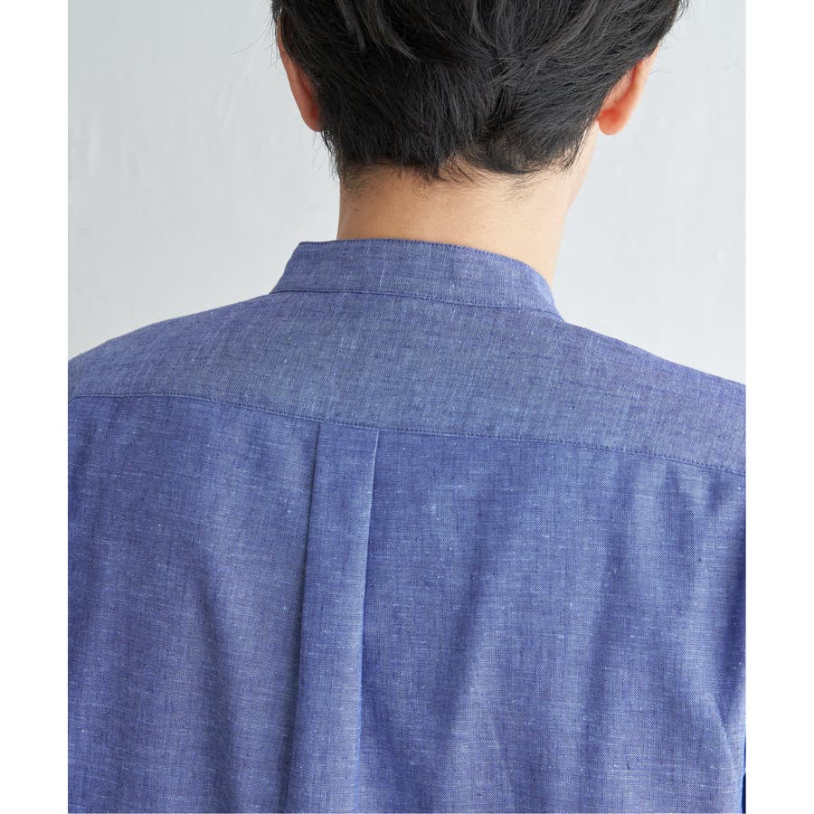 速乾性とイージーケア加工が施された、お手入れ簡単な7分袖バンドカラーリネンシャツ。