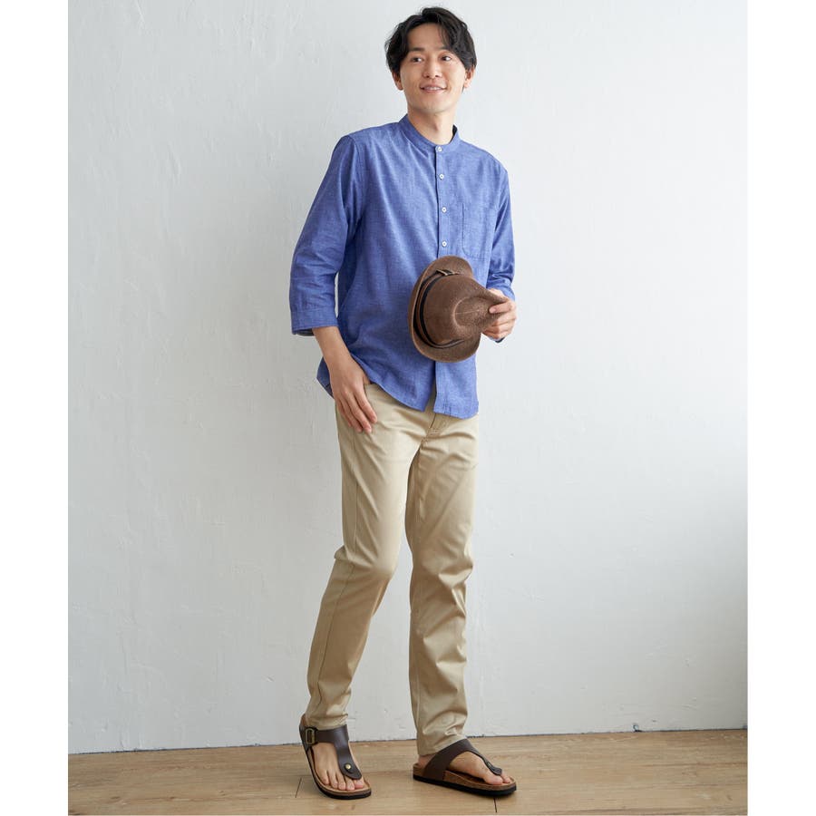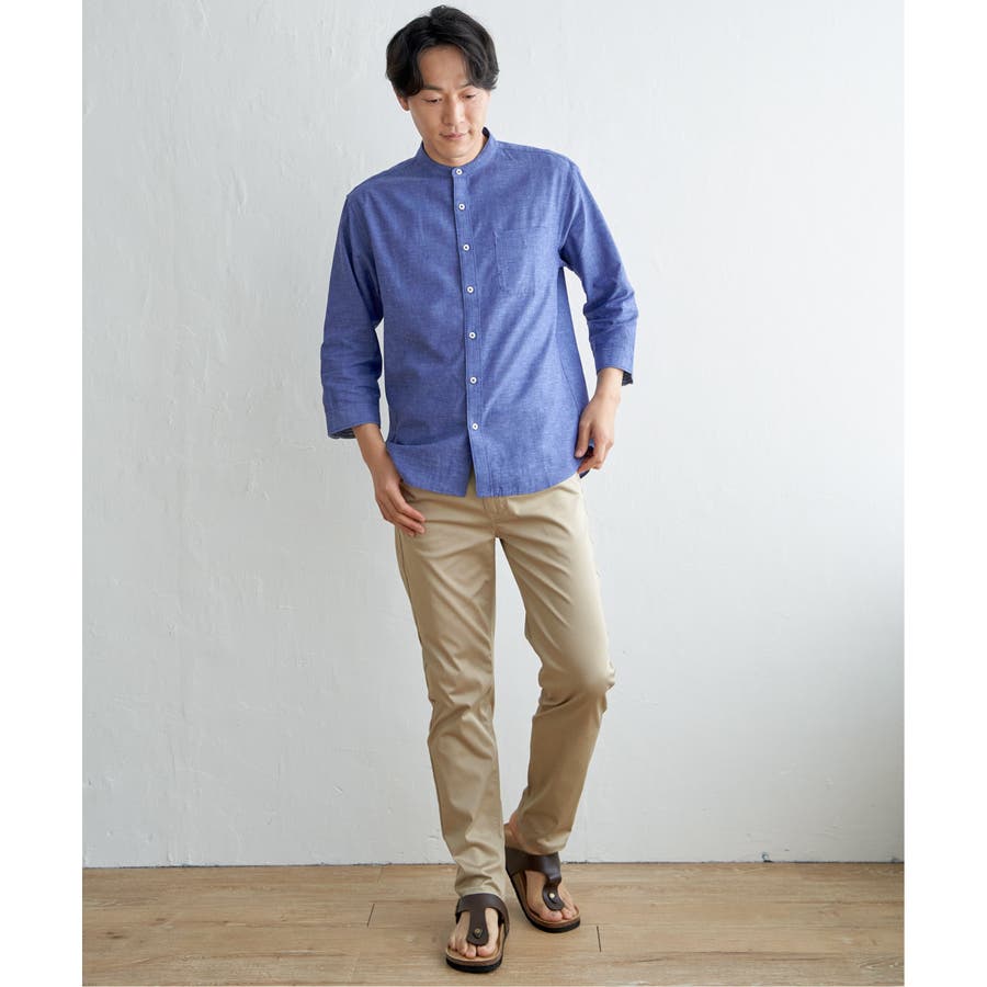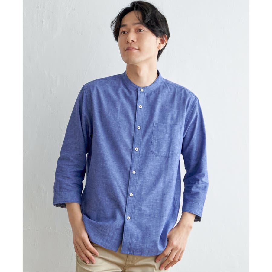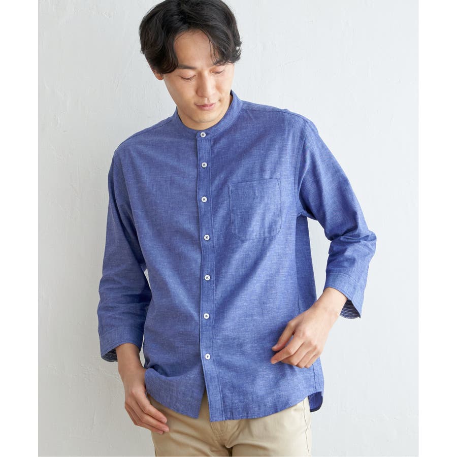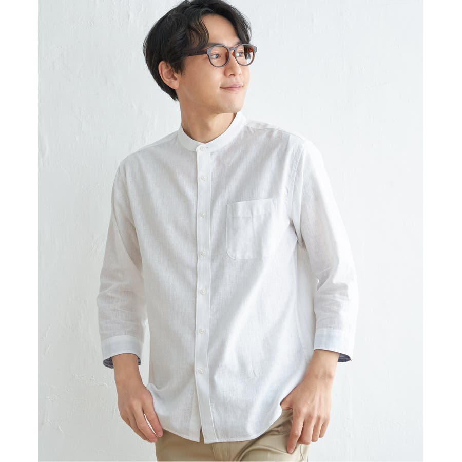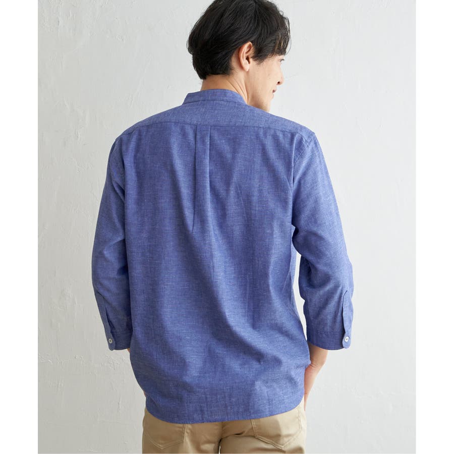 【速乾】7分袖イージーケアリネンバンドカラーシャツ
