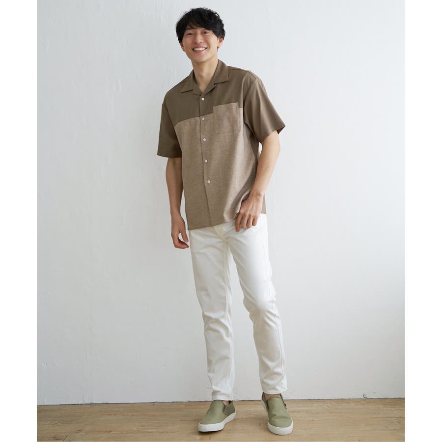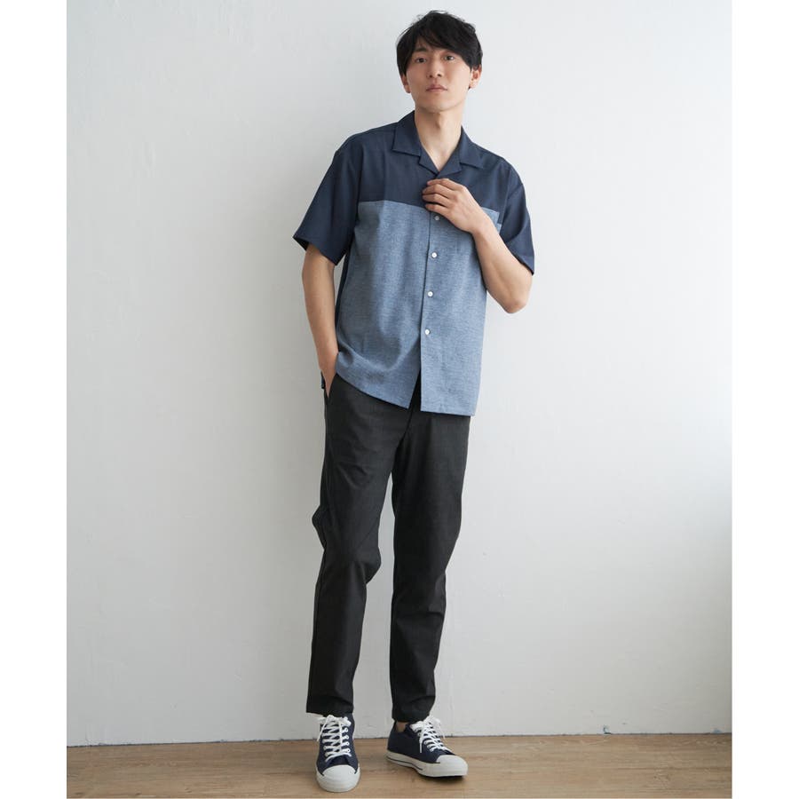バイカラーのオープンカラーシャツは、メインで着る一枚としてはもちろん、Tシャツやタンクトップと合わせる羽織りアレンジも◎
