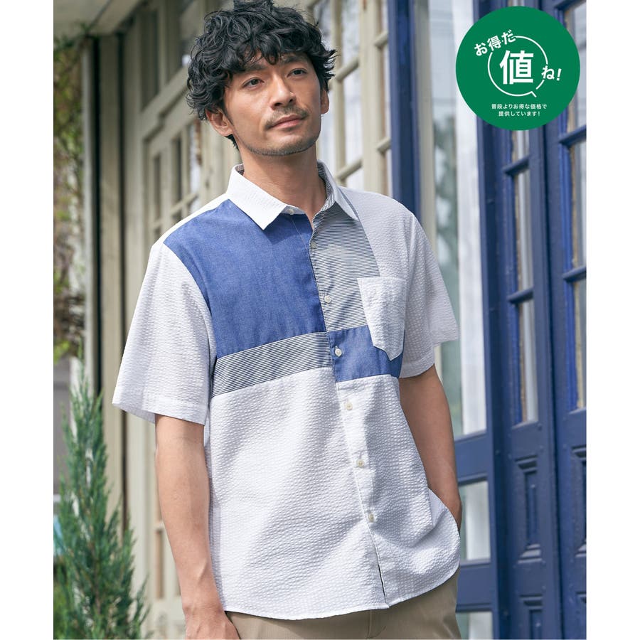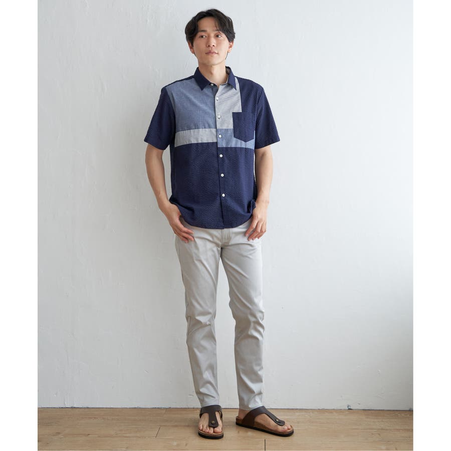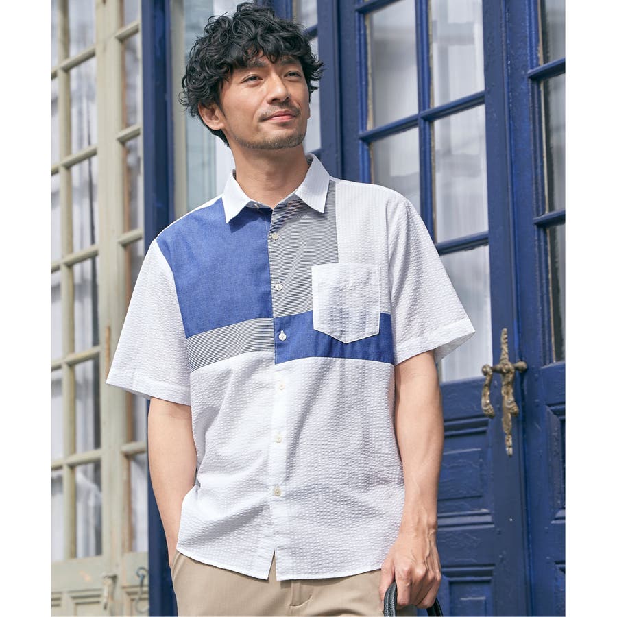 ikka らしい大胆に身頃を切り替えた半袖シャツ。