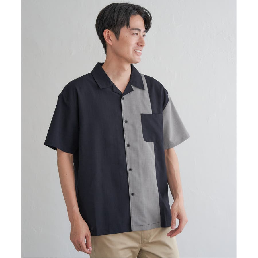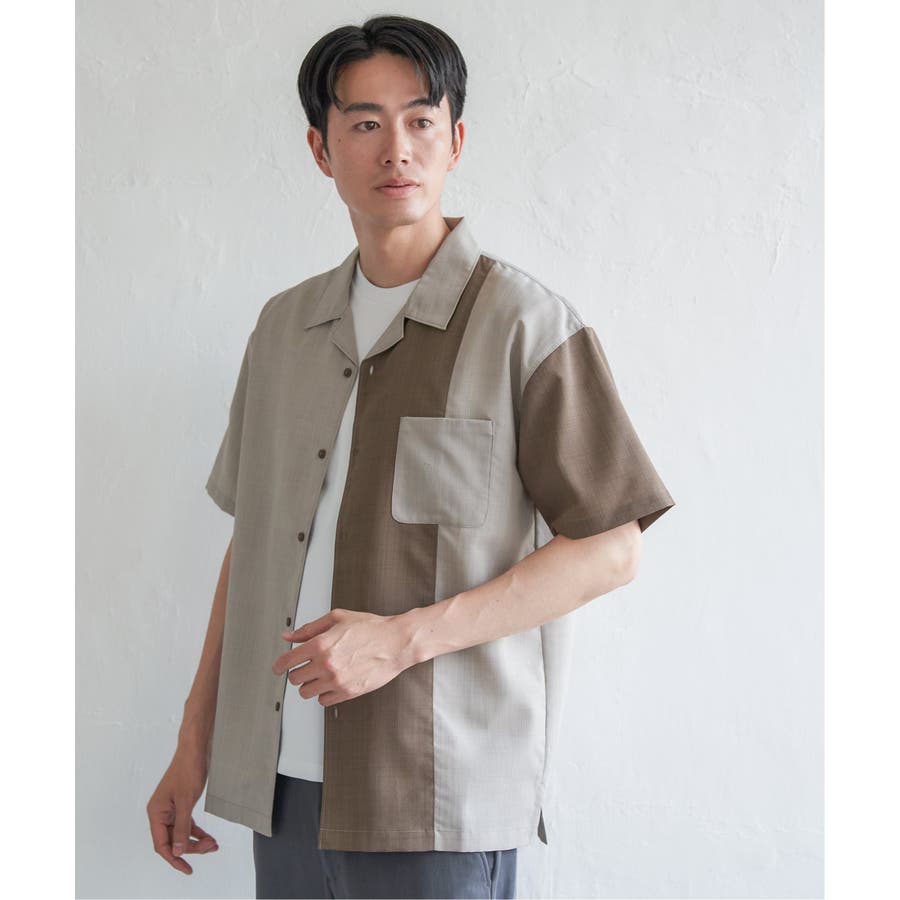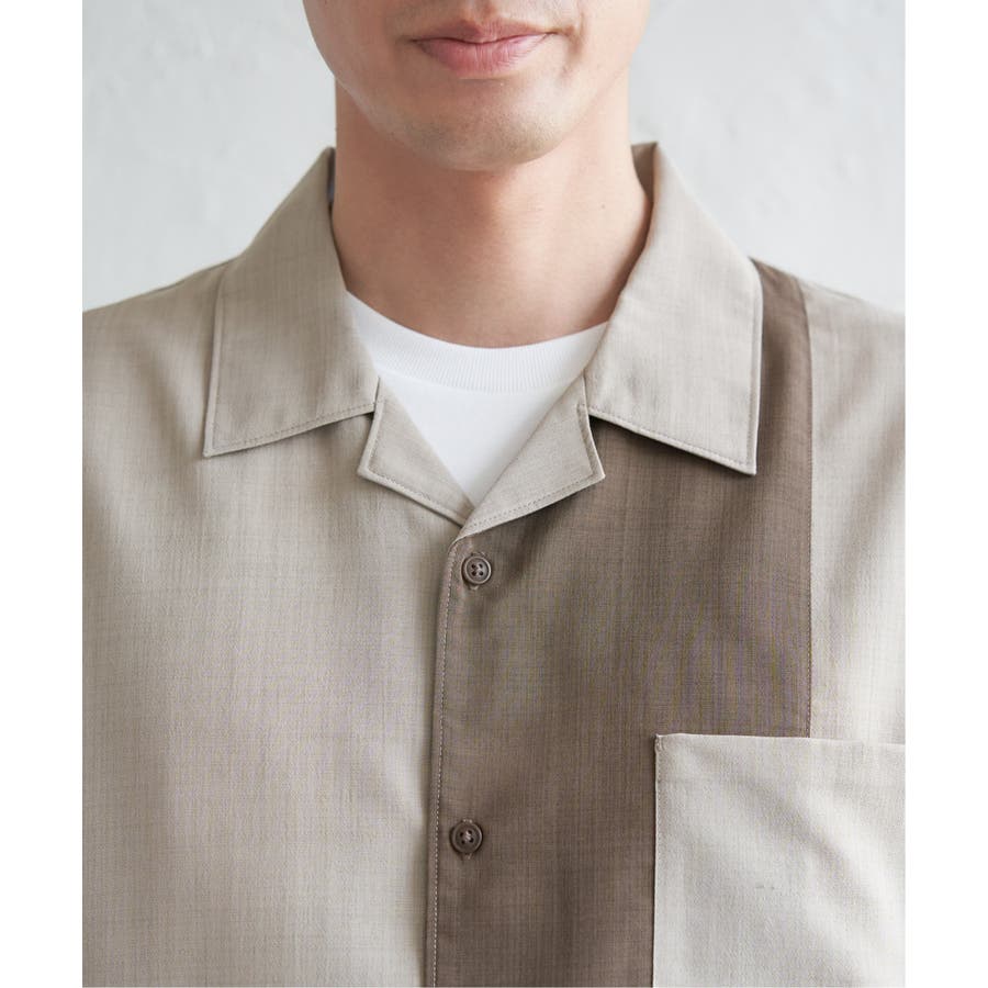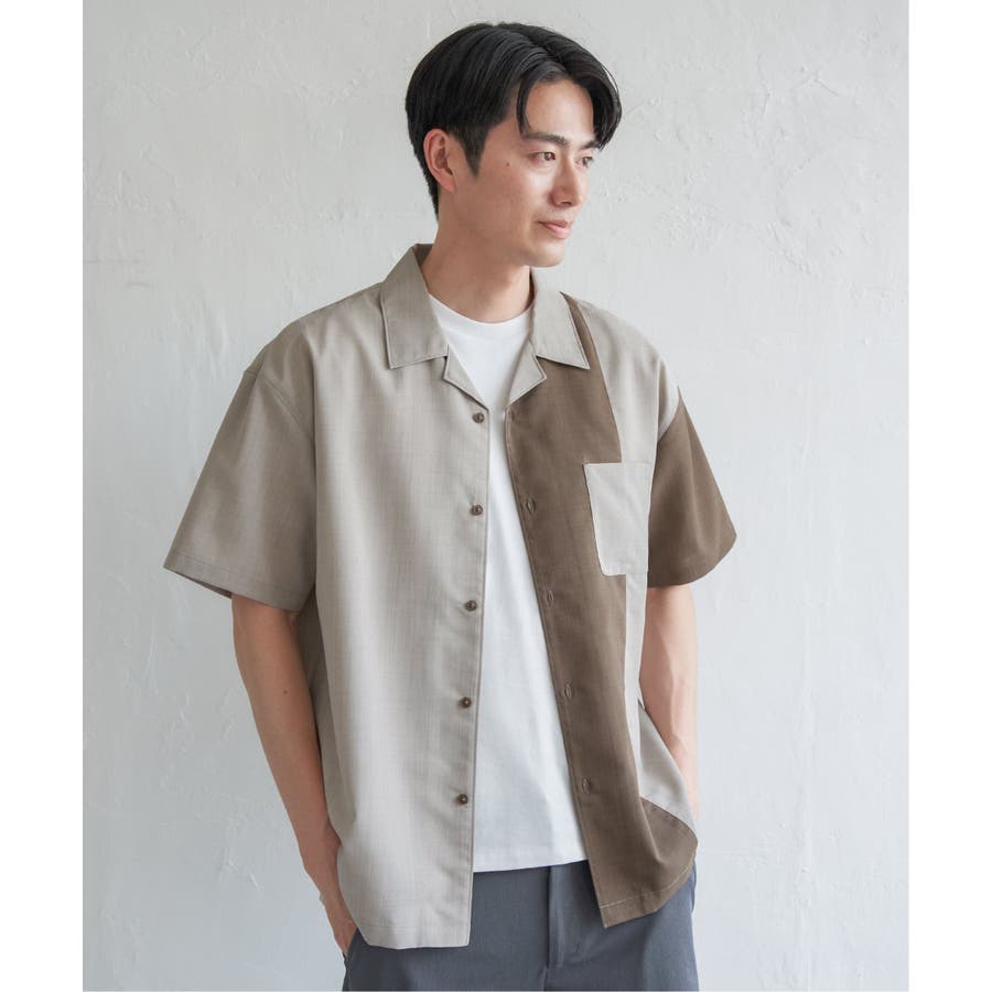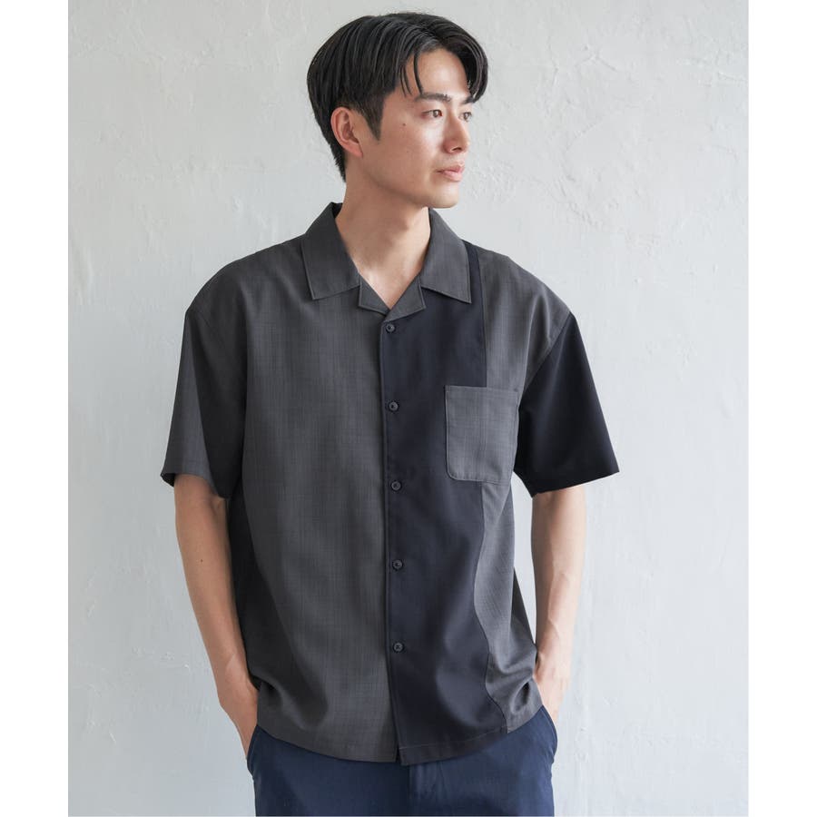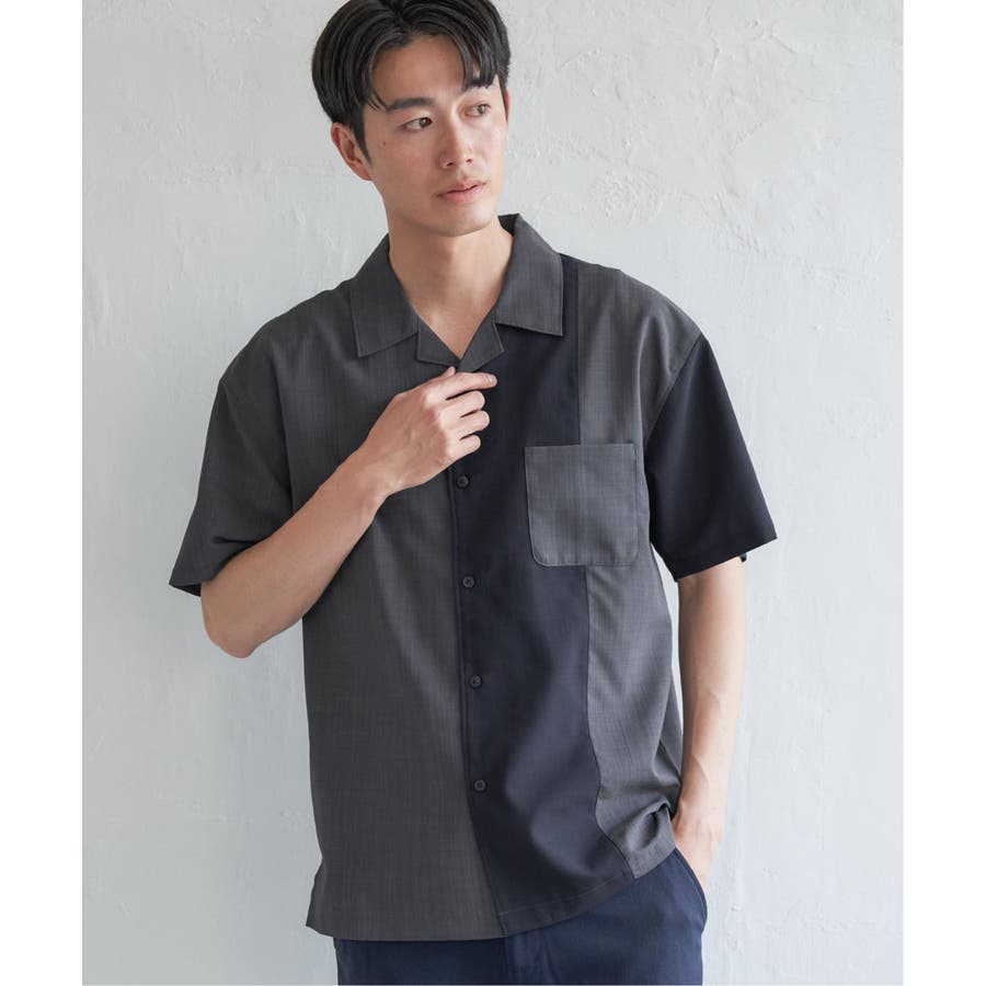 前身頃と左袖を別カラーで大胆に切り替えたオープンカラーシャツ。