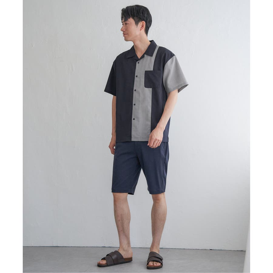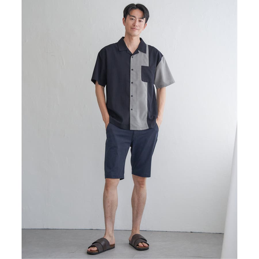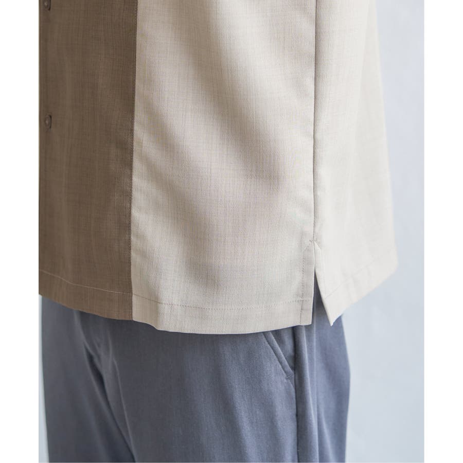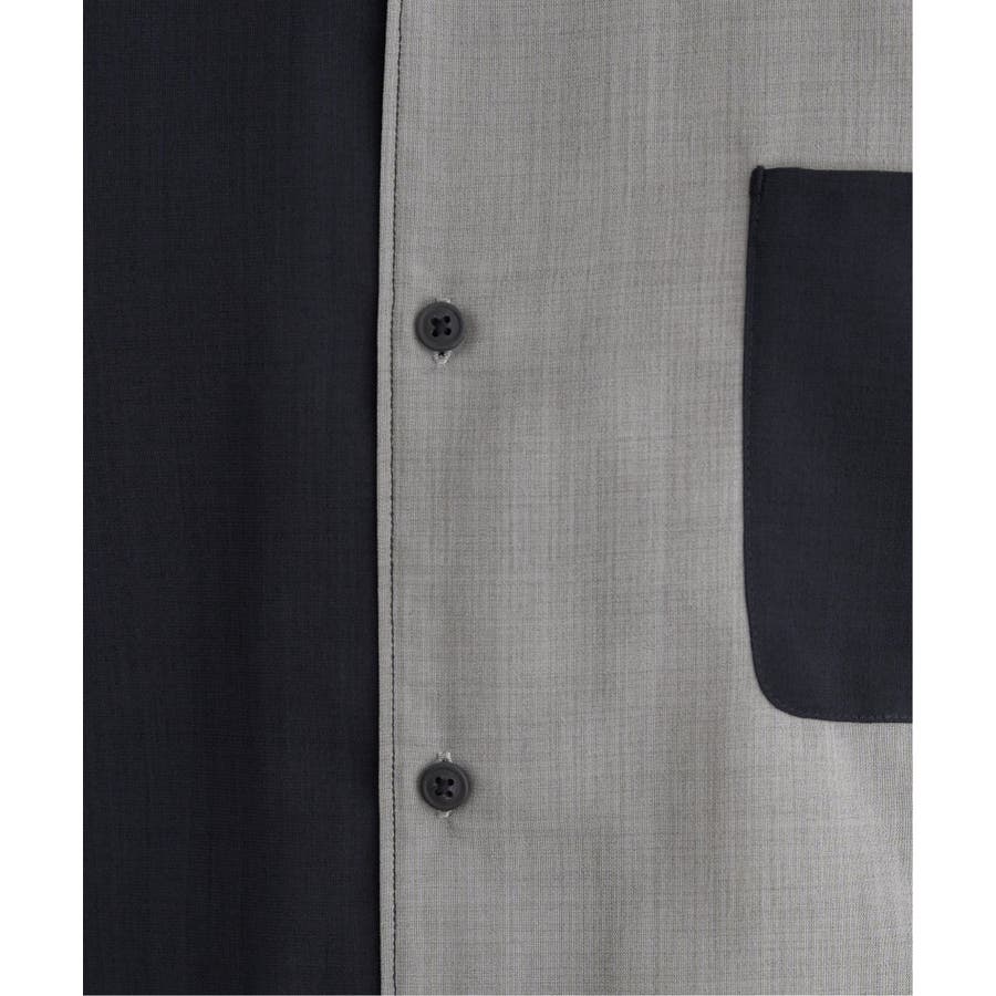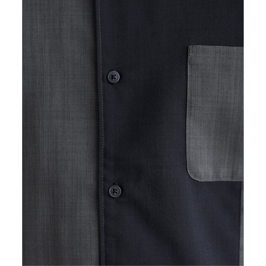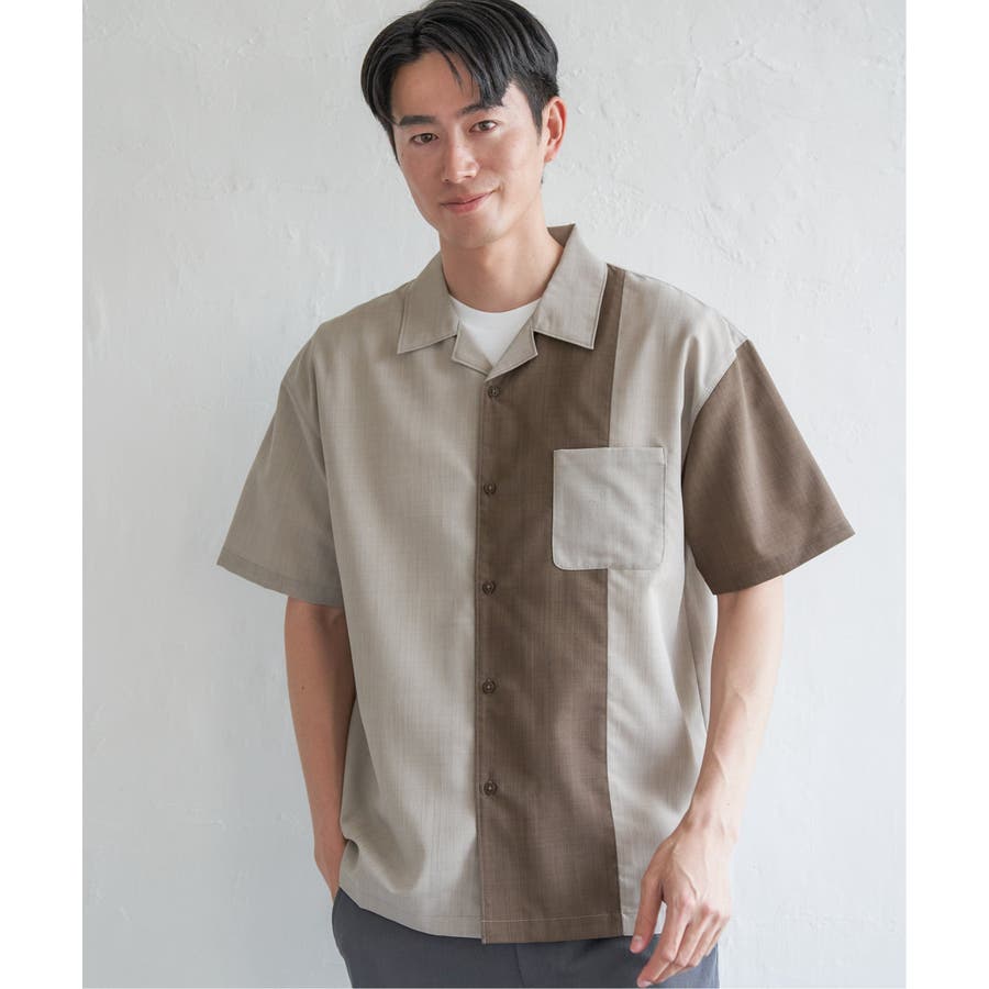 前身頃と左袖を別カラーで大胆に切り替えたオープンカラーシャツ。