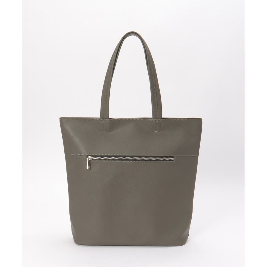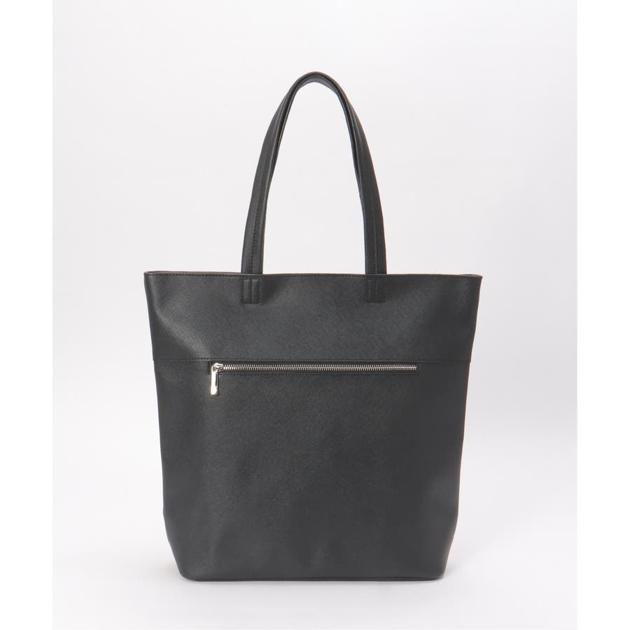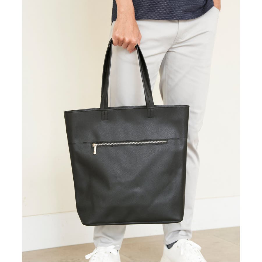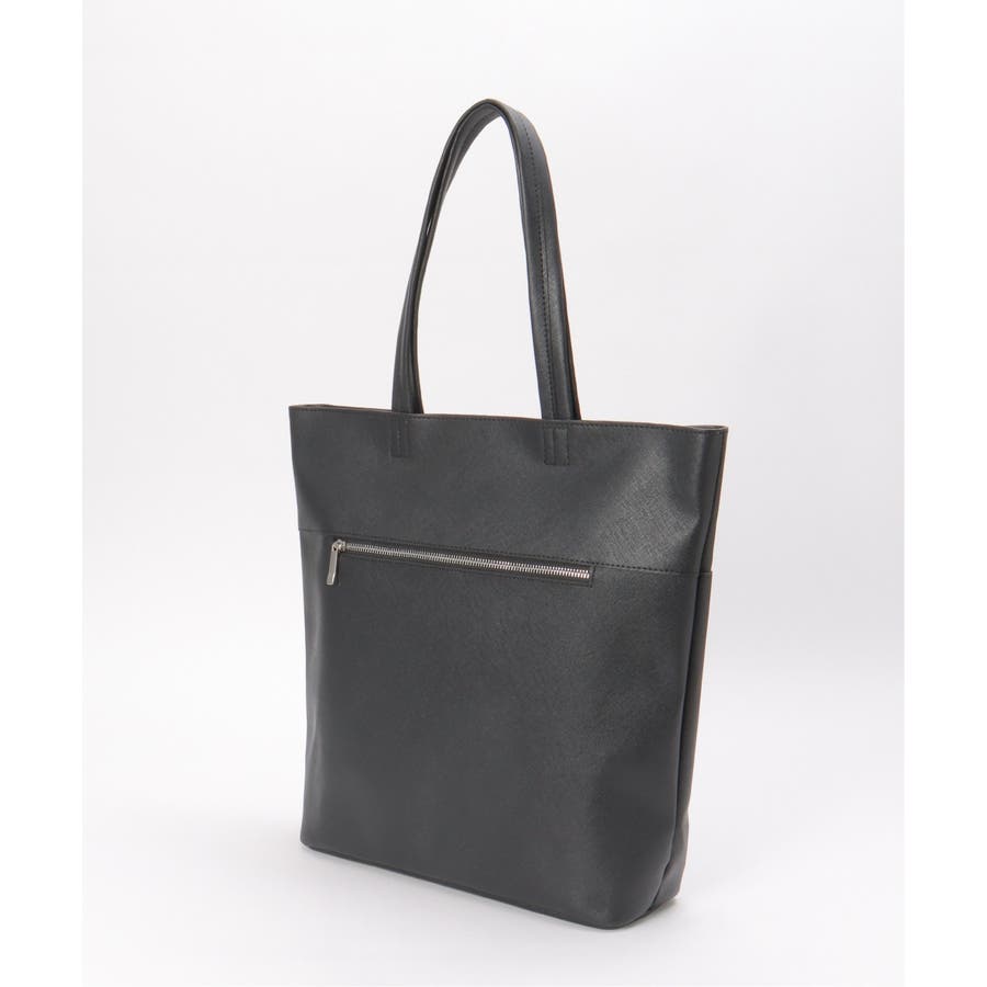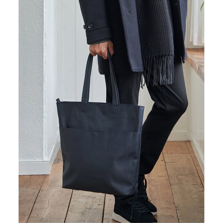 フロントに金属ファスナーを配した、高見え感のあるキレイめ縦型合皮トート。