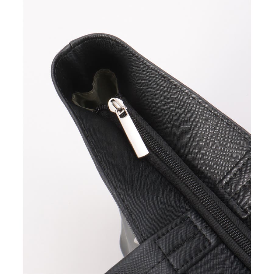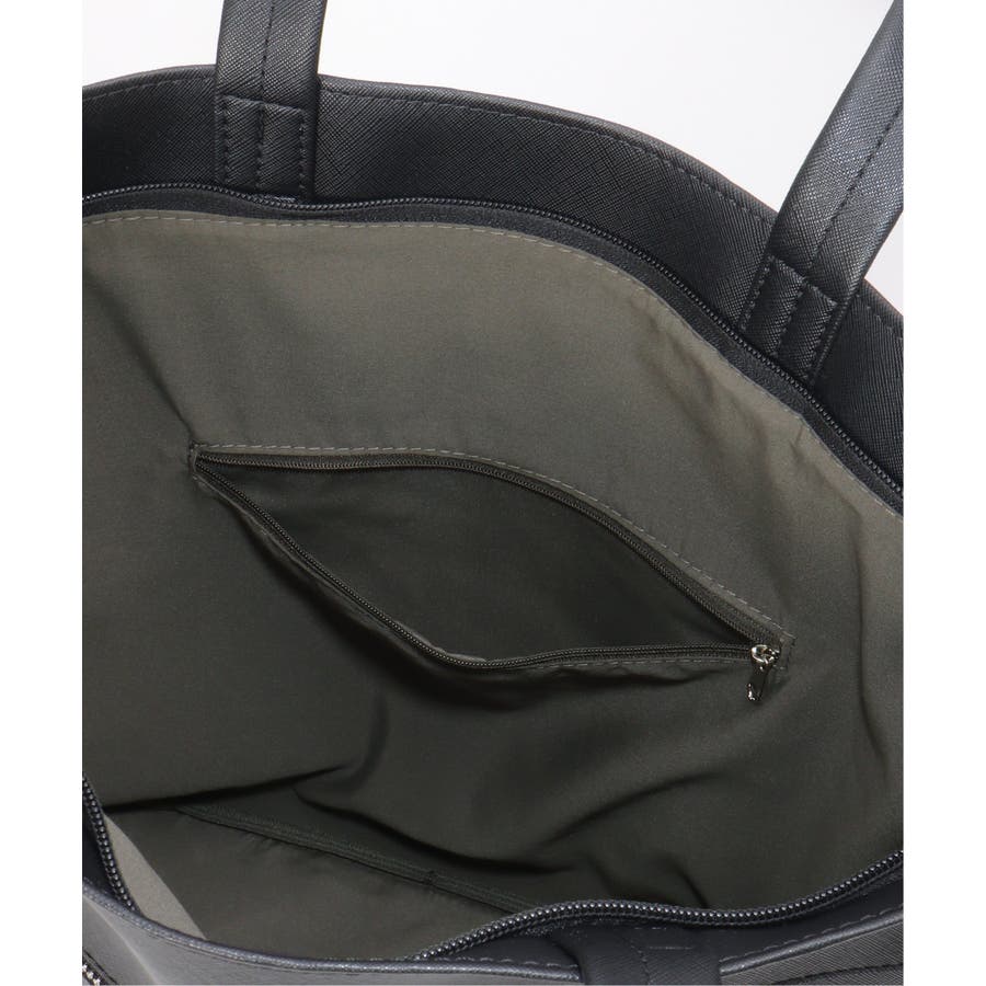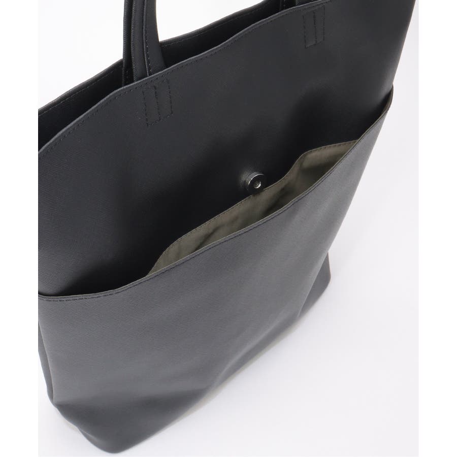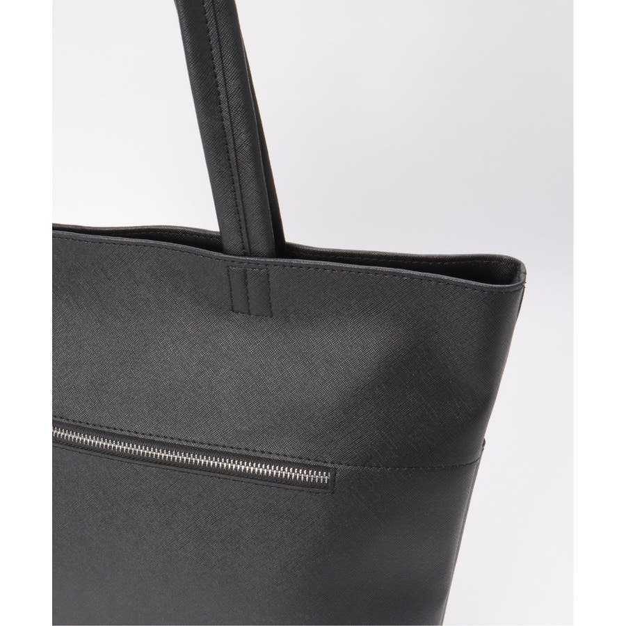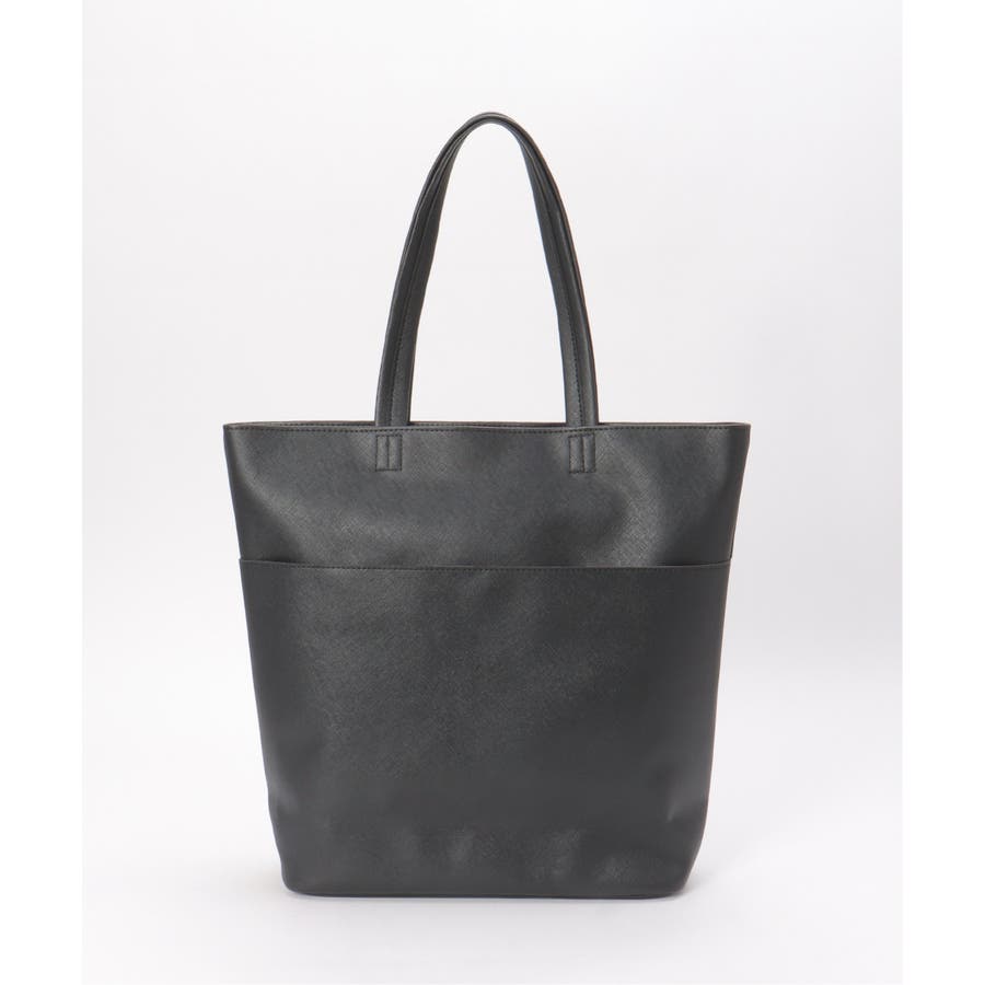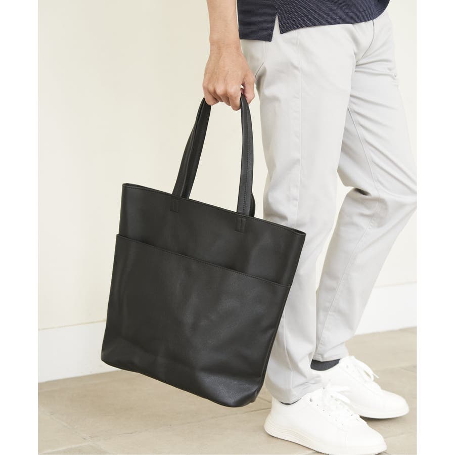 フロントに金属ファスナーを配した、高見え感のあるキレイめ縦型合皮トート。