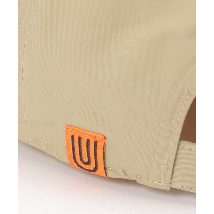 同色刺?のタイプライターロゴ、側面にワンポイントのオレンジピスネーム、ユニセックスで使えるクリーンデザイン、軽量でオールシーズン被れる。