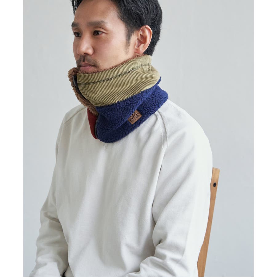 コーデュロイ・ボア・フリースの異素材をバランスよく組み合わせた、表情豊かな切り替えネックウォーマー。