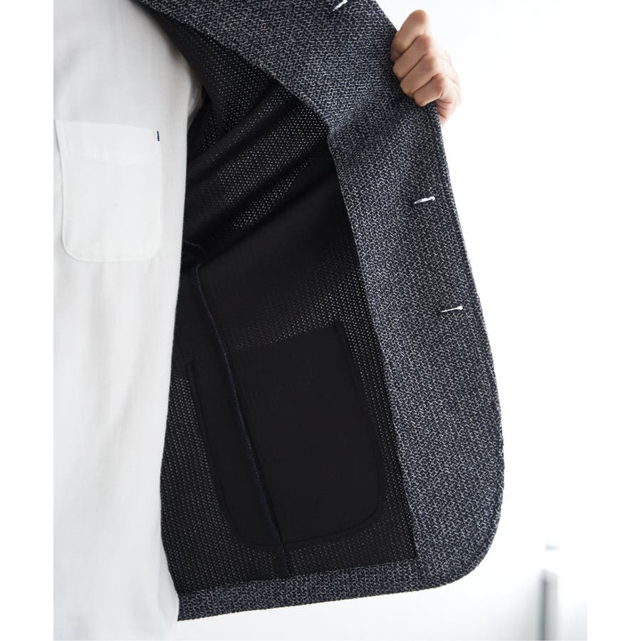 首回りがすっきりしたスタンド襟のジャケット。