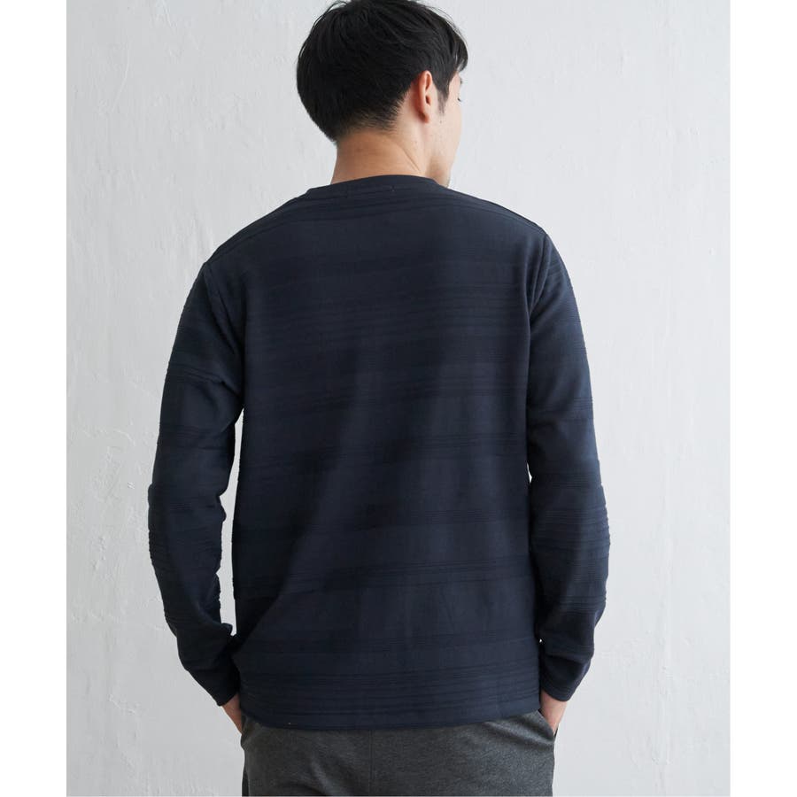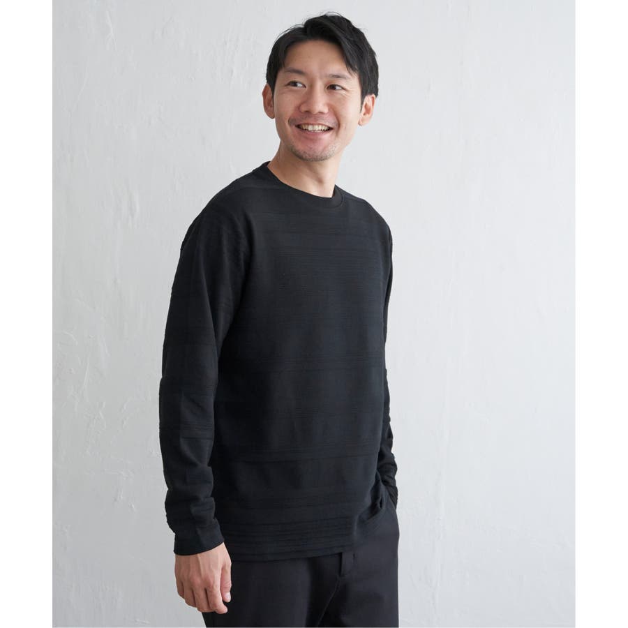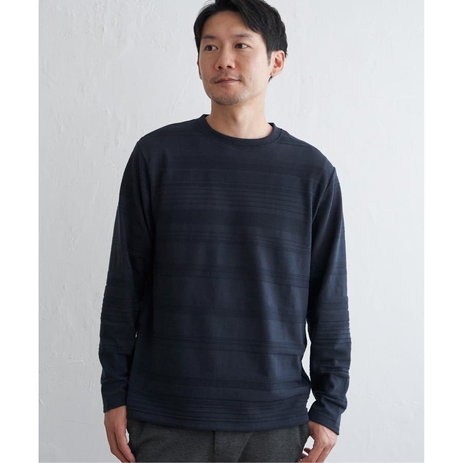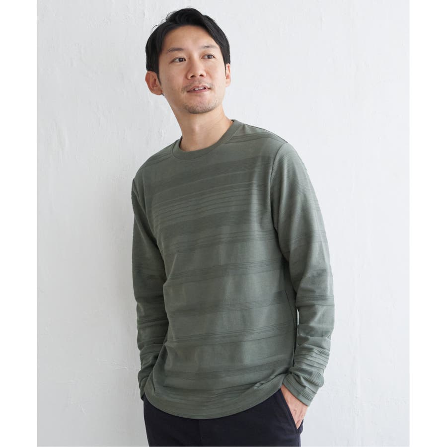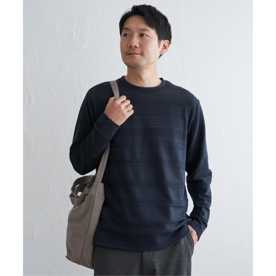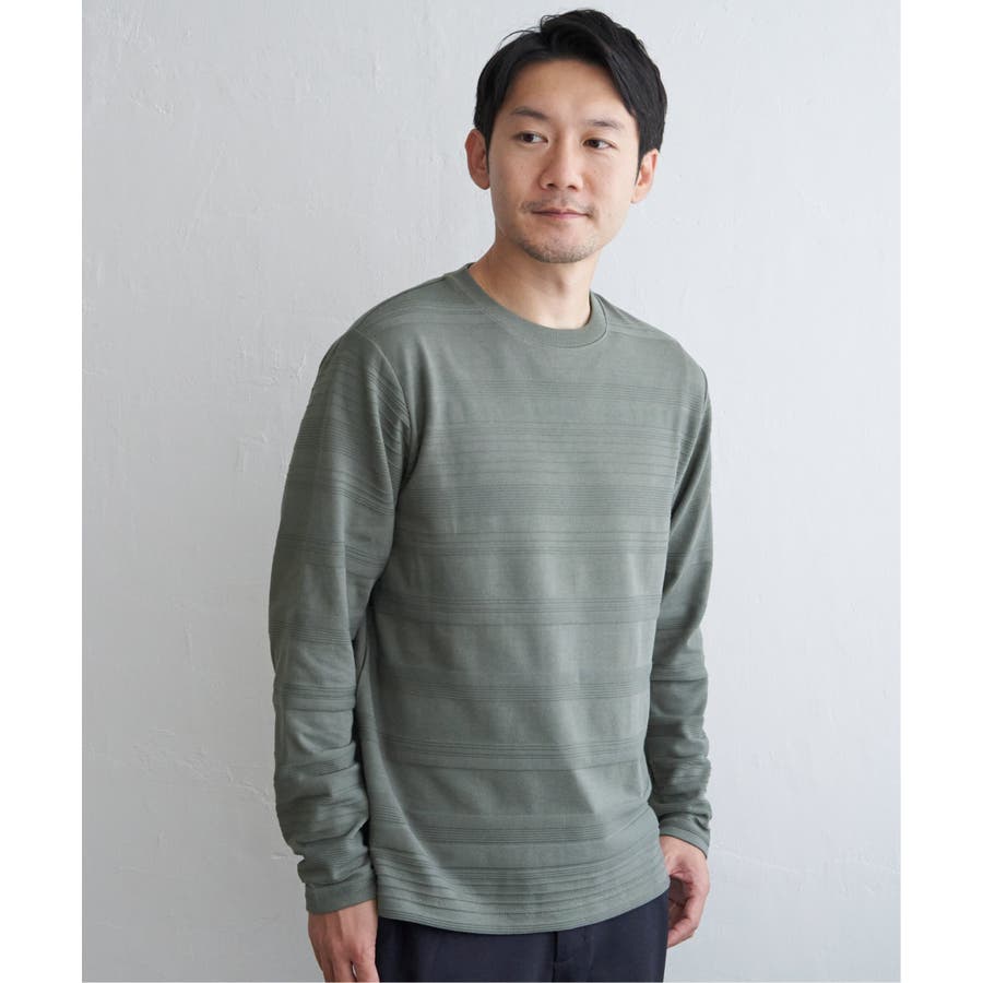 シンプルな長袖のクルーネックTシャツですが、生地の表面に凹凸のある地柄のランダムボーダーが特徴です。