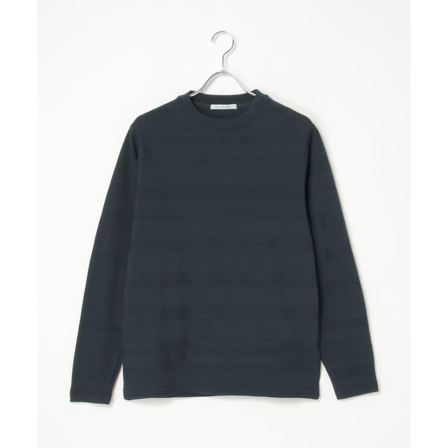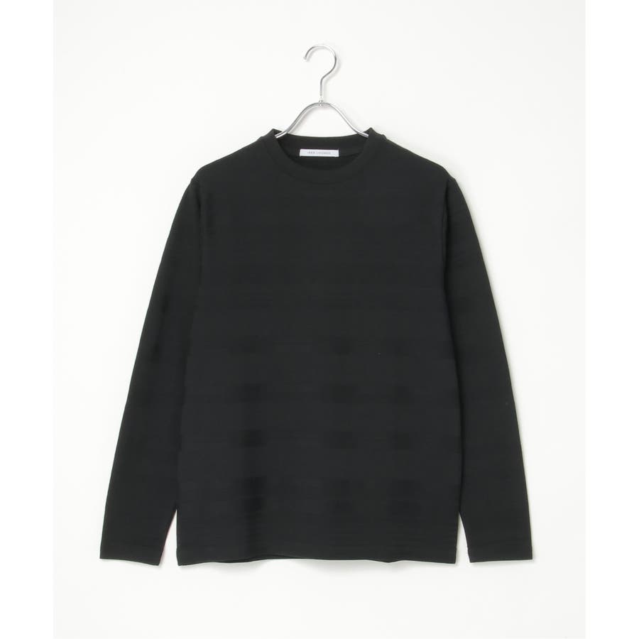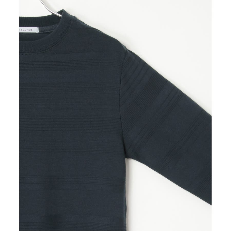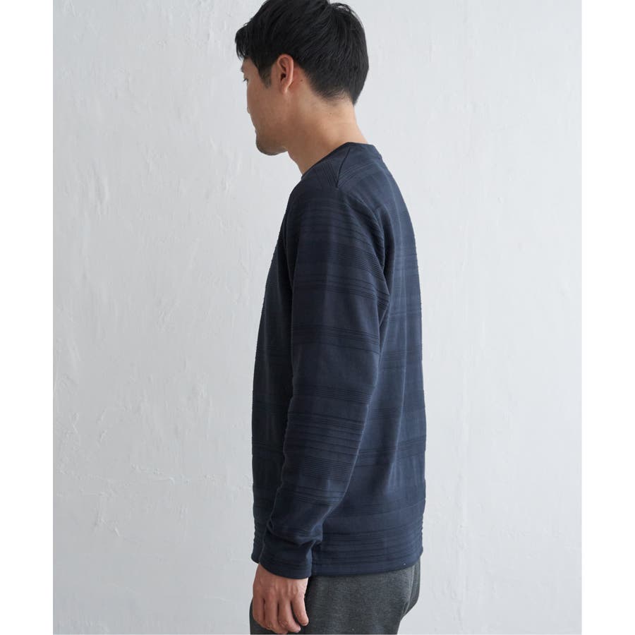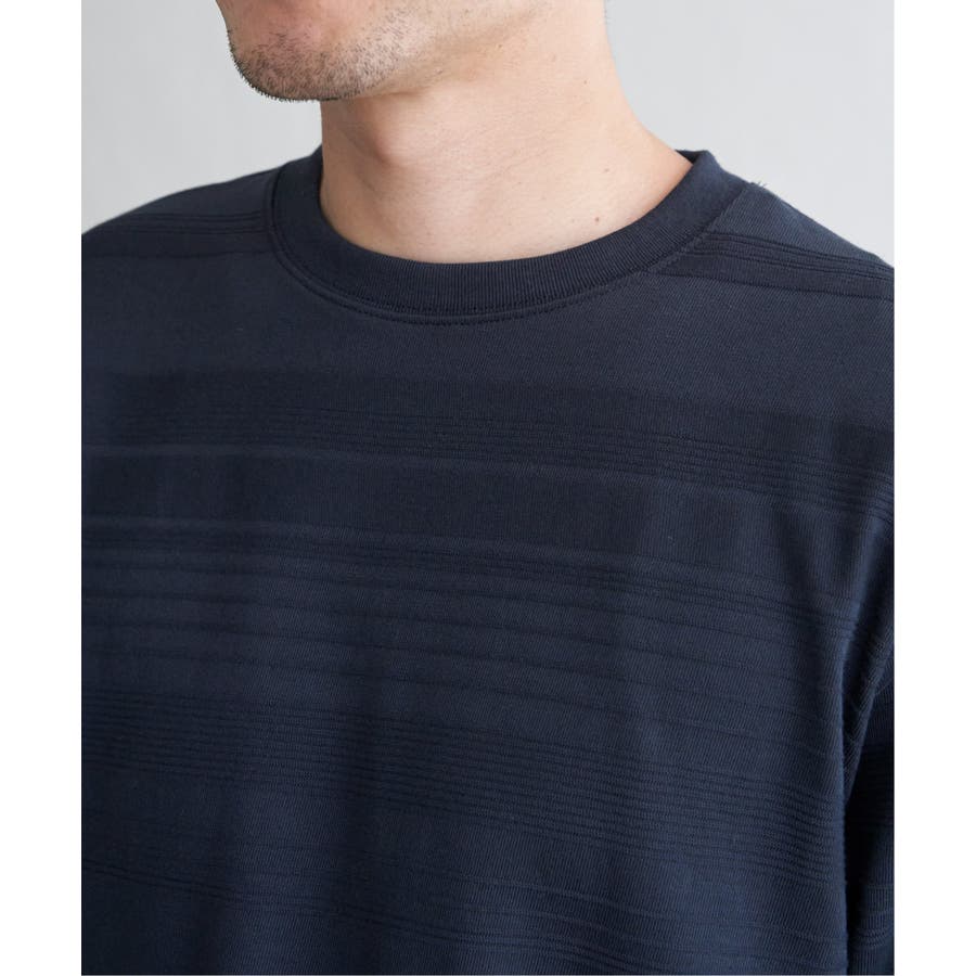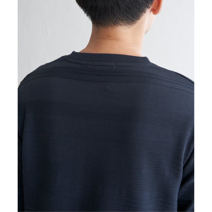 シンプルな長袖のクルーネックTシャツですが、生地の表面に凹凸のある地柄のランダムボーダーが特徴です。