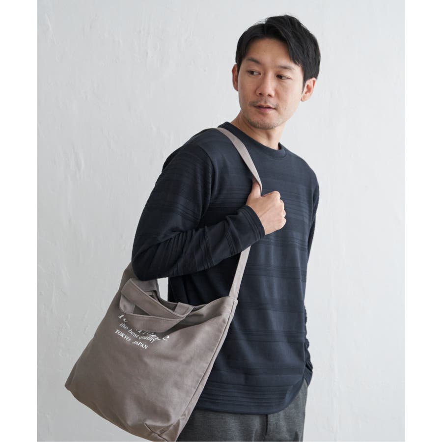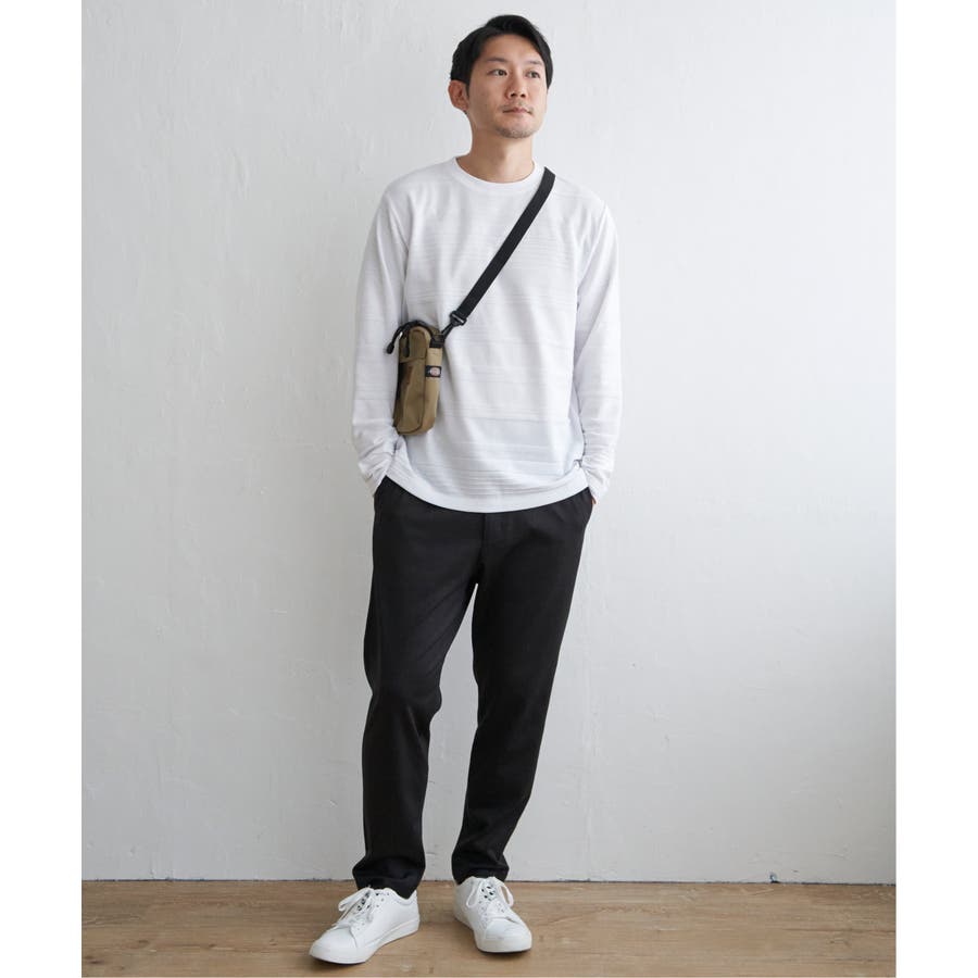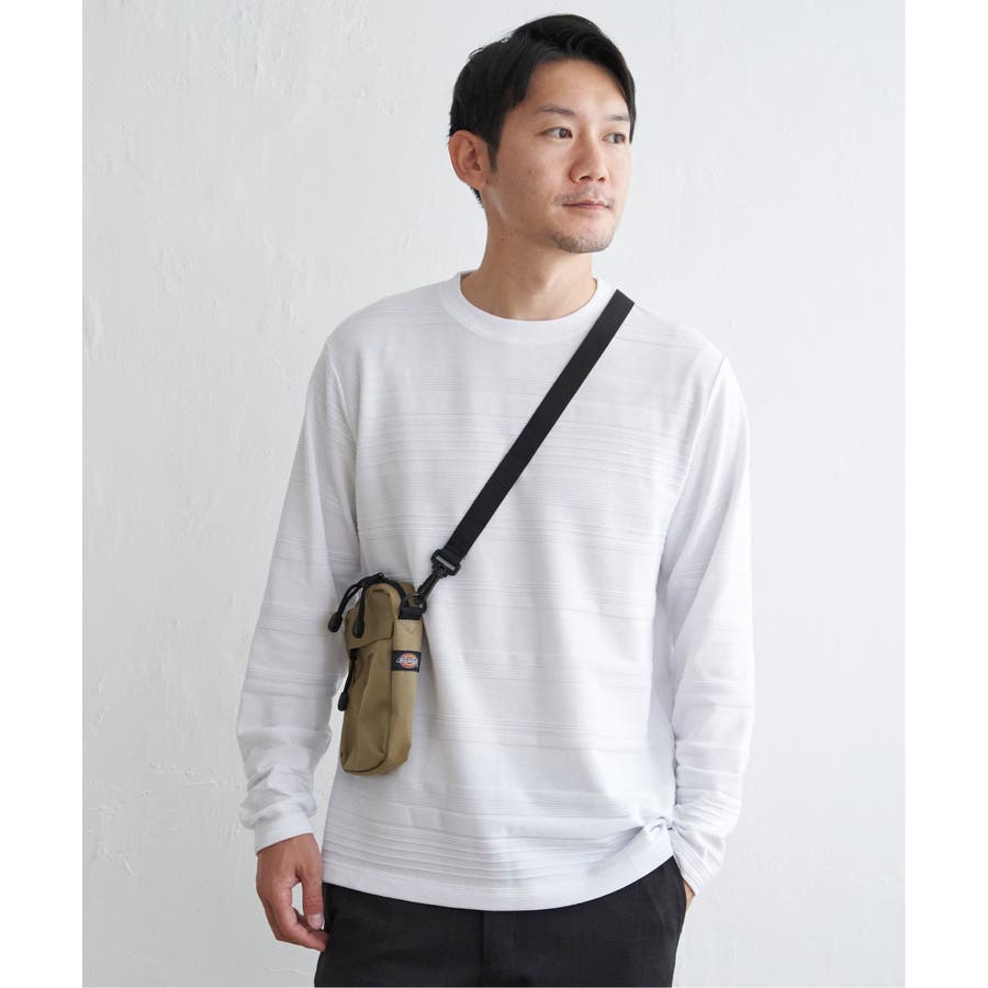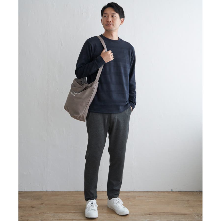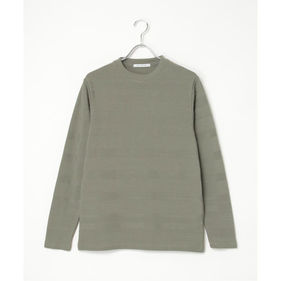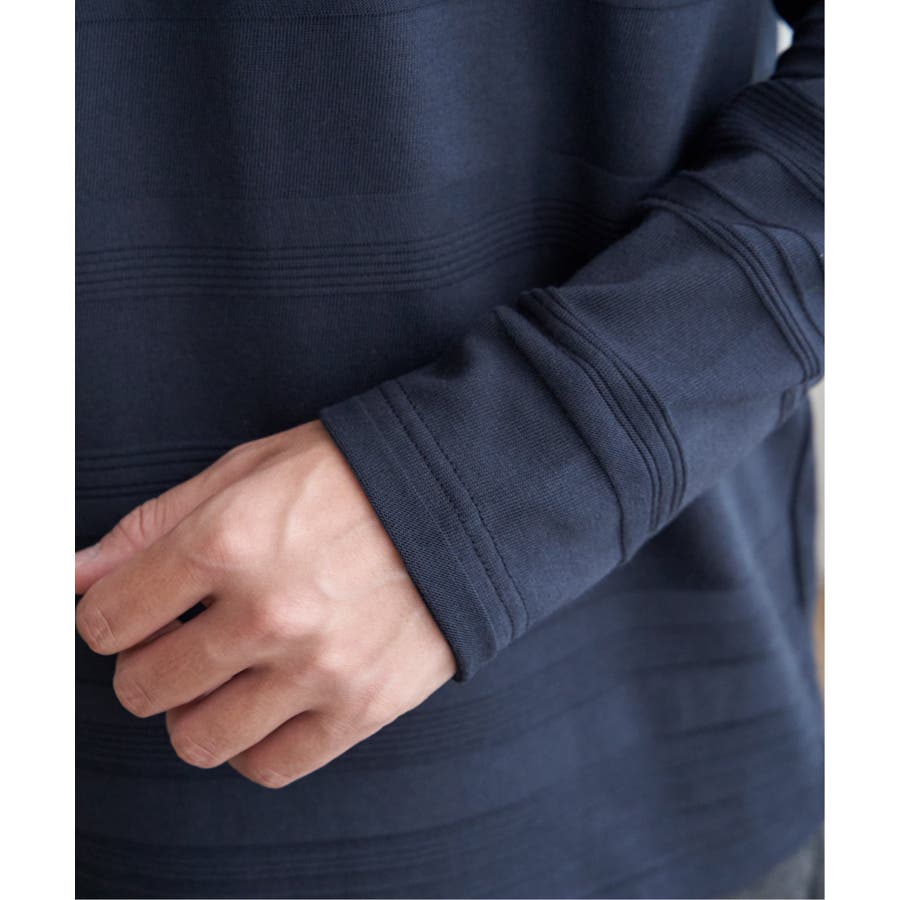 シンプルな長袖のクルーネックTシャツですが、生地の表面に凹凸のある地柄のランダムボーダーが特徴です。