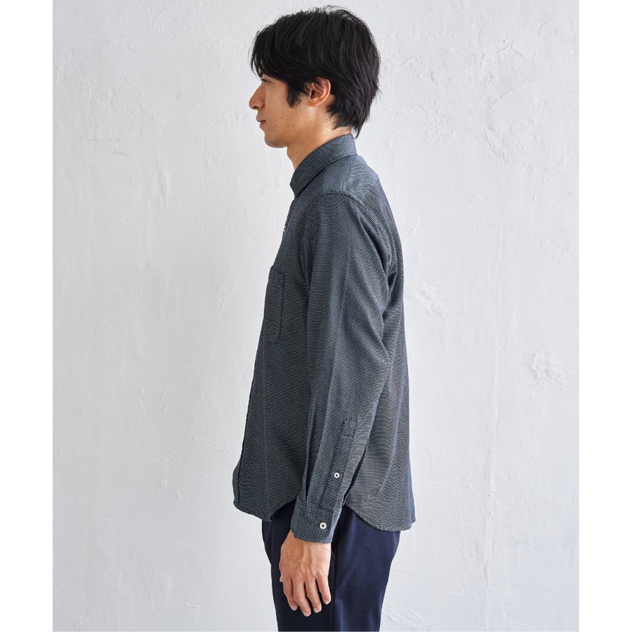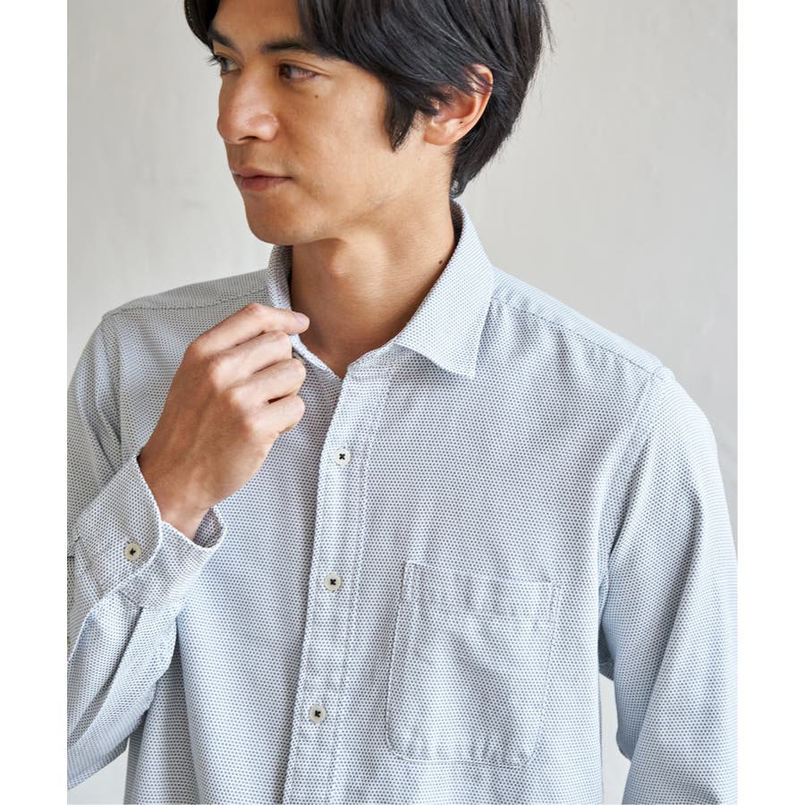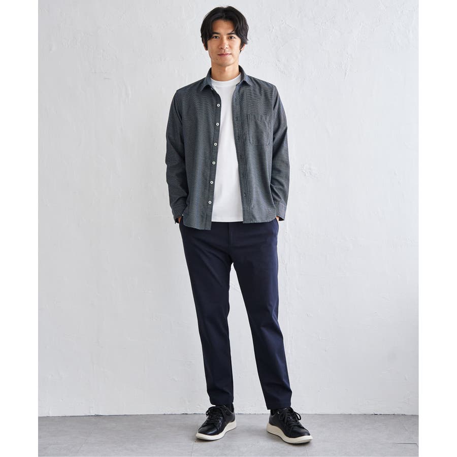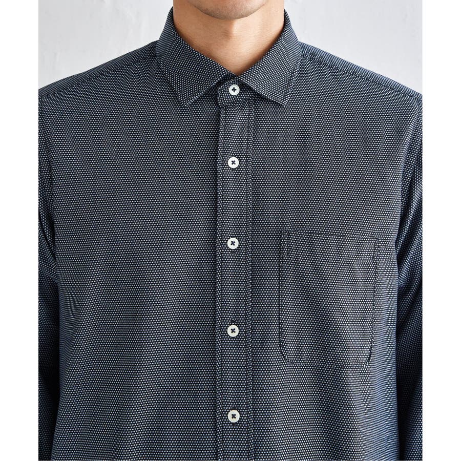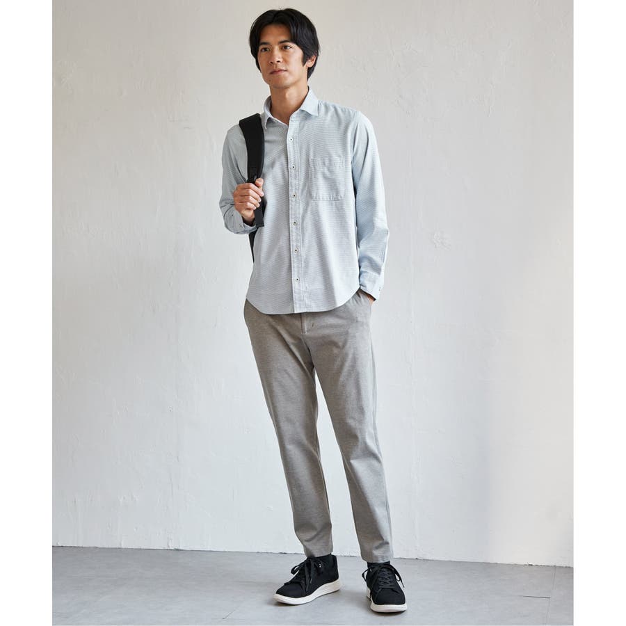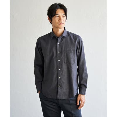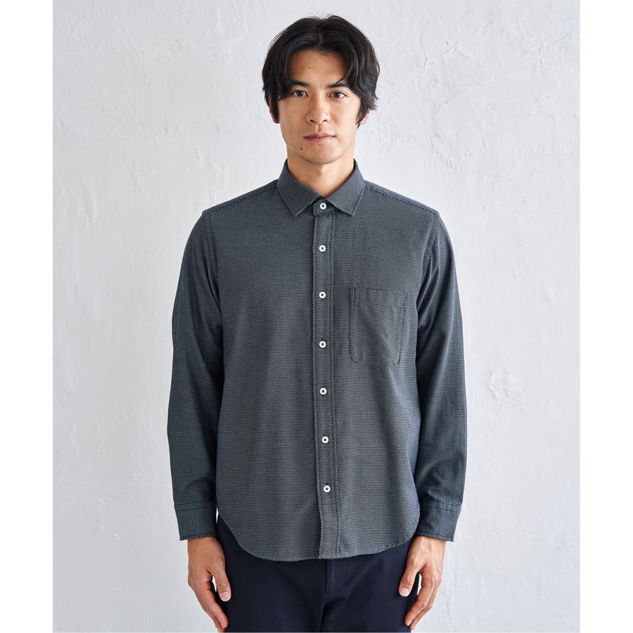 襟はワイドでもレギュラーでもない“中間”のスイスカラーを採用し、ほどよい抜け感と大人らしい端正さを両立しています。
