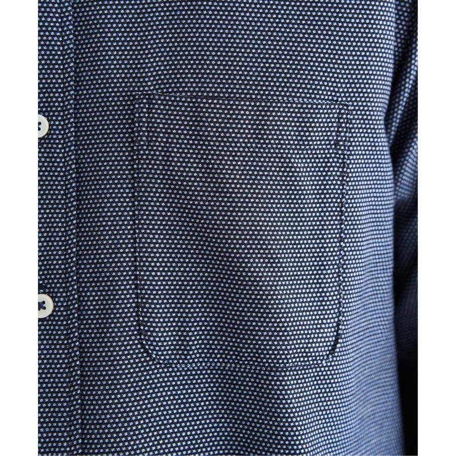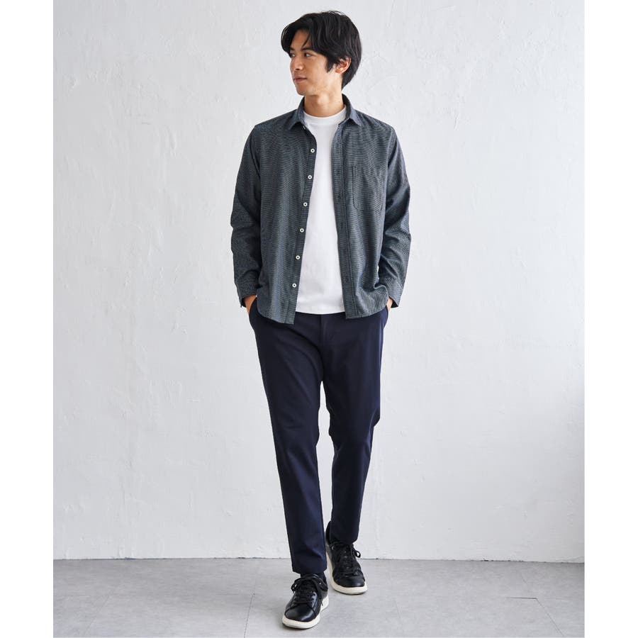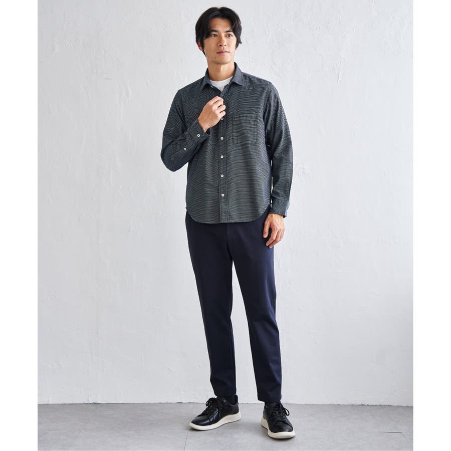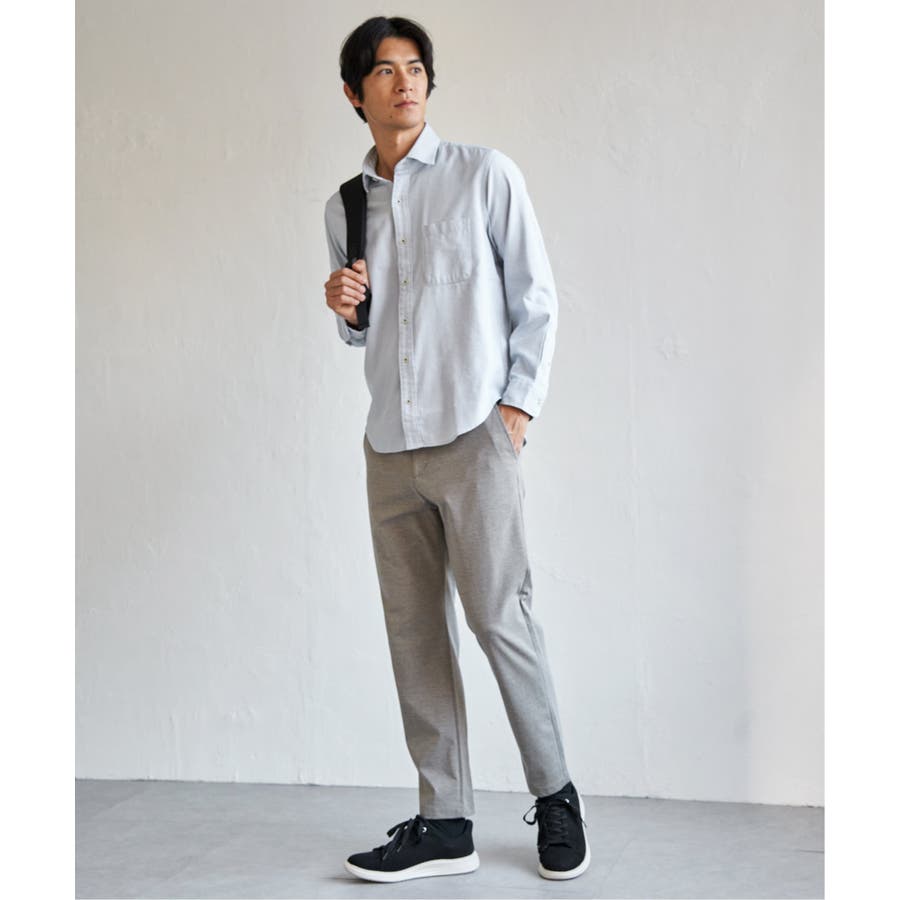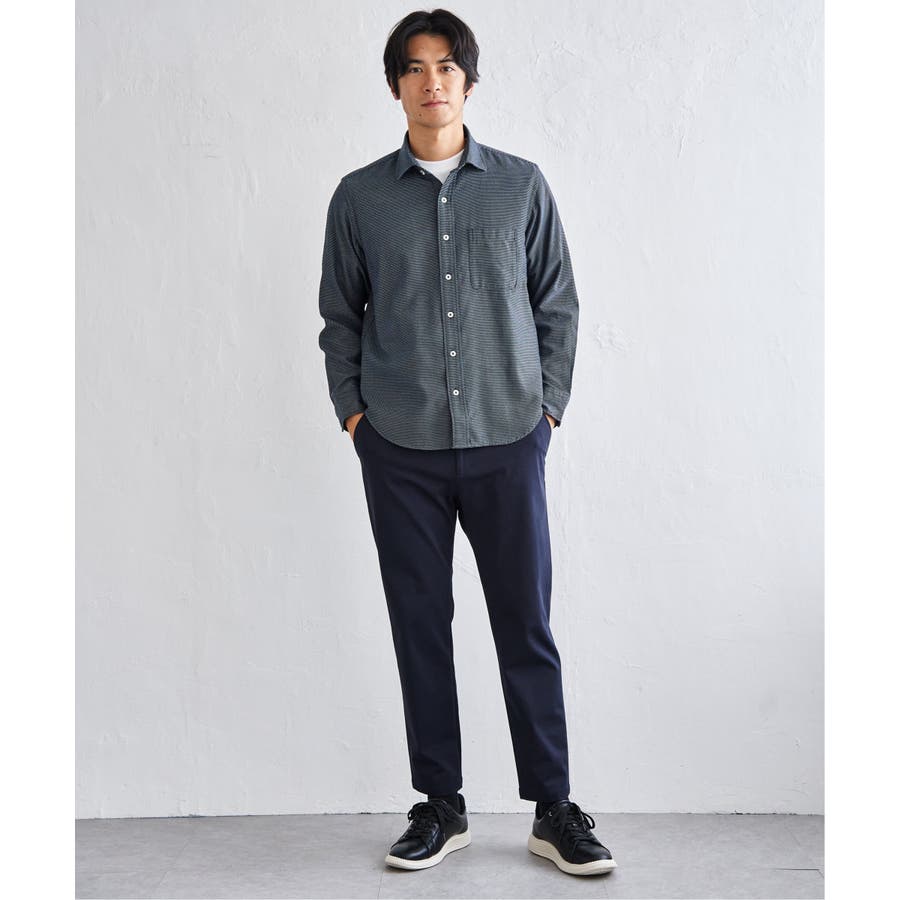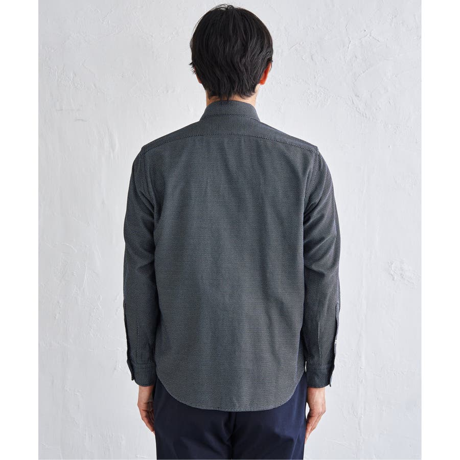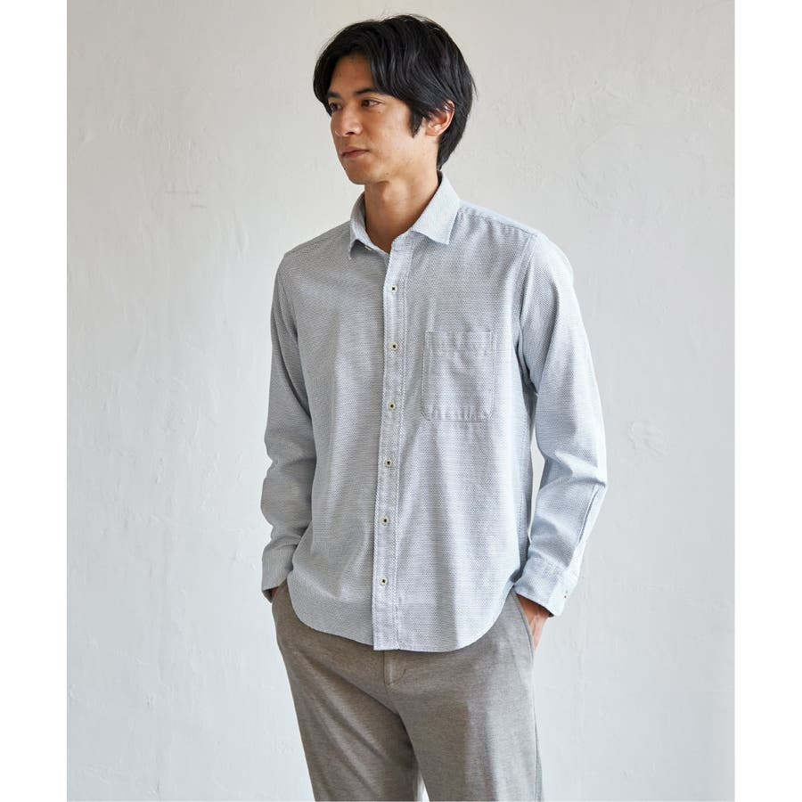 襟はワイドでもレギュラーでもない“中間”のスイスカラーを採用し、ほどよい抜け感と大人らしい端正さを両立しています。