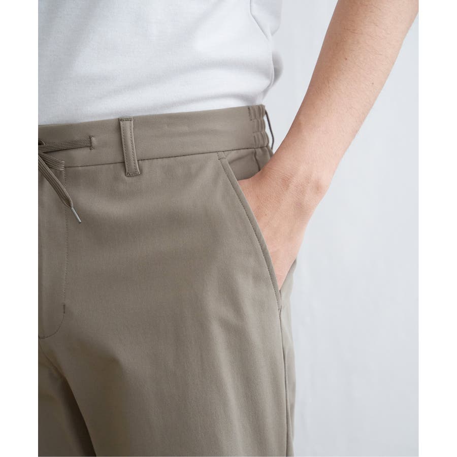 前身頃にゴムシャーリングが見えない、オンオフ兼用のイージーパンツです。