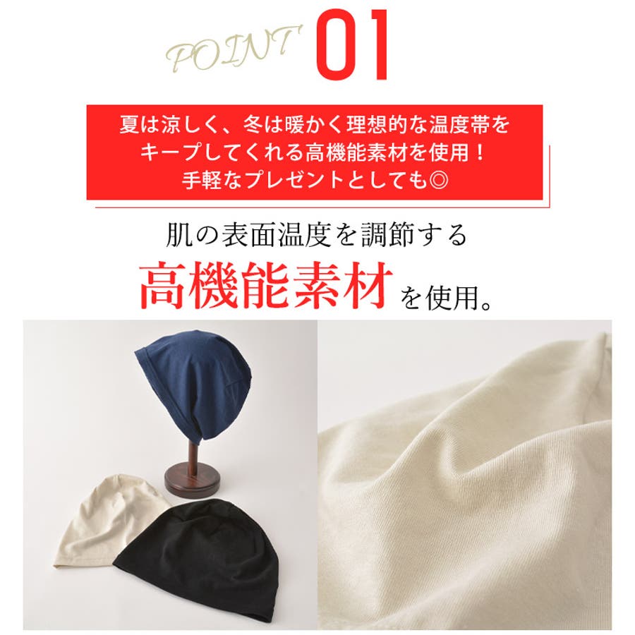シンプルなデザインで帽子やヘルメットなどのインナー帽子としても、一年を通して快適にかぶれます。