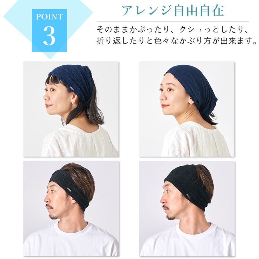 高さを生かし伸ばしたまま頭をすっぽり覆ったり、くしゅくしゅと短くしたり、2つに重ねて折りターバンとしても使えます。