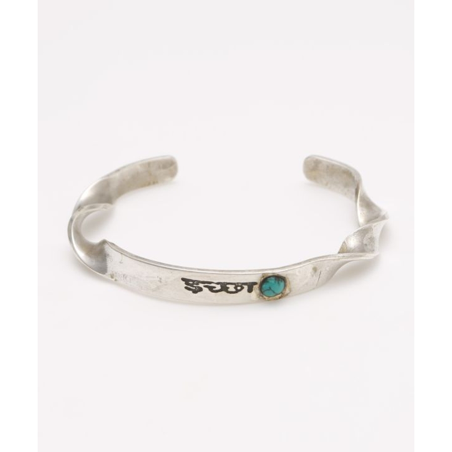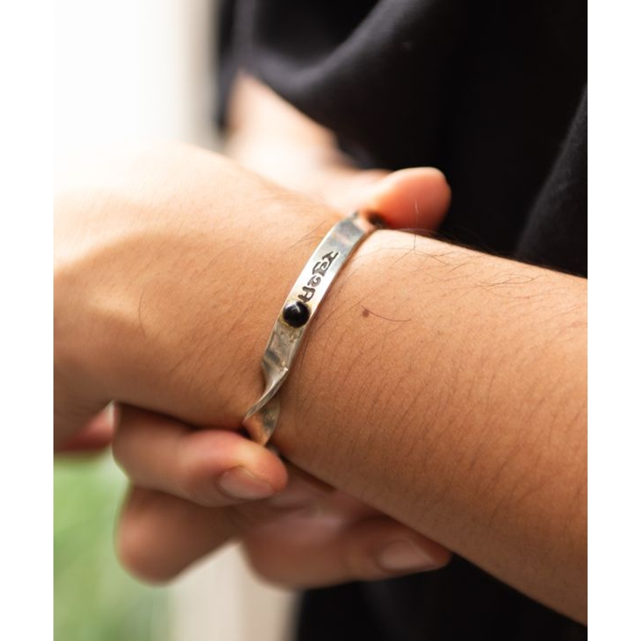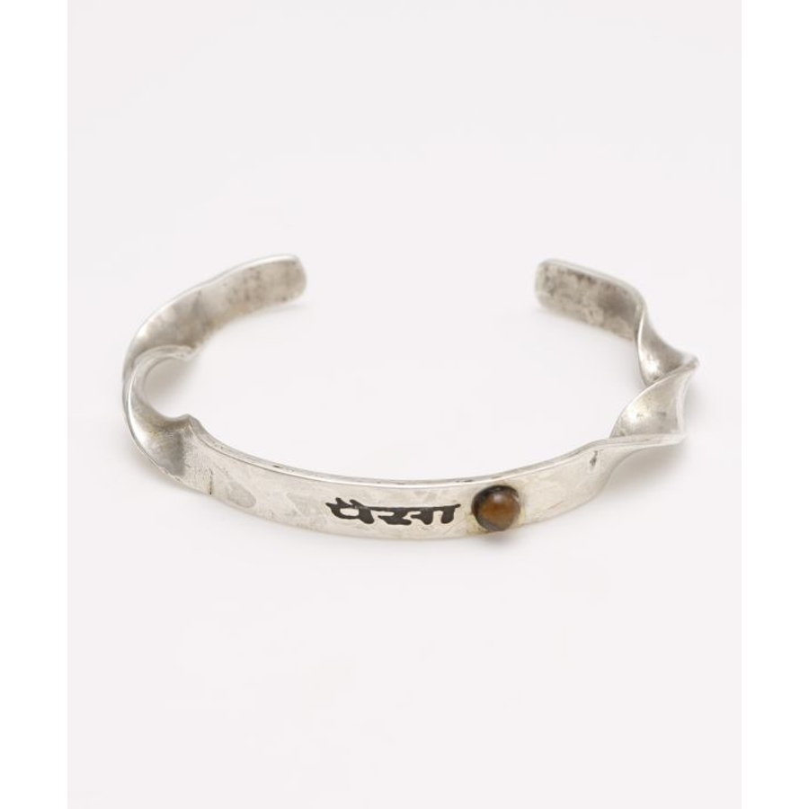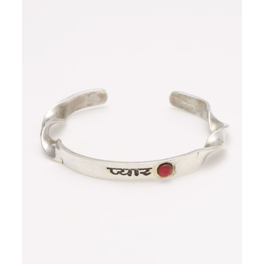 ツイストされたデザインでヒンディー語の願いが刻まれたお守りバングル。愛、お金・裕福、幸せ、希望・夢、平和…自分の願いを込めていつも身に着けてみては。シンプルなデザインだが存在感抜群なアイテム。願いによってカラーストーンも変わる。