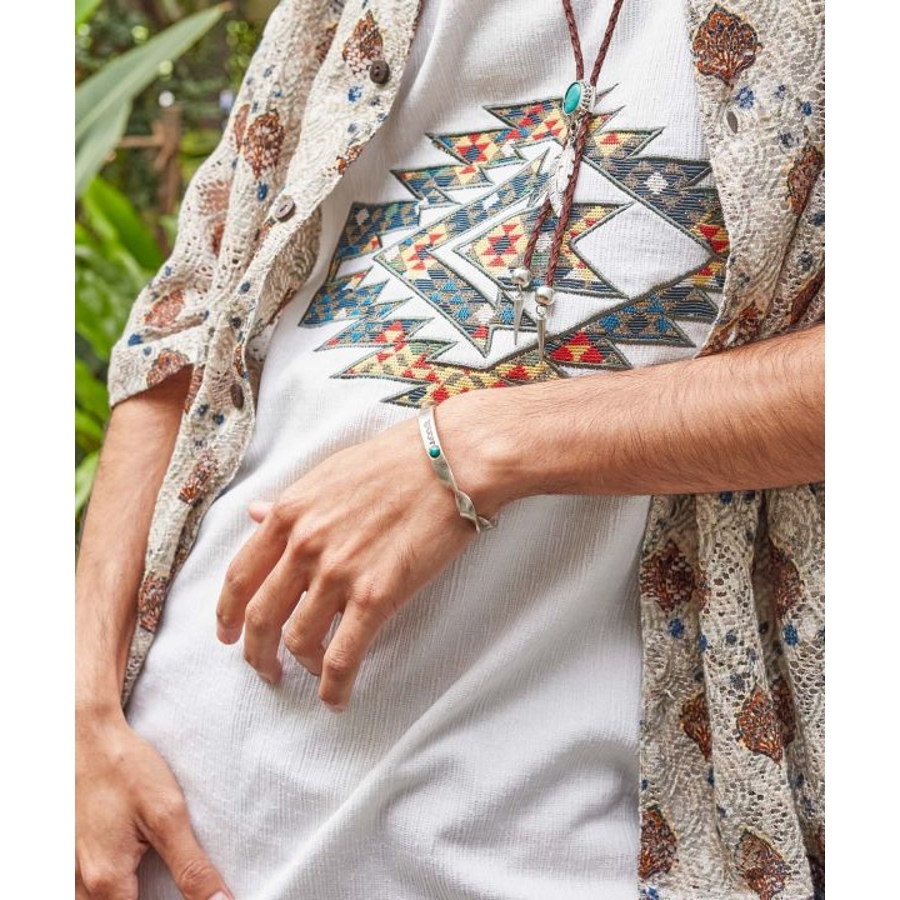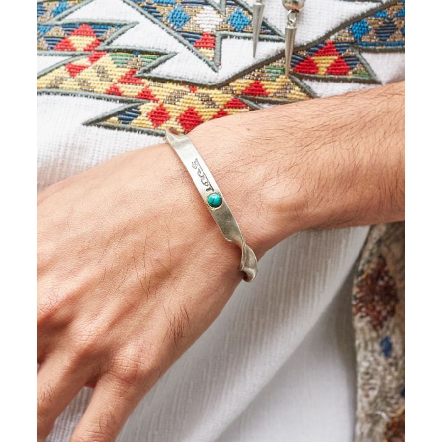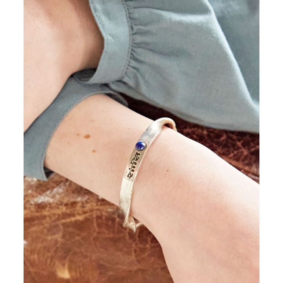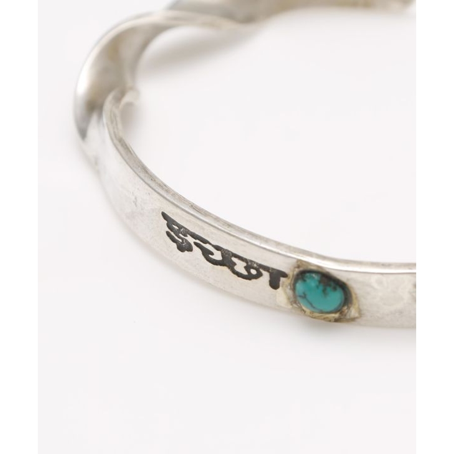 ツイストされたデザインでヒンディー語の願いが刻まれたお守りバングル。愛、お金・裕福、幸せ、希望・夢、平和…自分の願いを込めていつも身に着けてみては。シンプルなデザインだが存在感抜群なアイテム。願いによってカラーストーンも変わる。