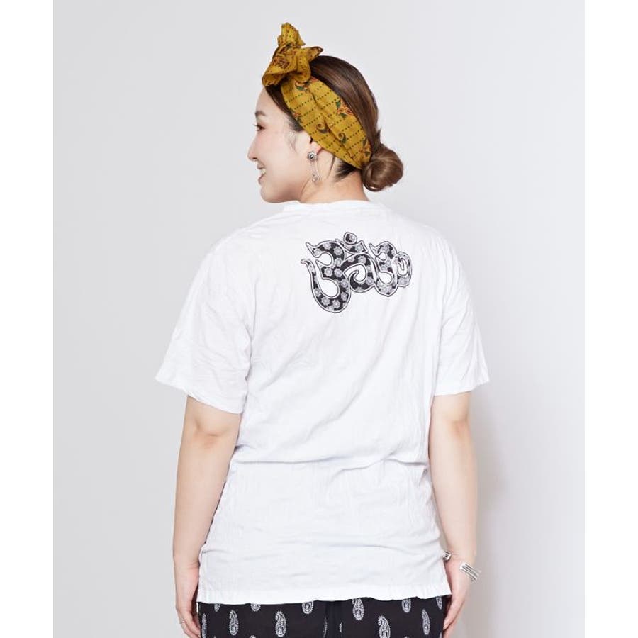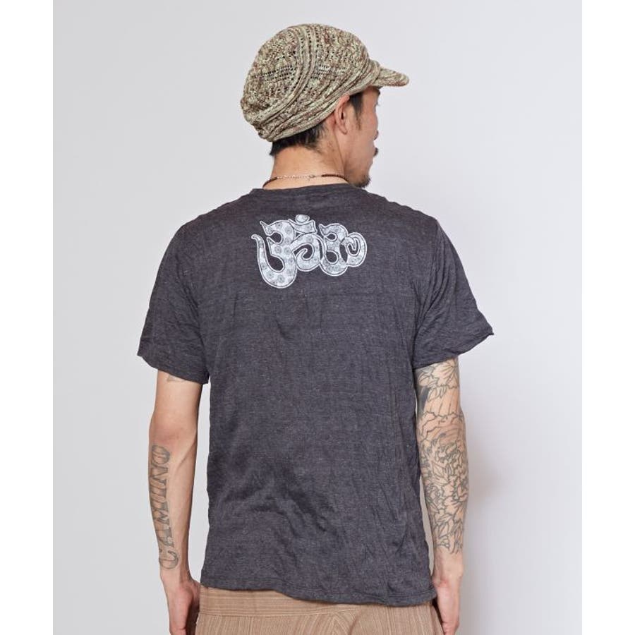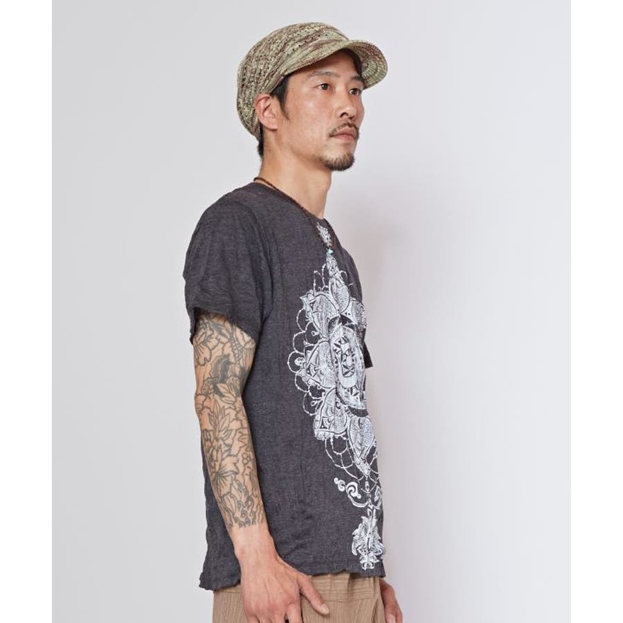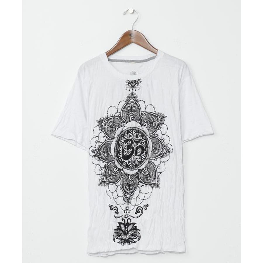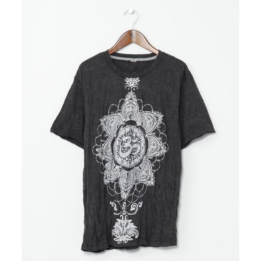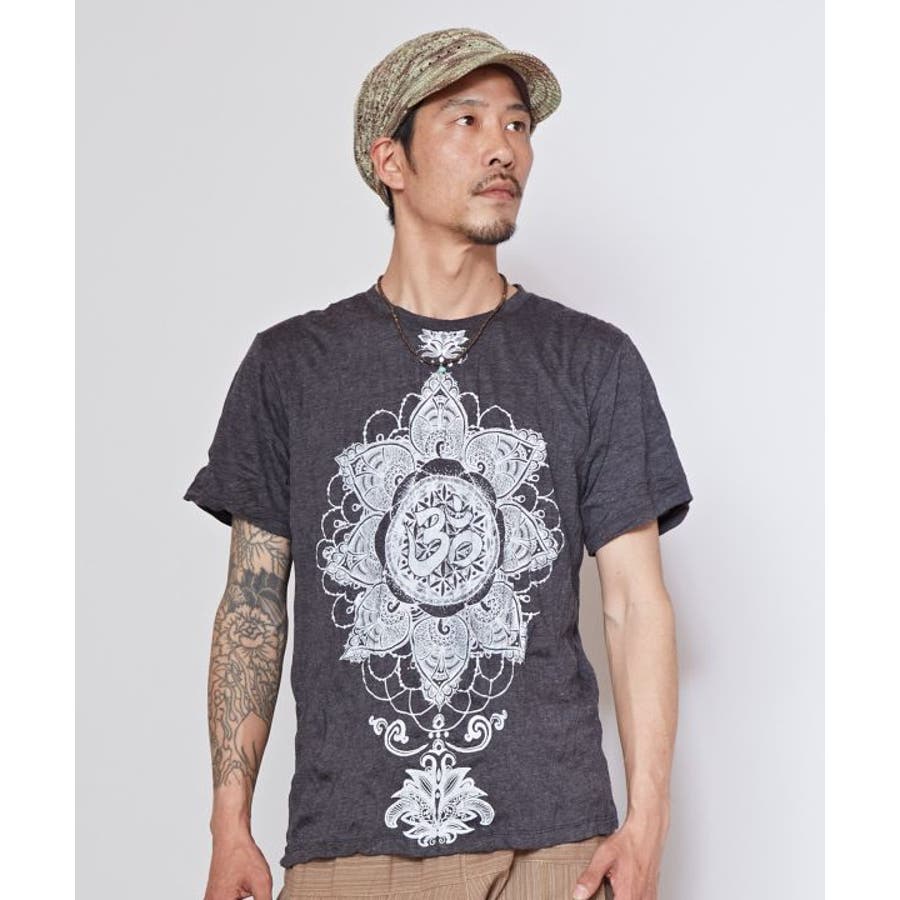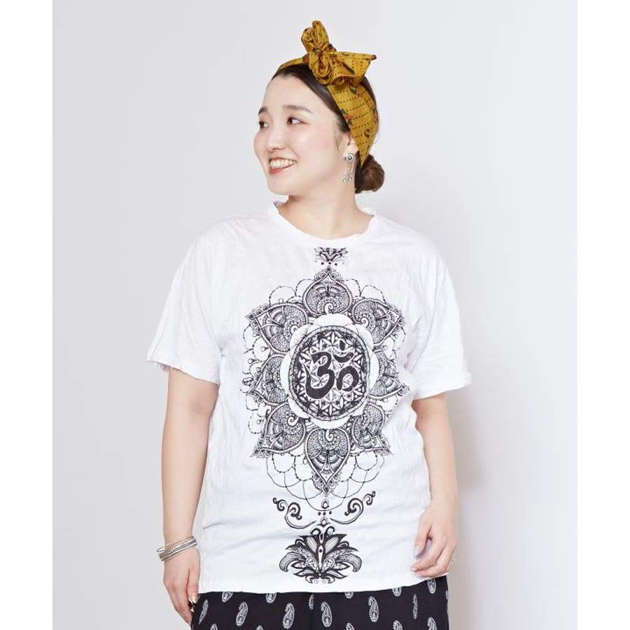 【タイ直輸入】シワ加工がラフさを演出してくれるコットンTシャツ。大胆なオーム柄とマンダラ柄があしらわれたデザインが印象的。程よい丈感とさらっとした肌触りで、大活躍すること間違いなしです。