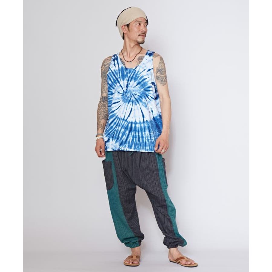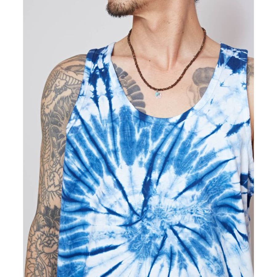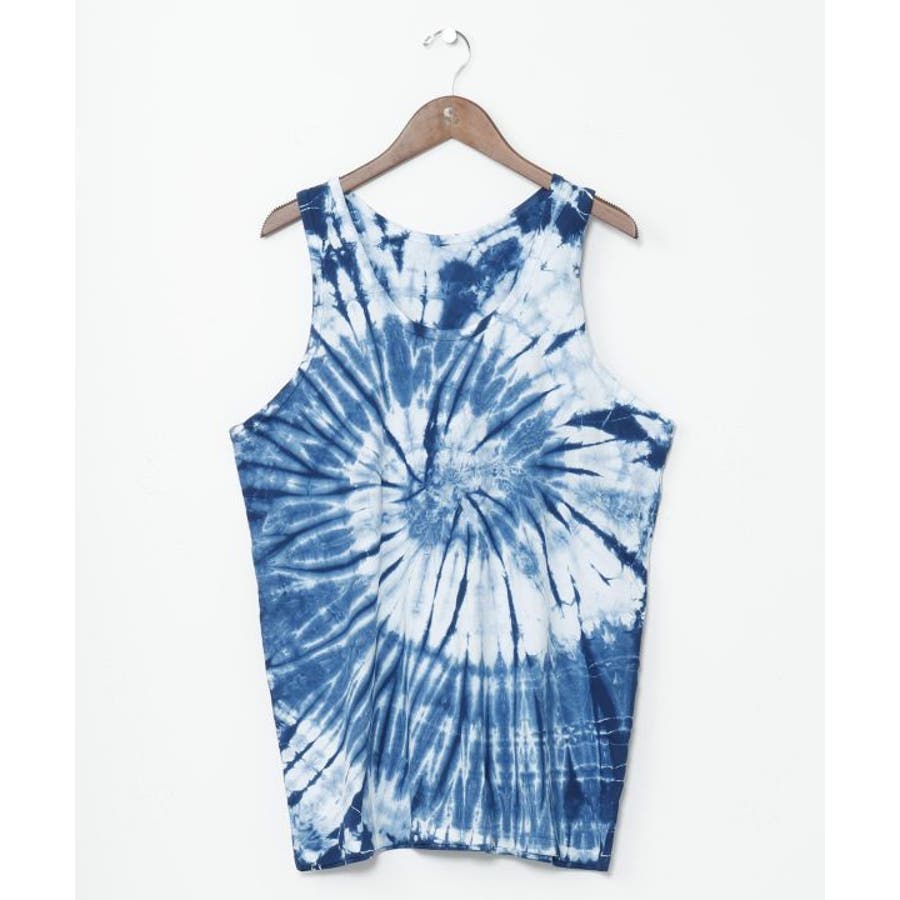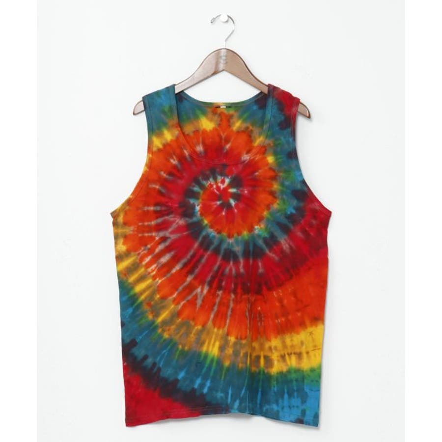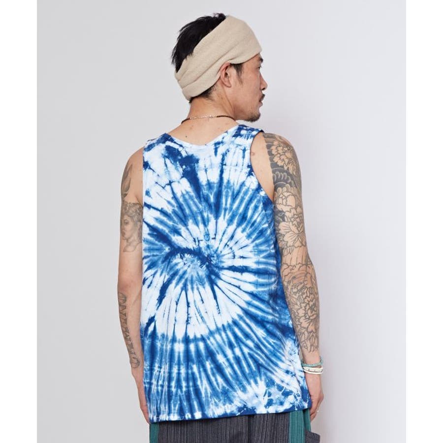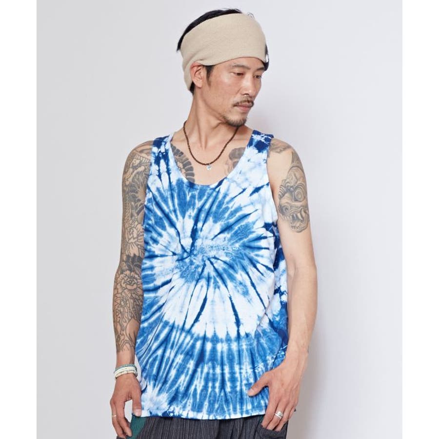 【タイ直輸入】大胆なタイダイ柄が目を惹くコットンタンクトップ。広めの首元としっかりとした綿素材で着心地も抜群。ラフなスタイルにプラスしたい遊び心満点の一枚です。