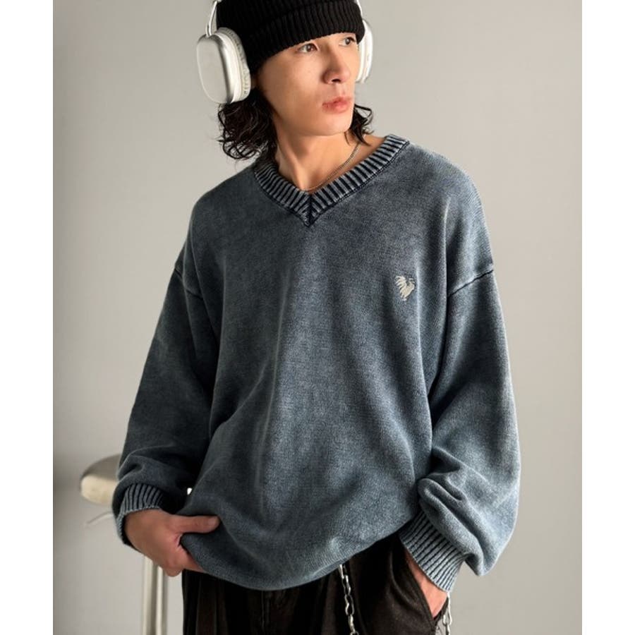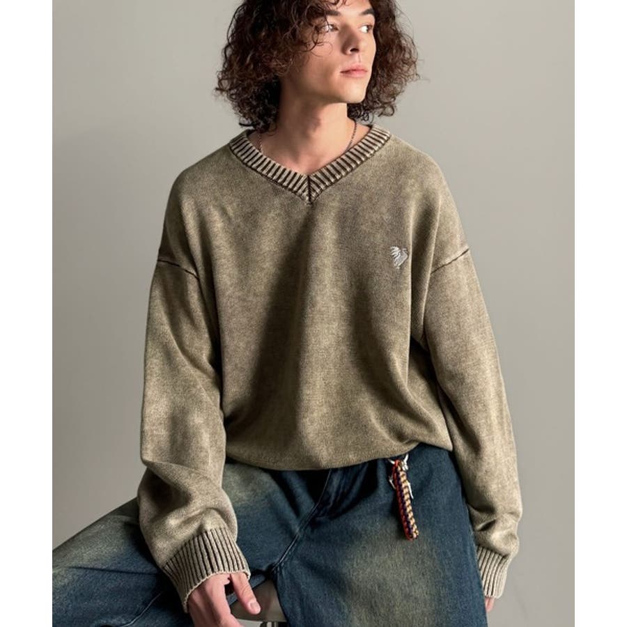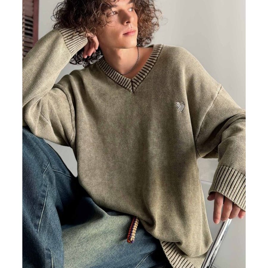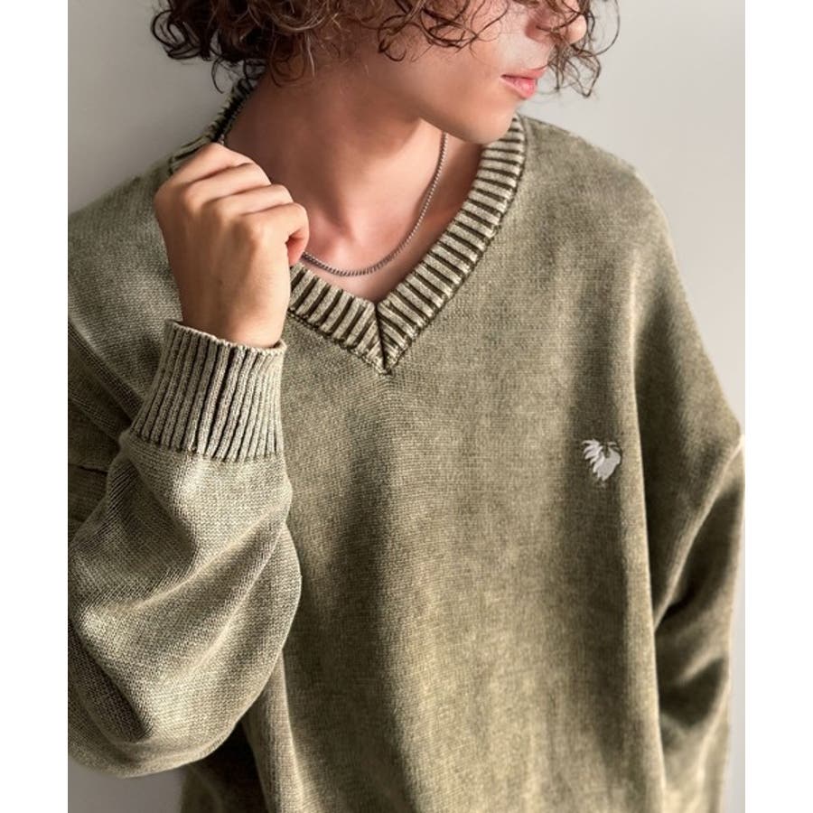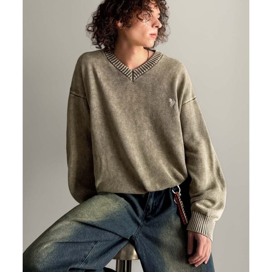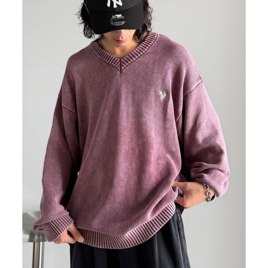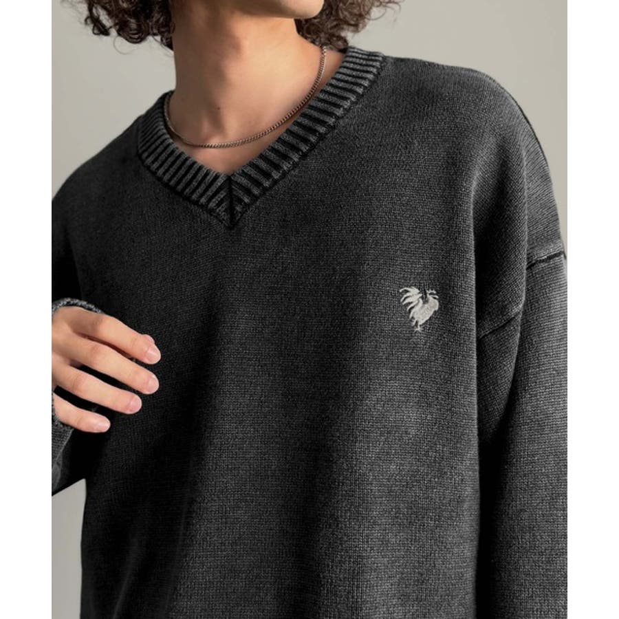 「自分ウケ最強。」綿100%刺繍入りピグメント加工Vネックセーター