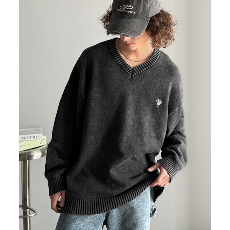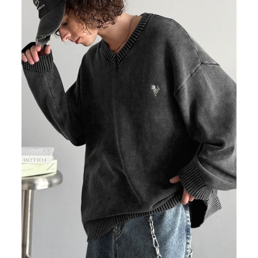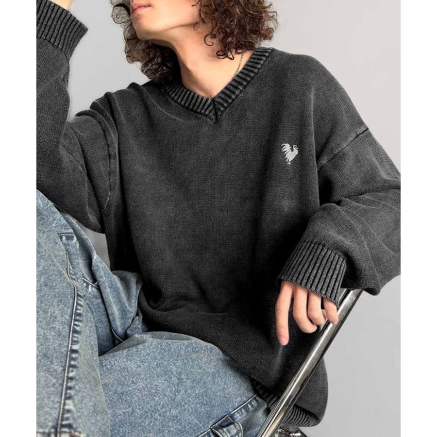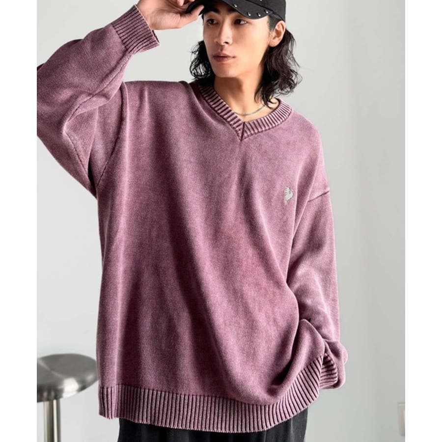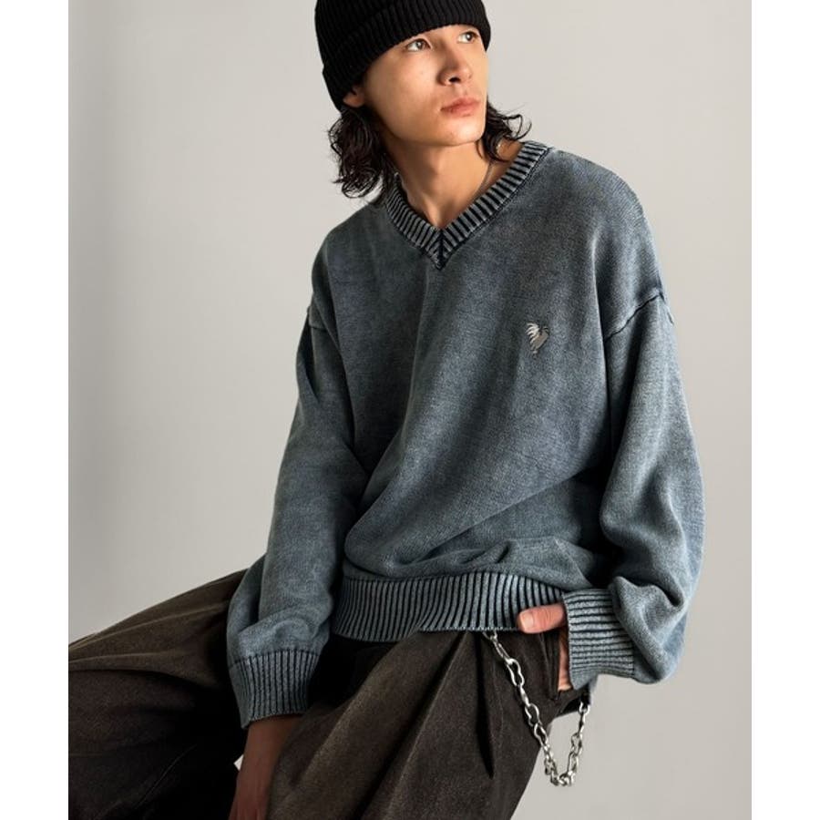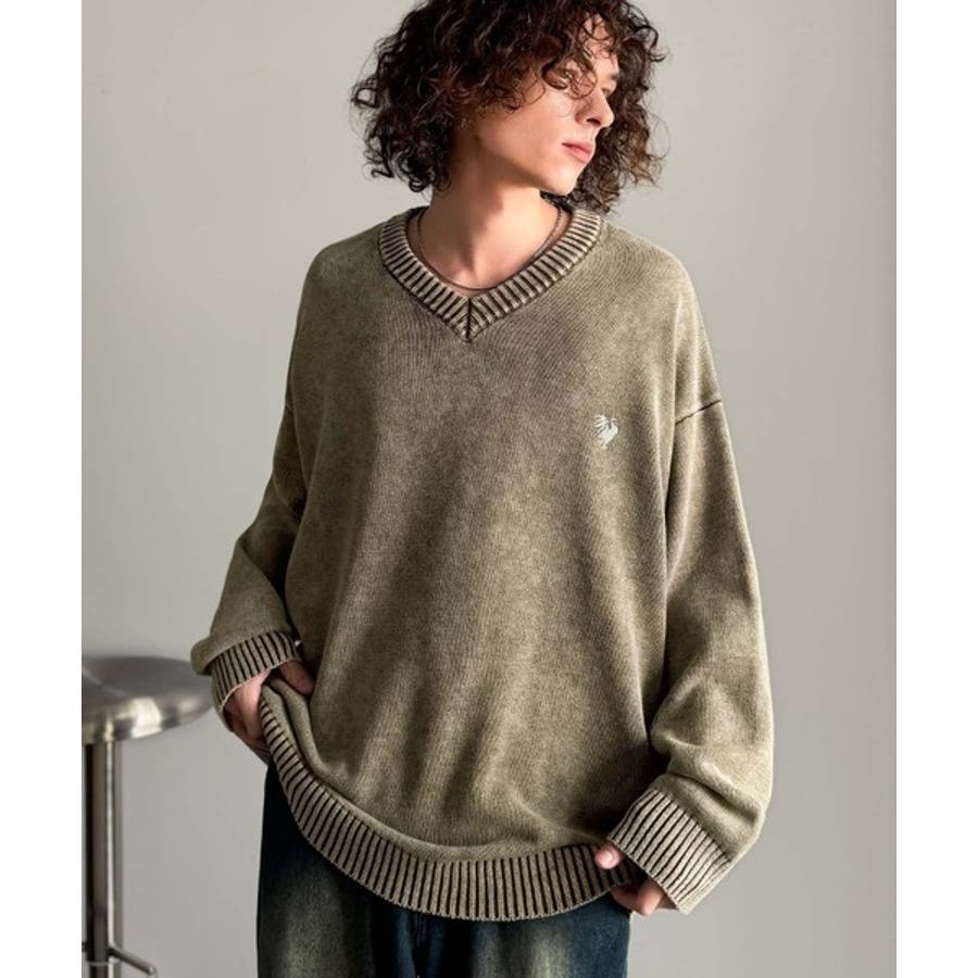 「自分ウケ最強。」綿100%刺繍入りピグメント加工Vネックセーター