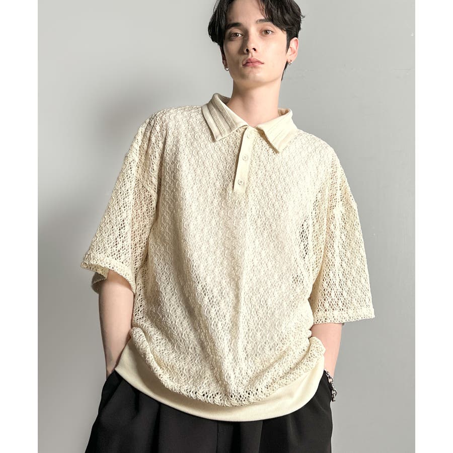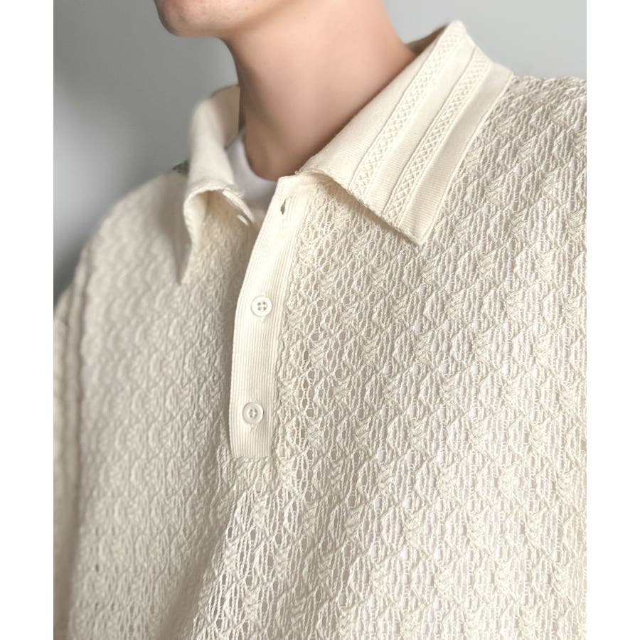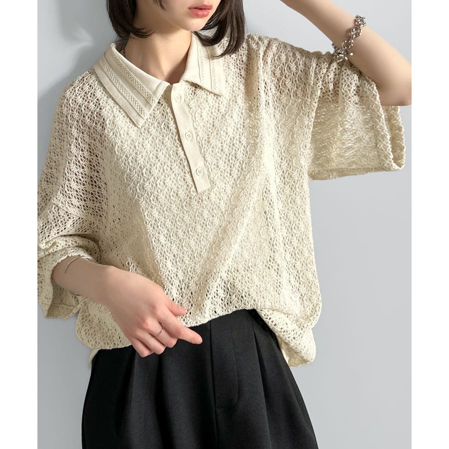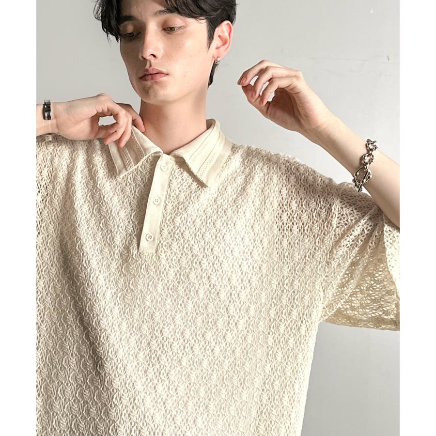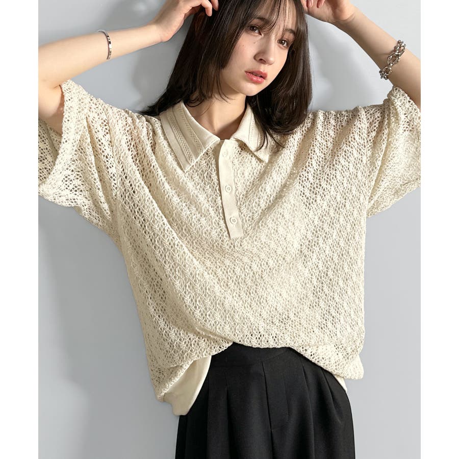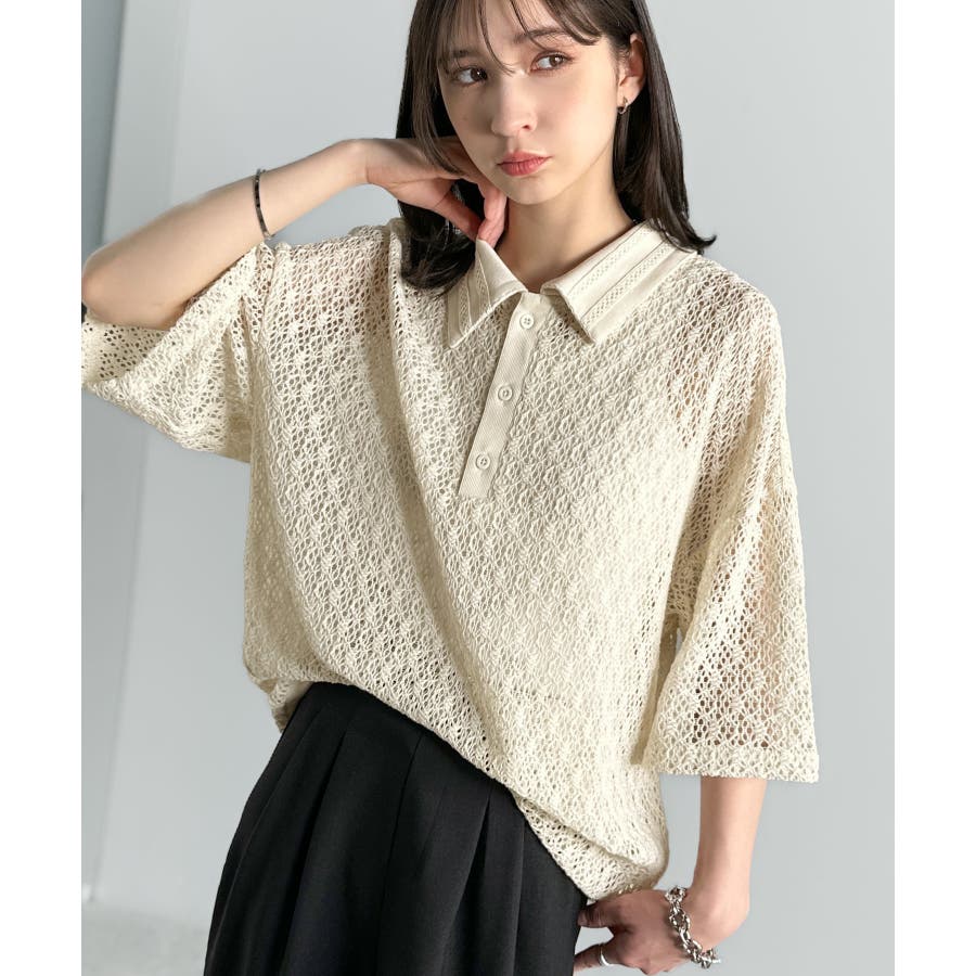 「透け感、モードの余韻。」衿ダブルライン使いレース柄ニットポロシャツ Lace …