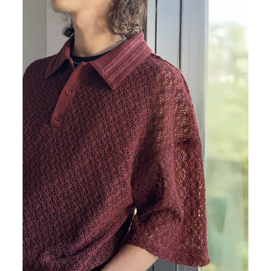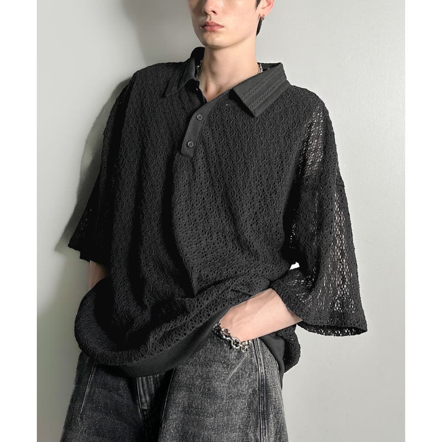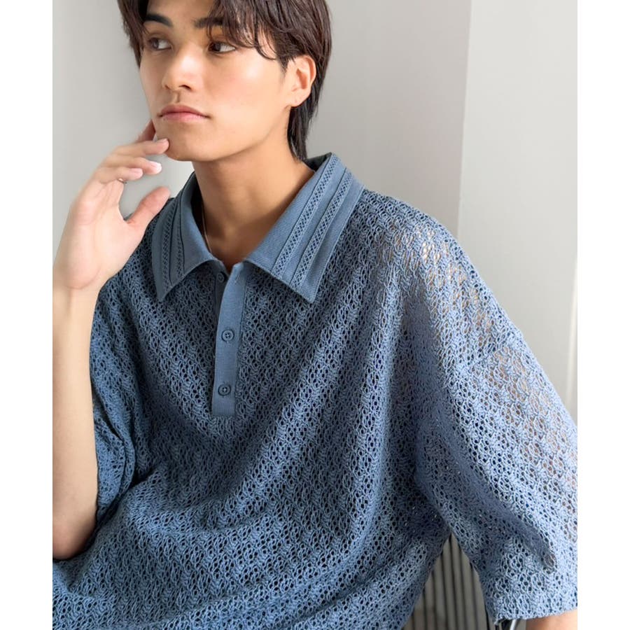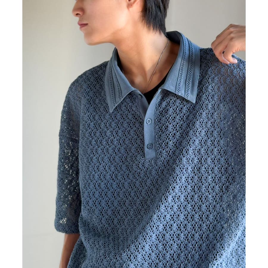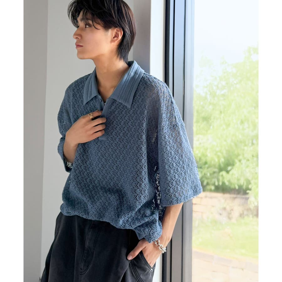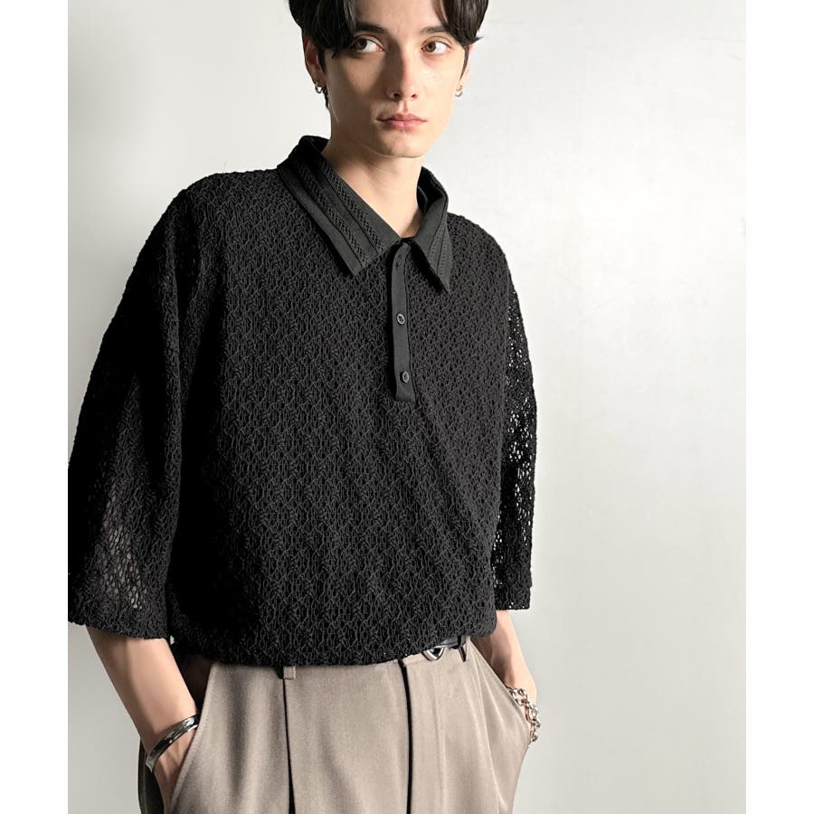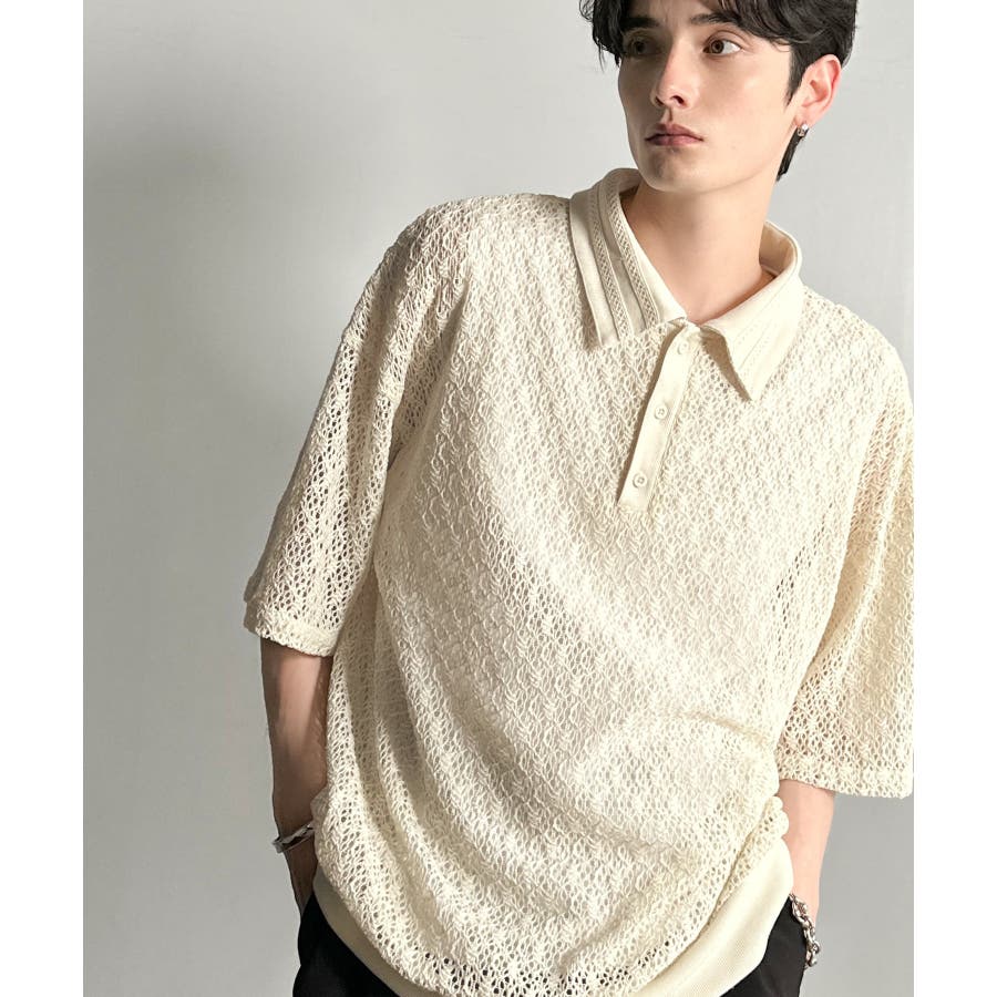 「透け感、モードの余韻。」衿ダブルライン使いレース柄ニットポロシャツ Lace …