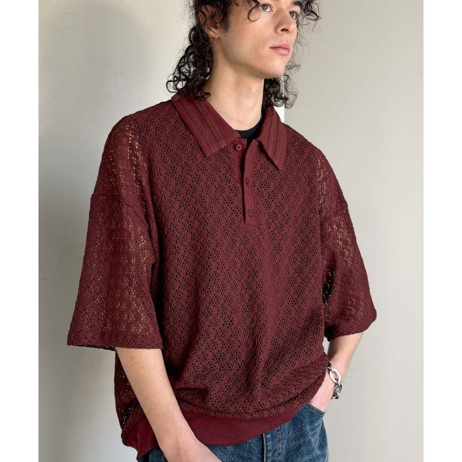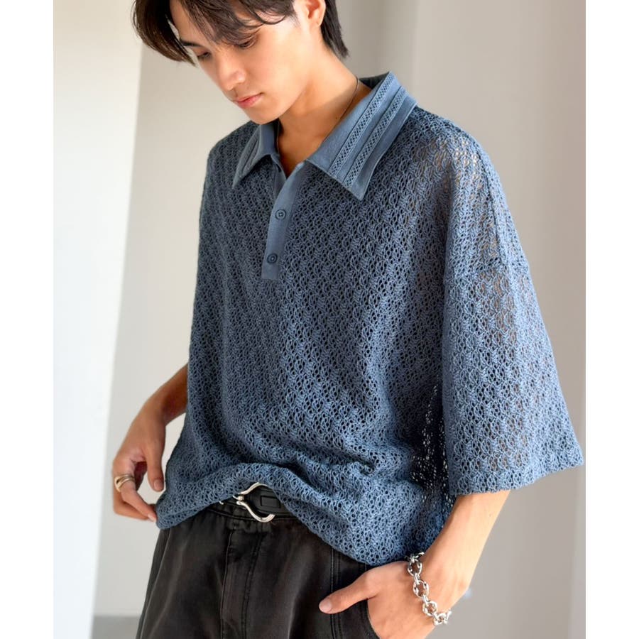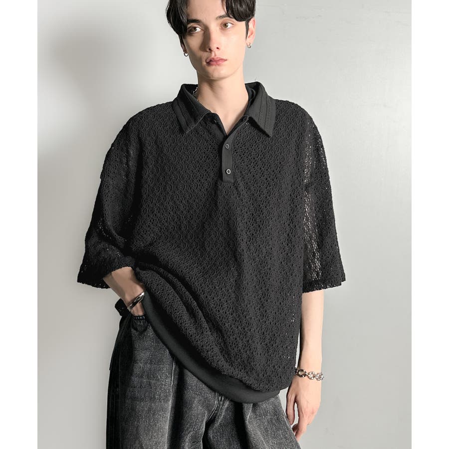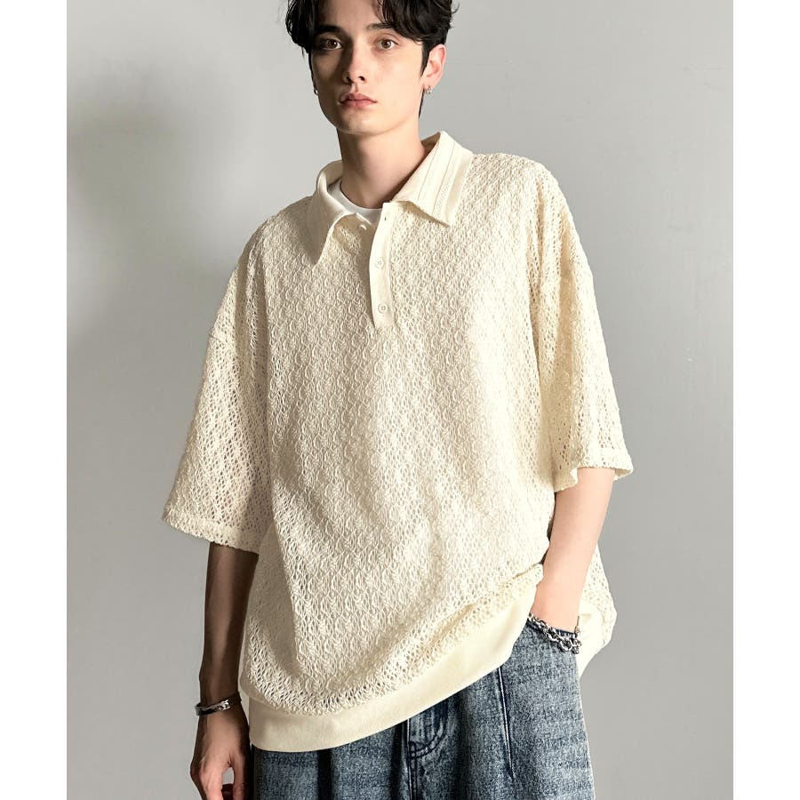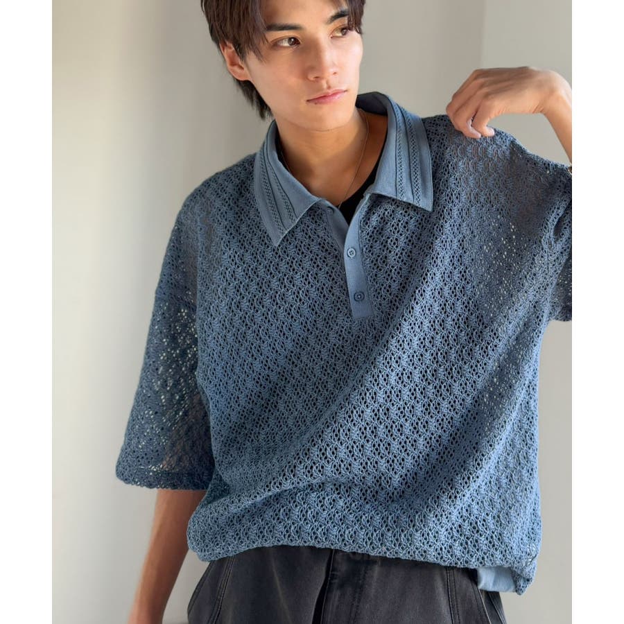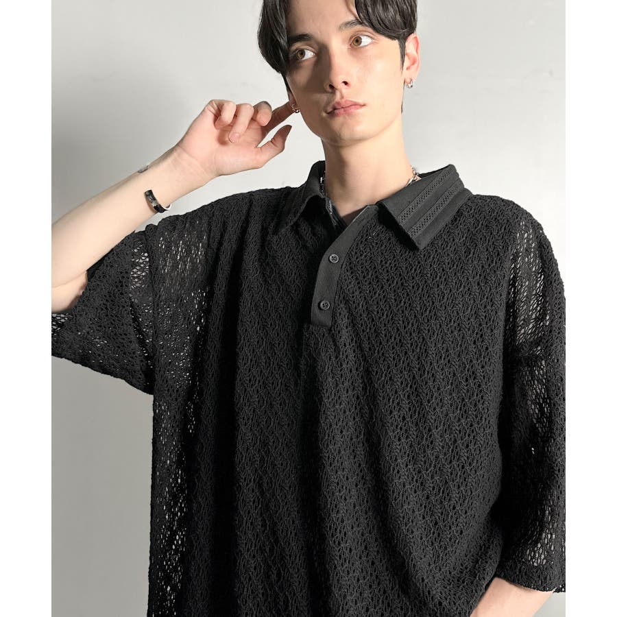「透け感、モードの余韻。」衿ダブルライン使いレース柄ニットポロシャツ Lace …