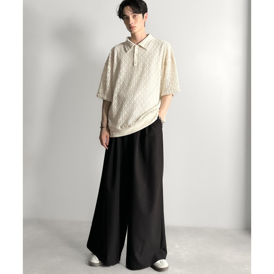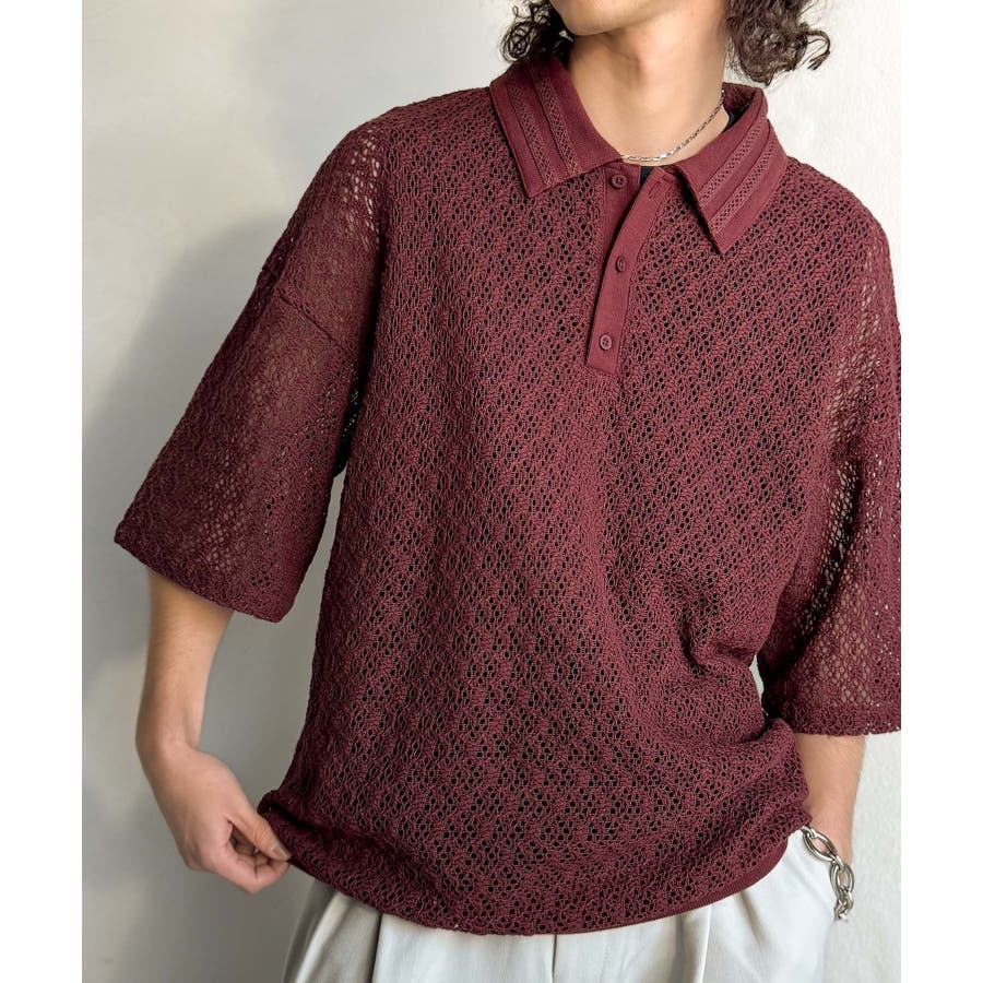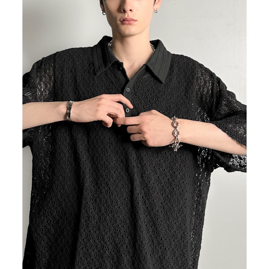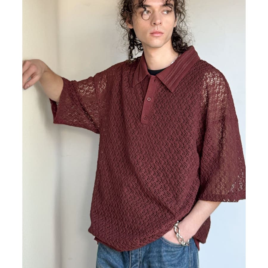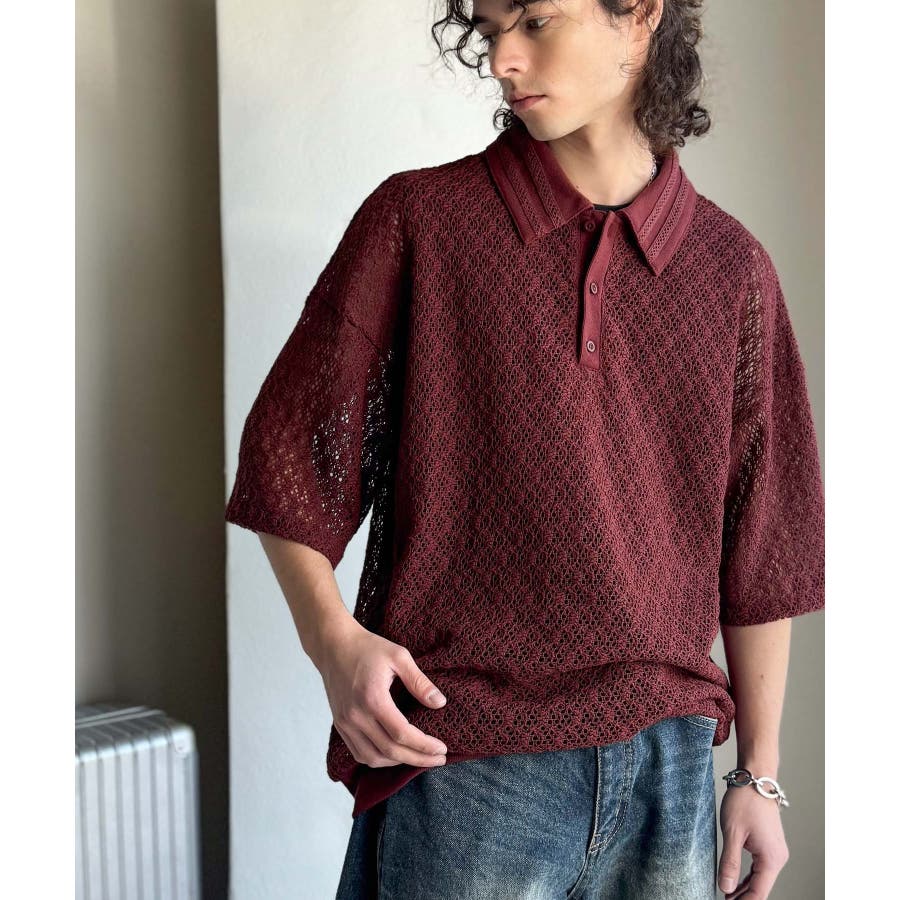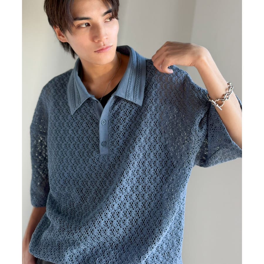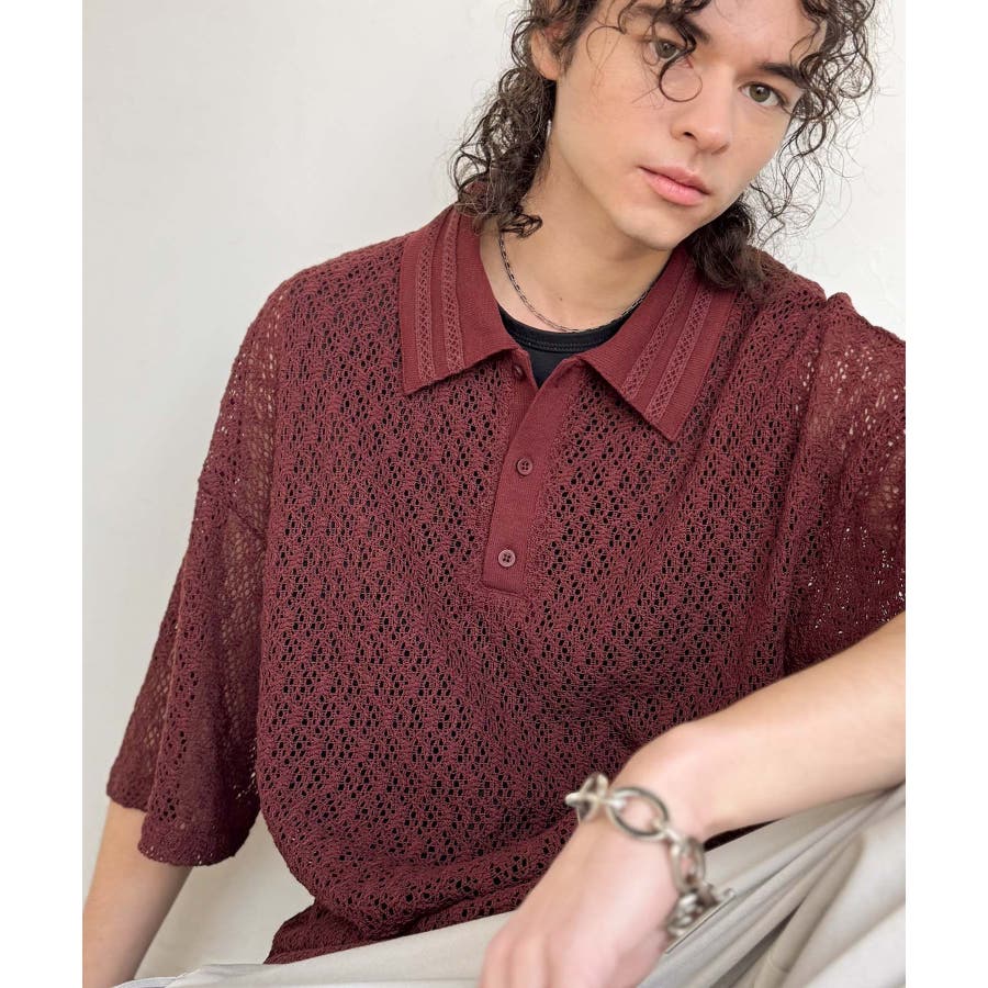 「透け感、モードの余韻。」衿ダブルライン使いレース柄ニットポロシャツ Lace …