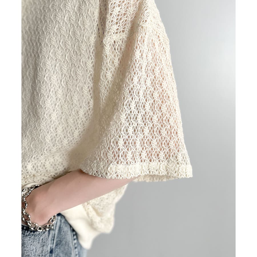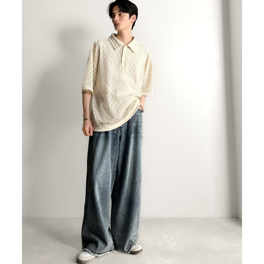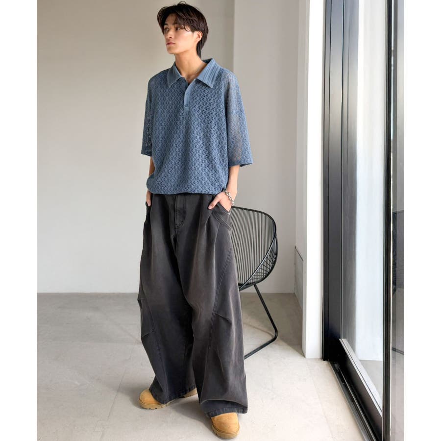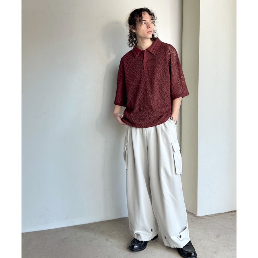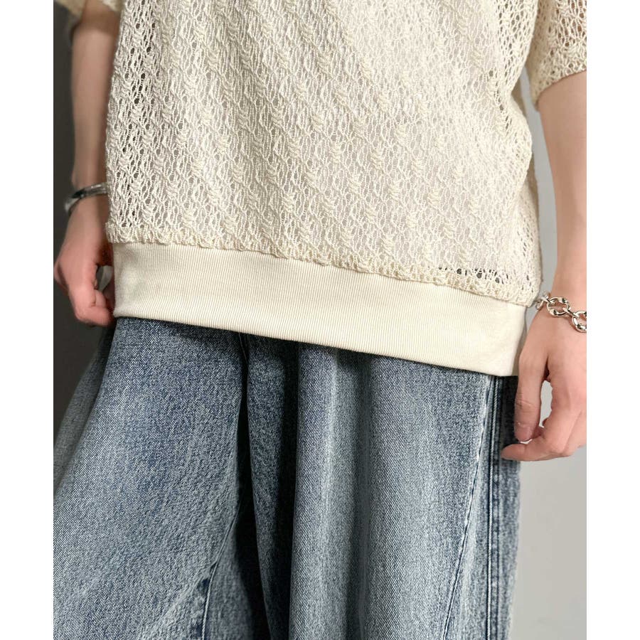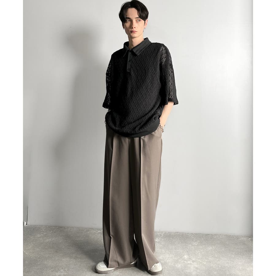 「透け感、モードの余韻。」衿ダブルライン使いレース柄ニットポロシャツ Lace …