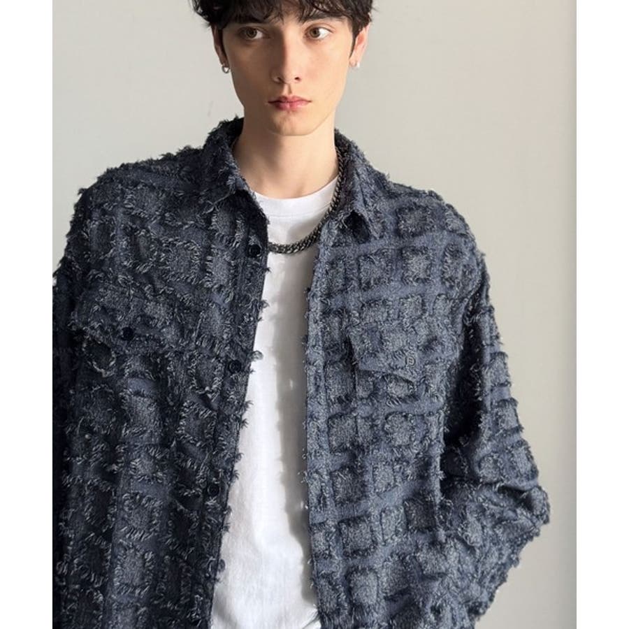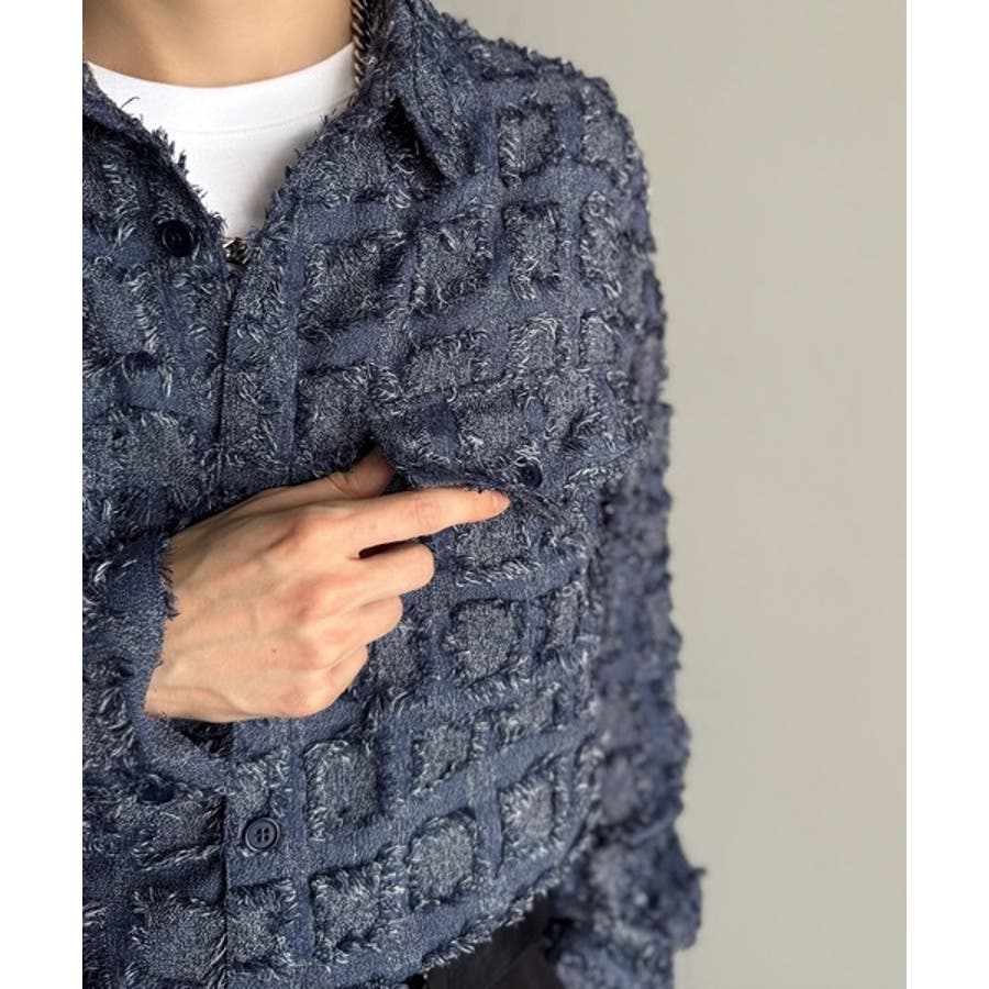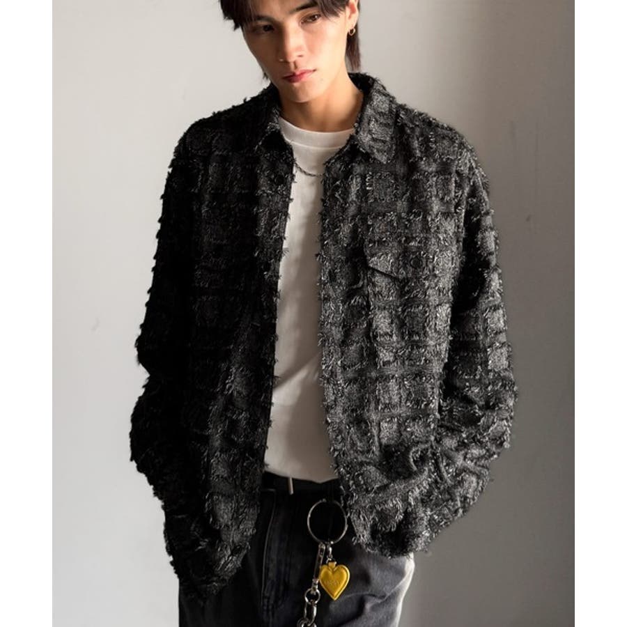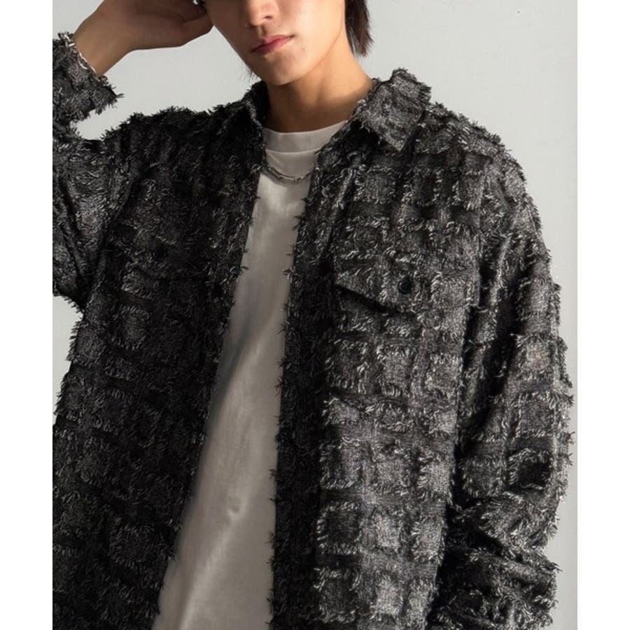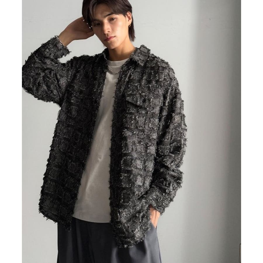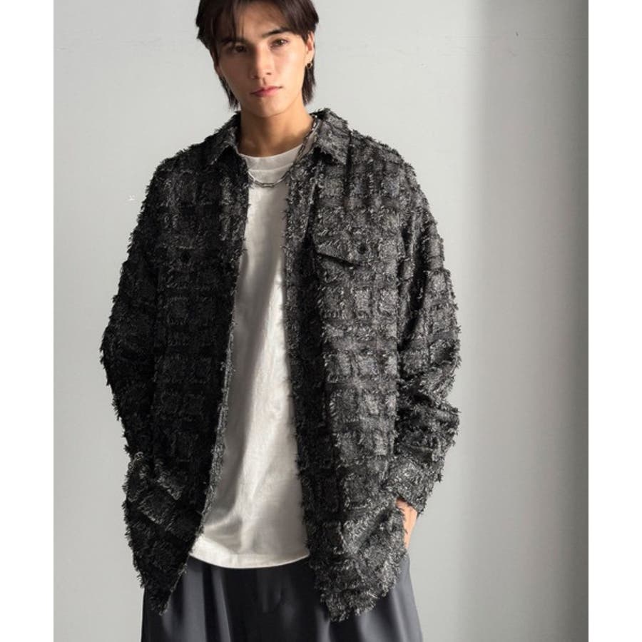 フリンジ使いブロックチェックアウターシャツは、存在感のあるデザインが特徴。