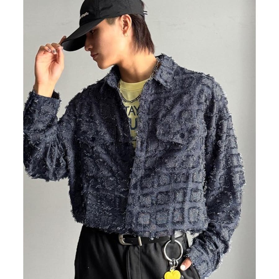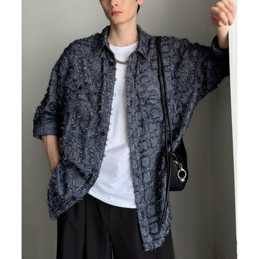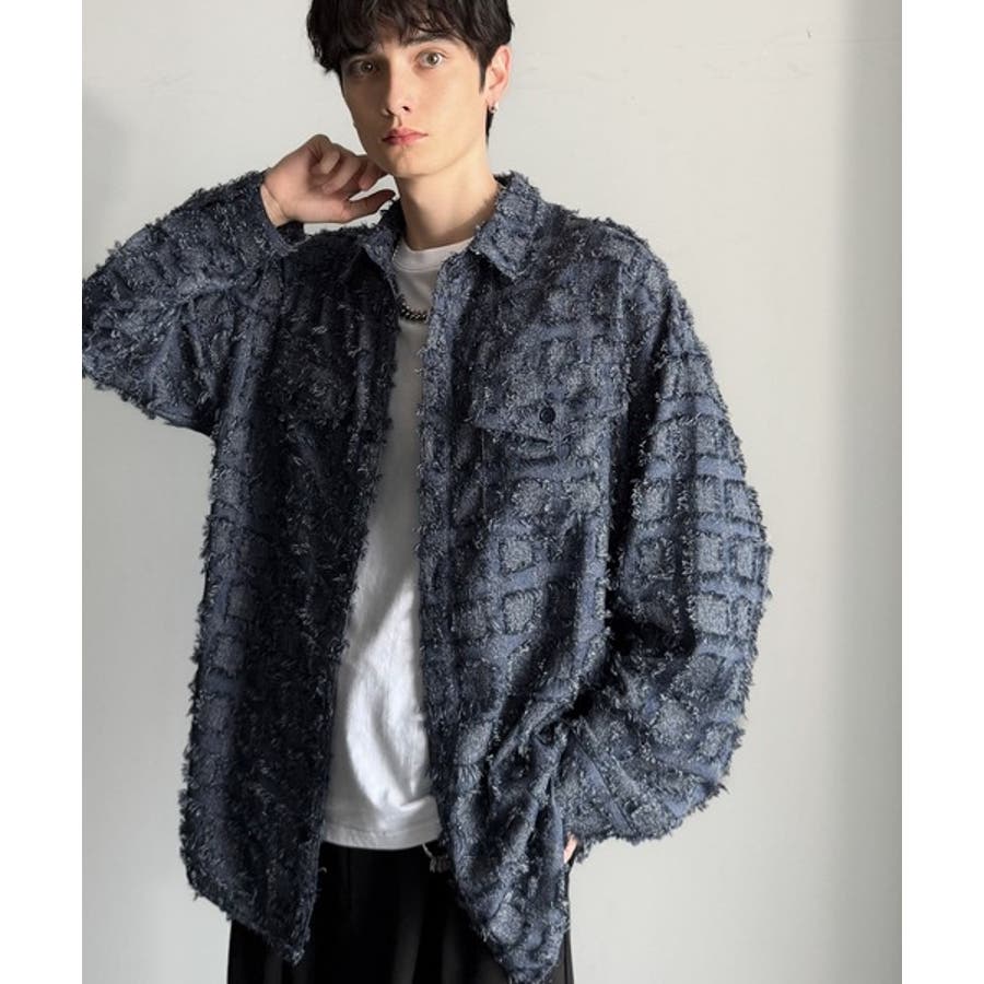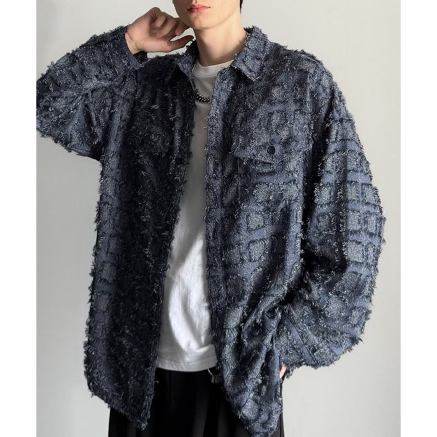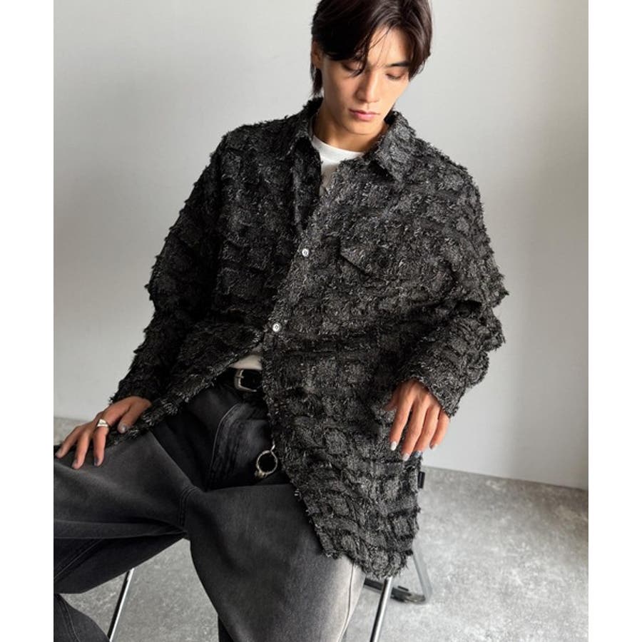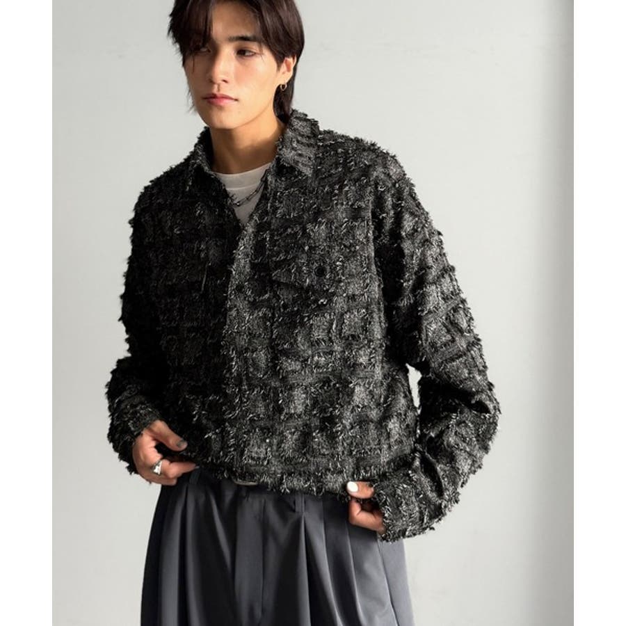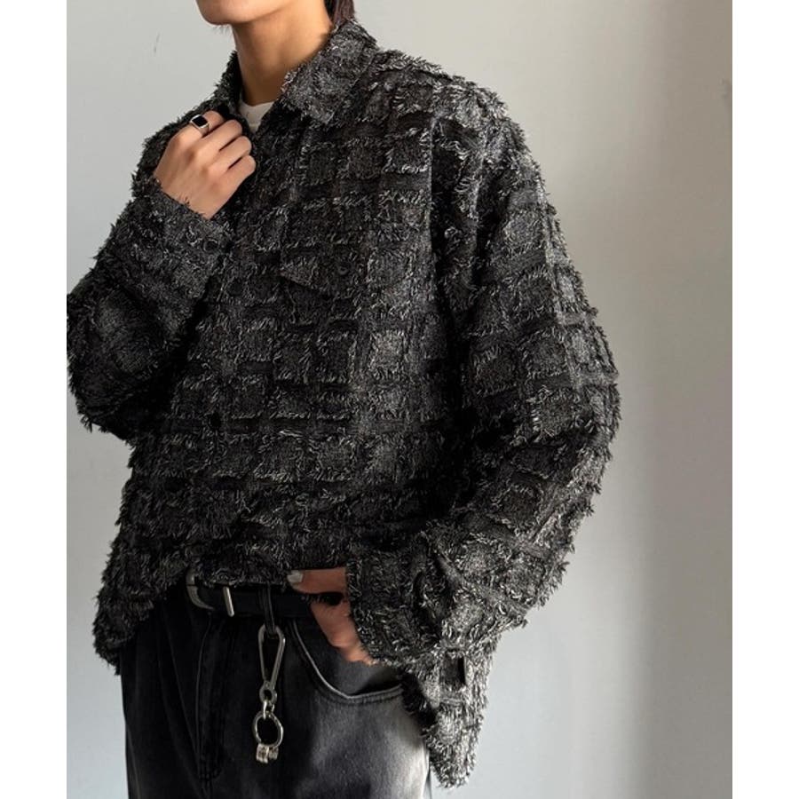 フリンジ使いブロックチェックアウターシャツは、存在感のあるデザインが特徴。