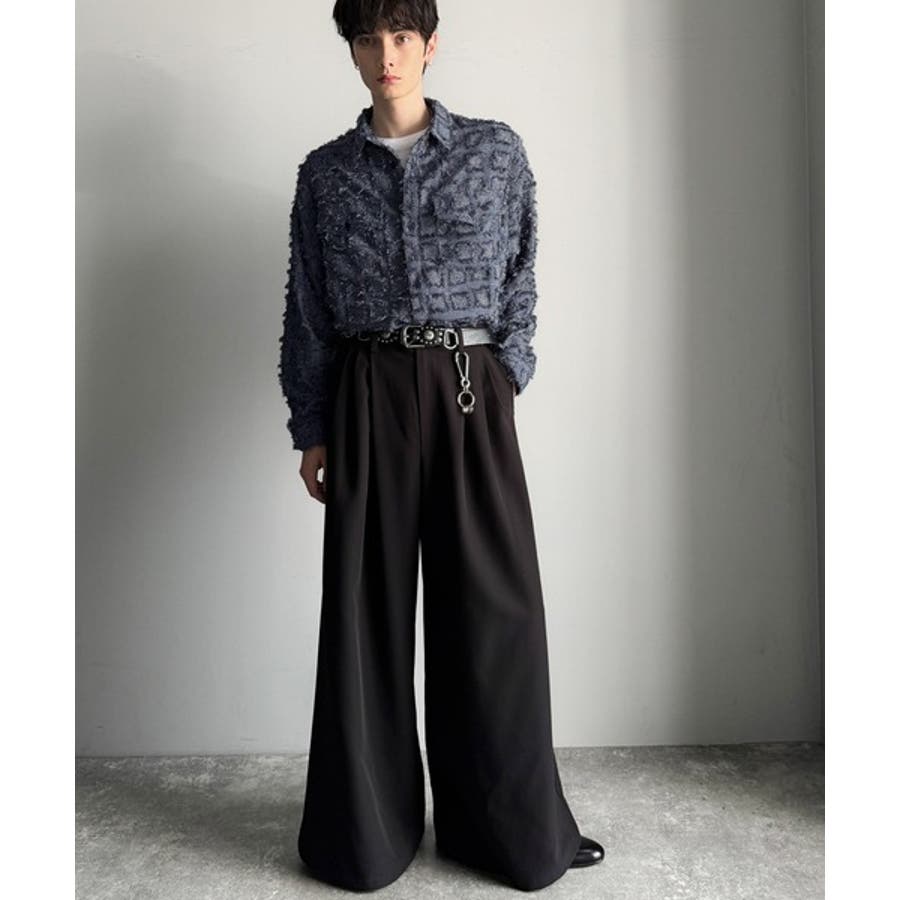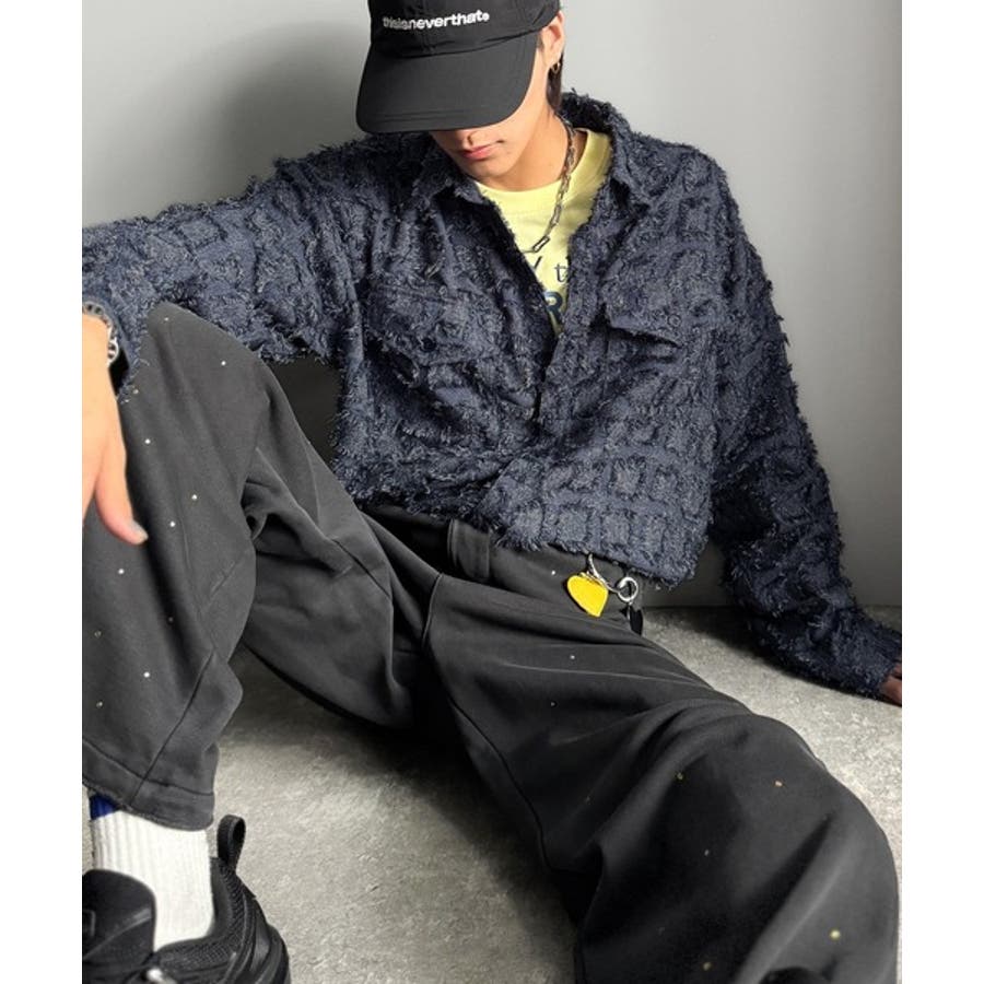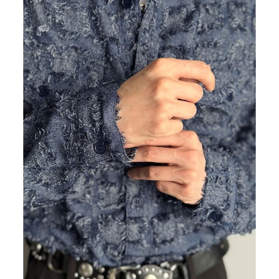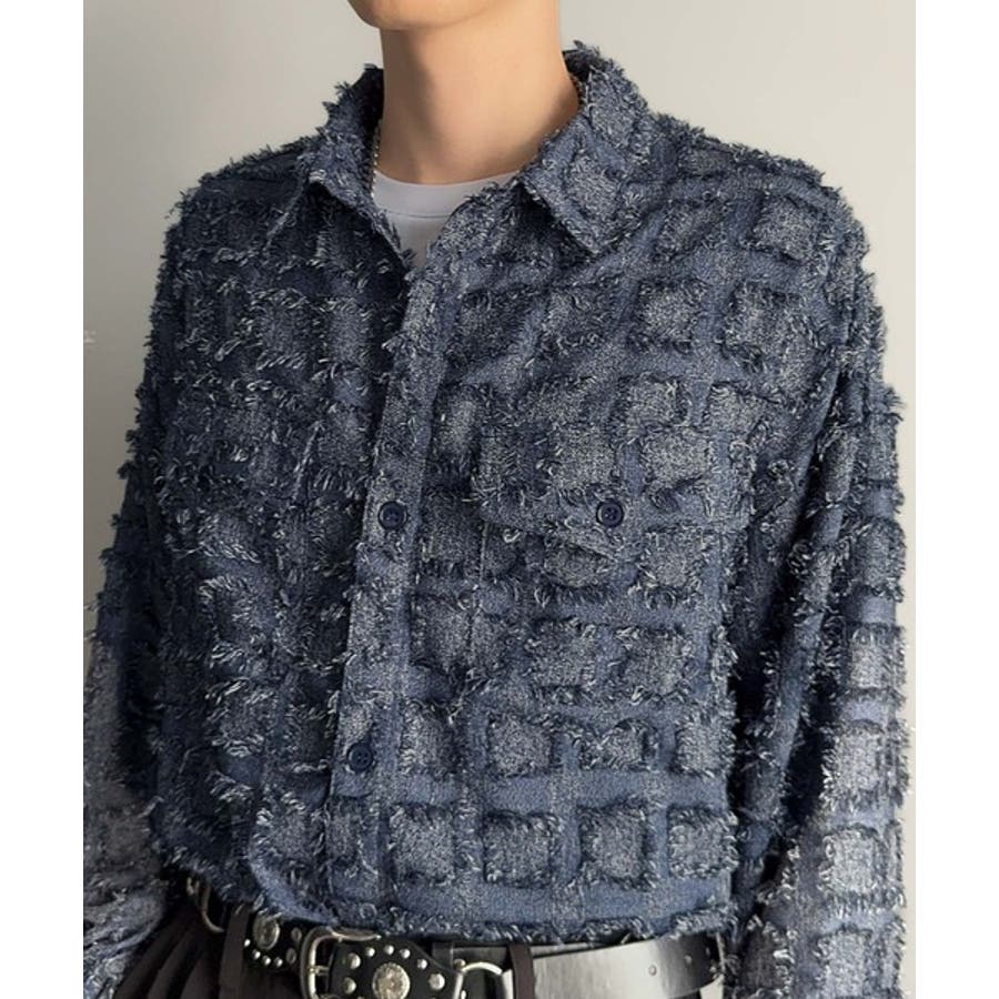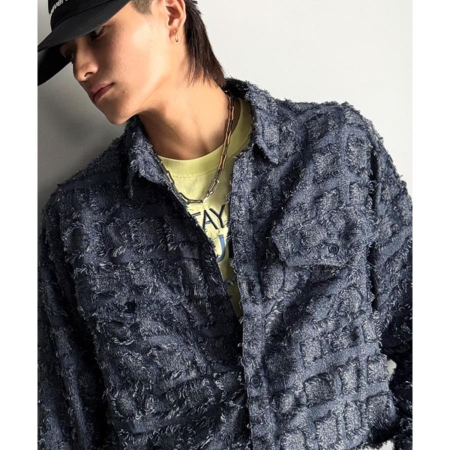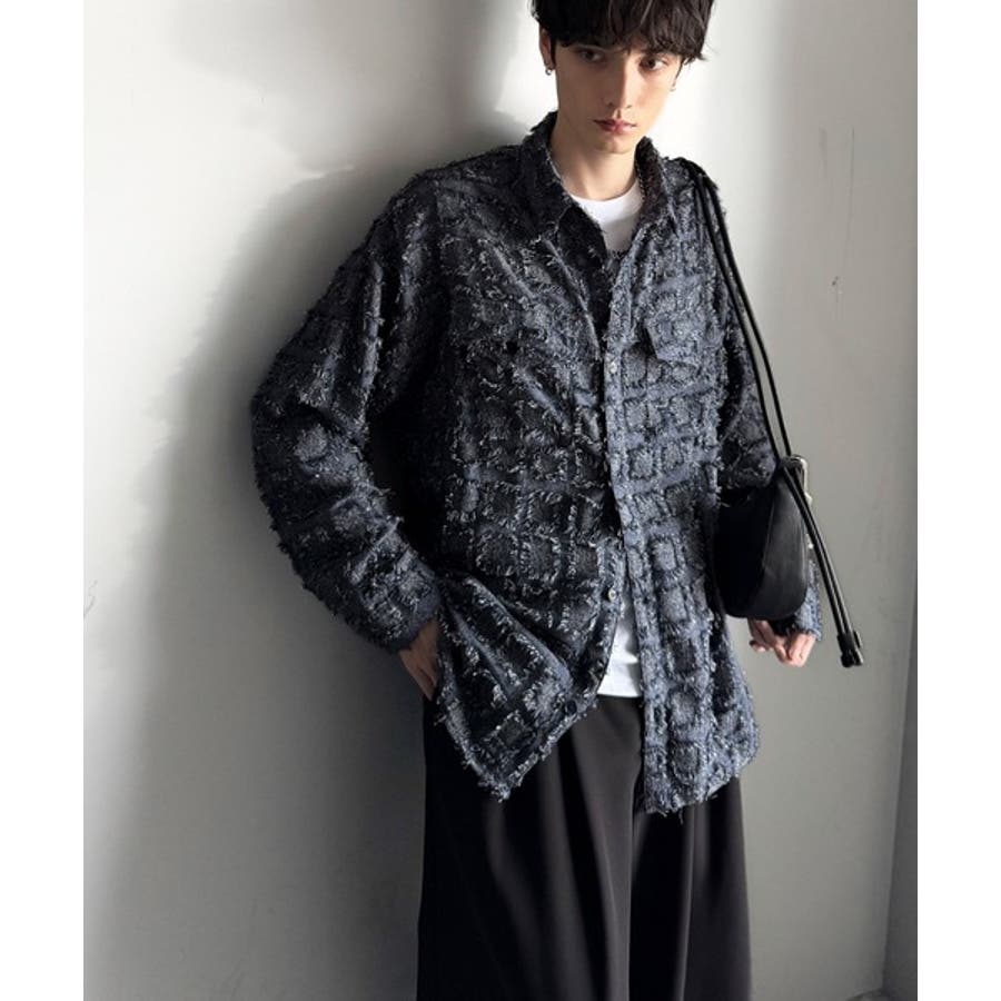 フリンジ使いブロックチェックアウターシャツは、存在感のあるデザインが特徴。