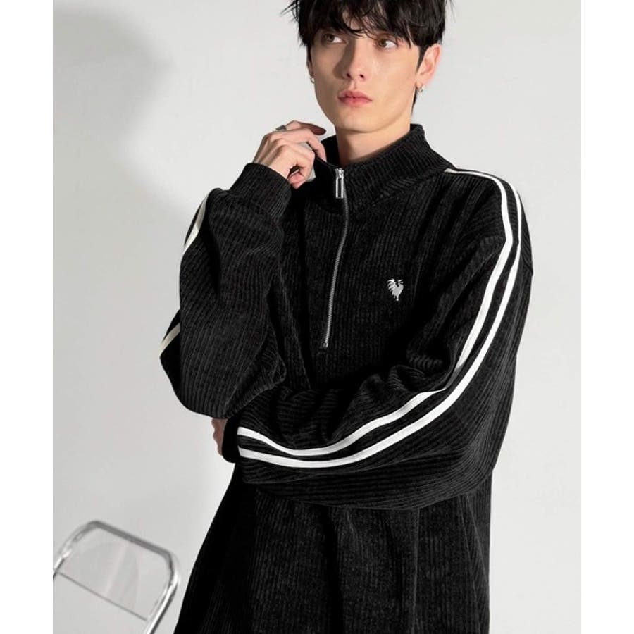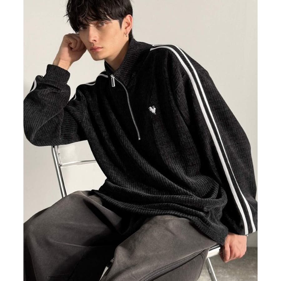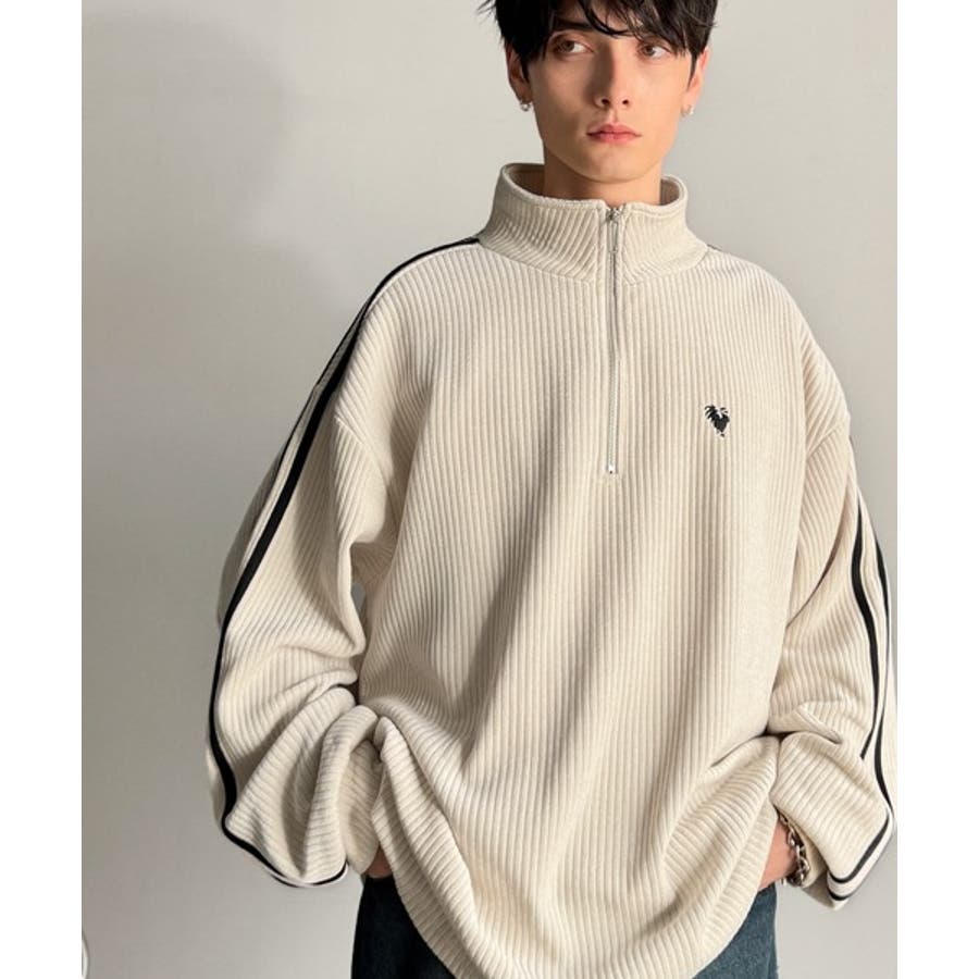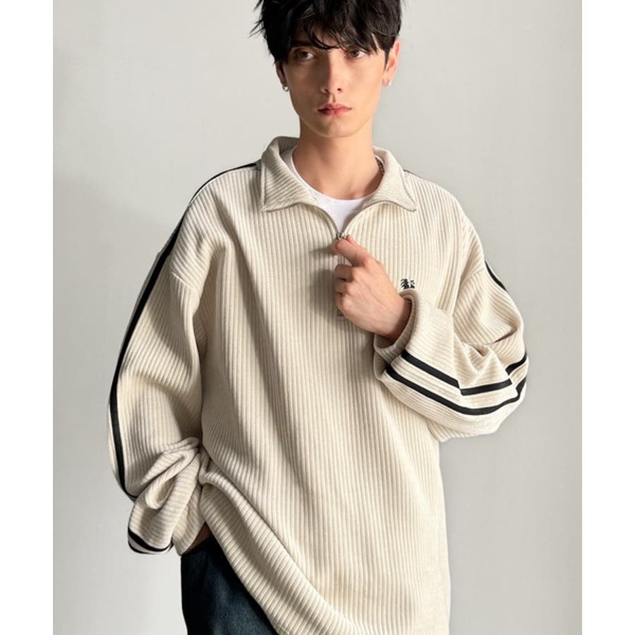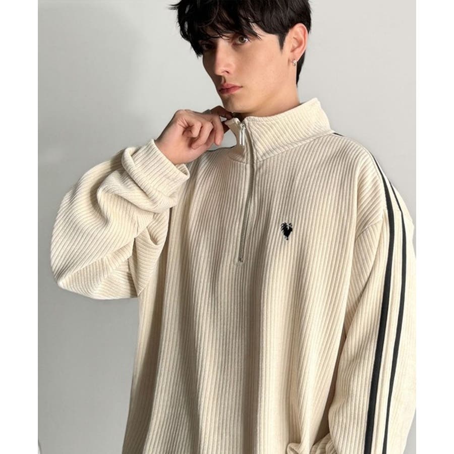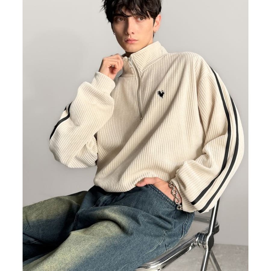 コーデュロイ素材Wラインハーフジップトレーナー」