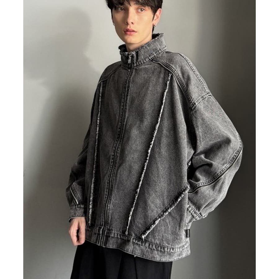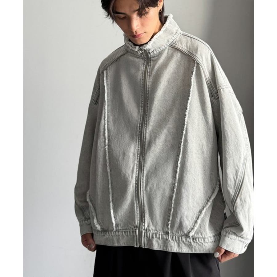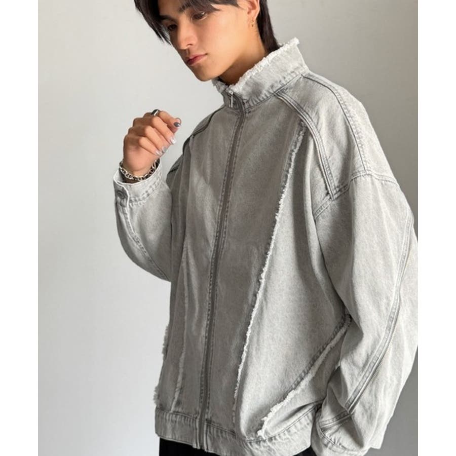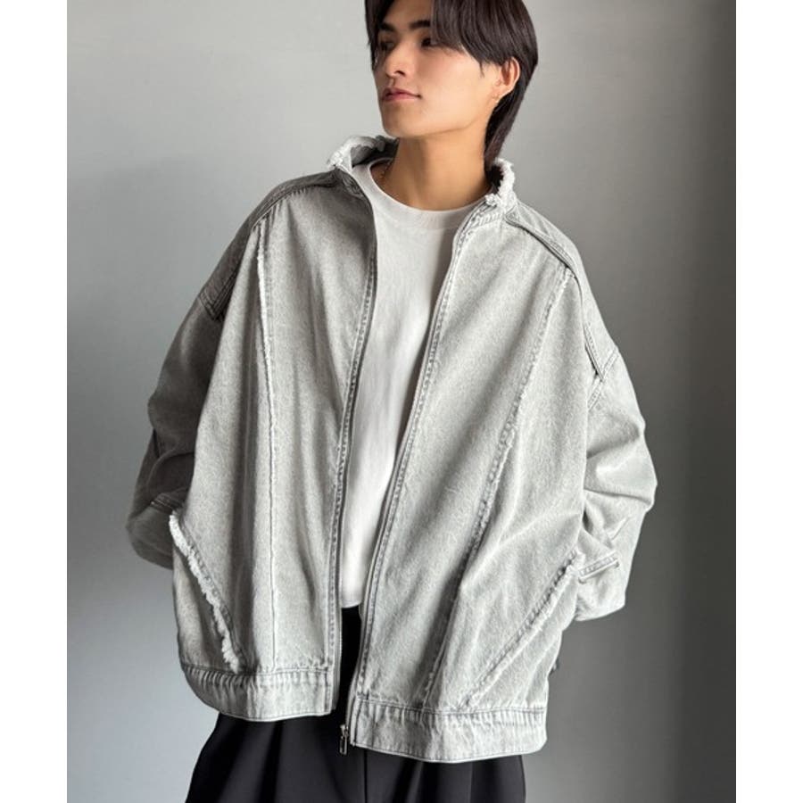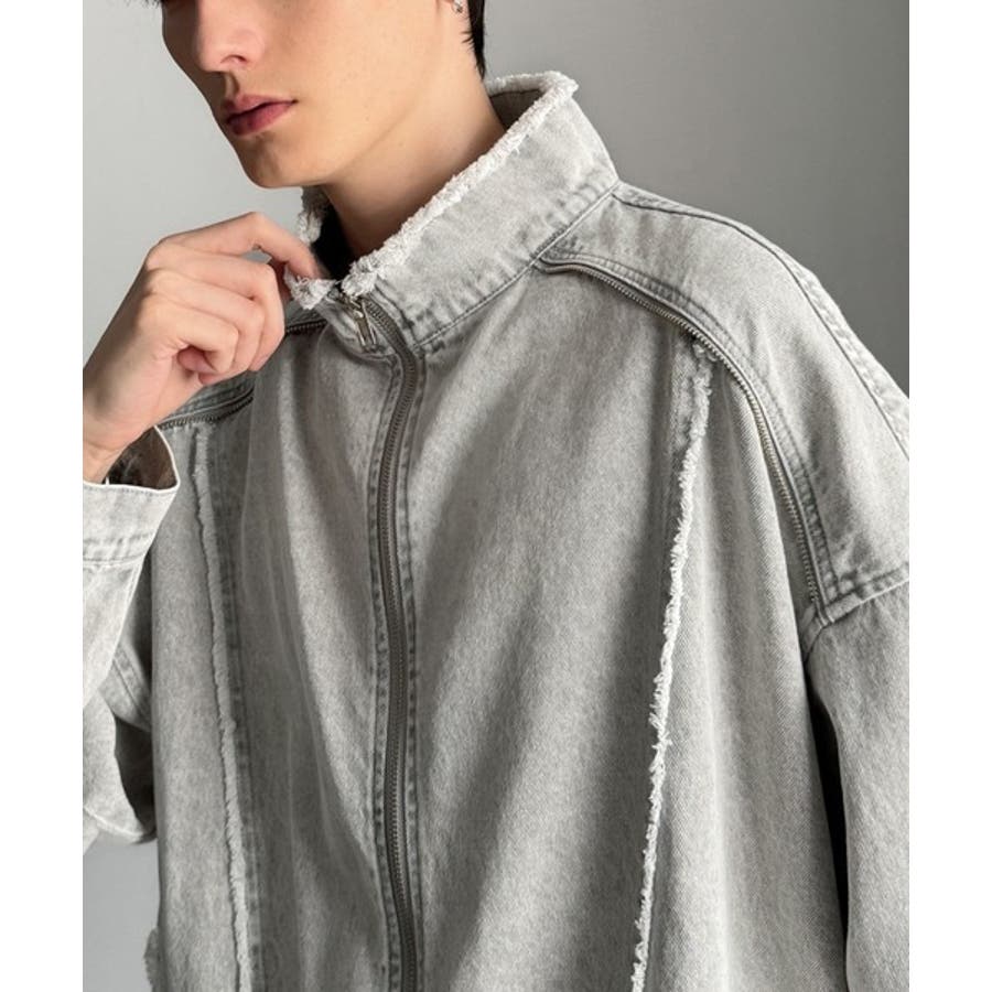 切りっぱなしのフリンジと切替ファスナーを施したデニムブルゾン。
