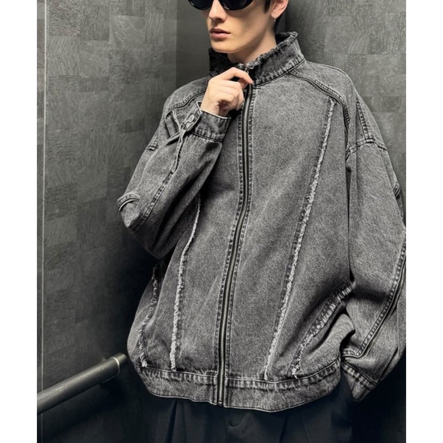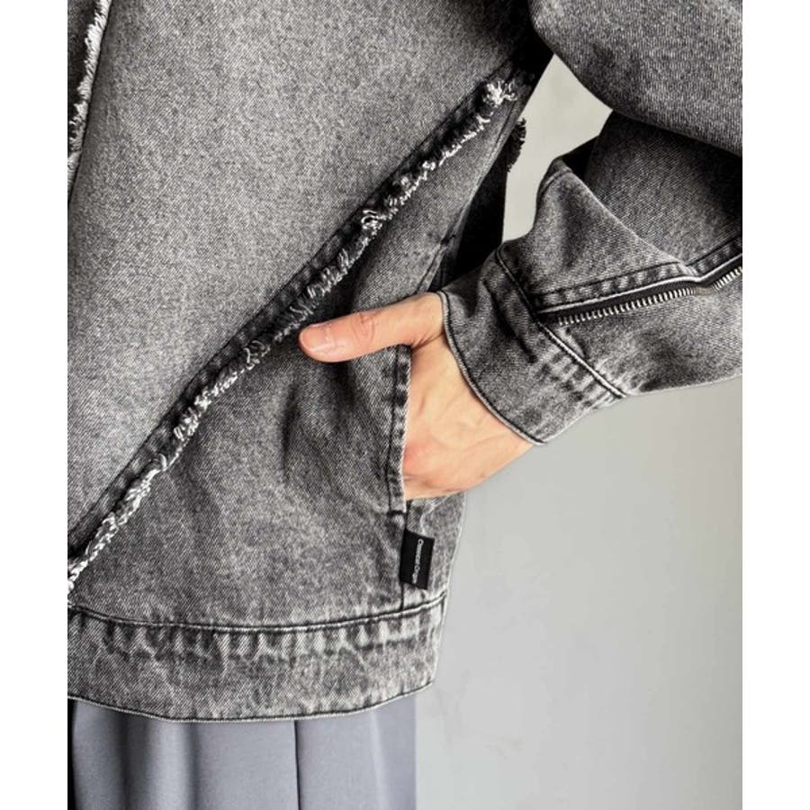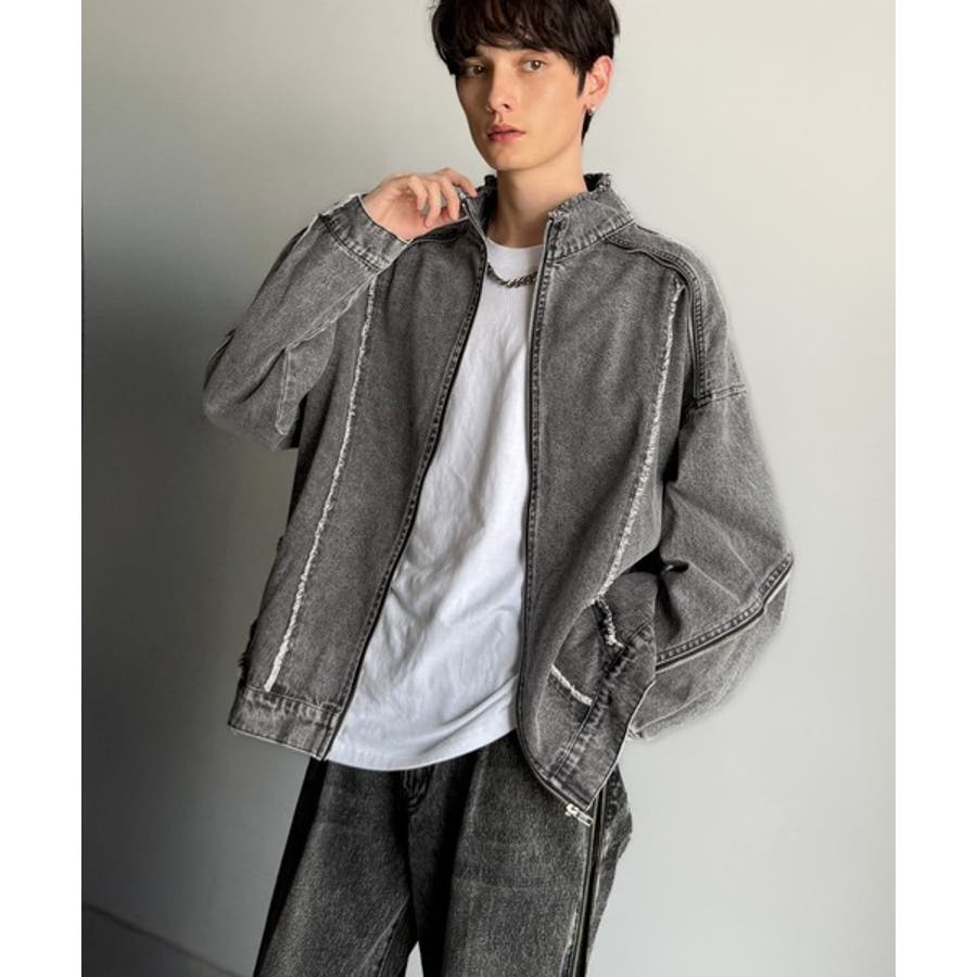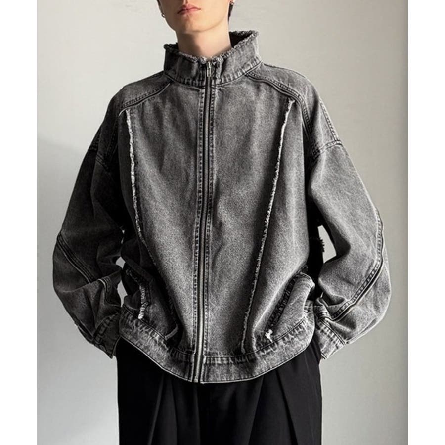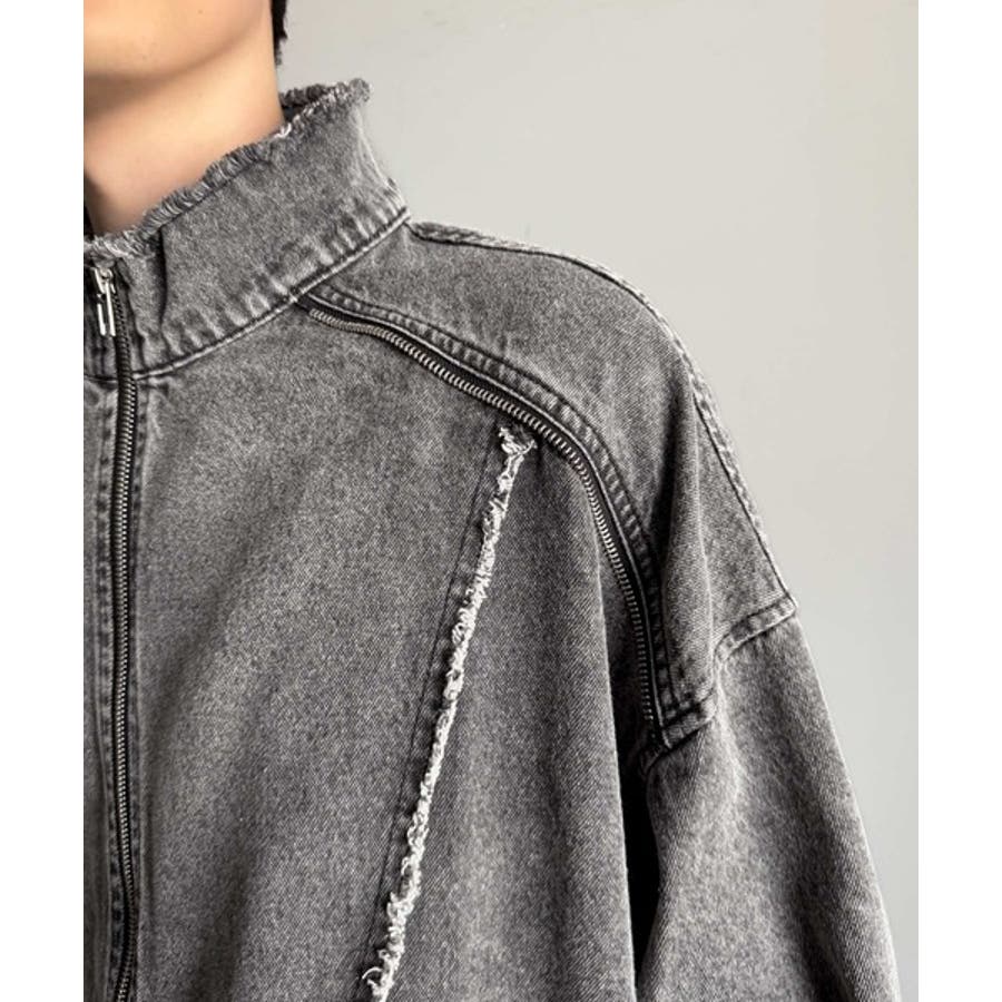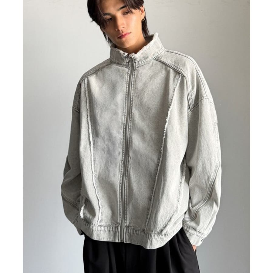 切りっぱなしのフリンジと切替ファスナーを施したデニムブルゾン。