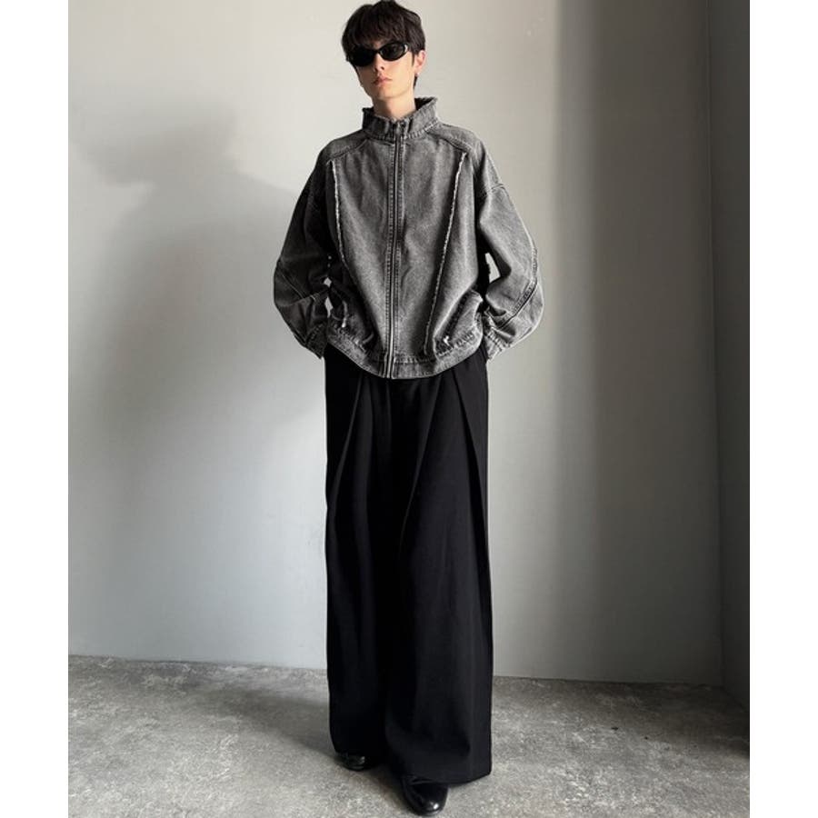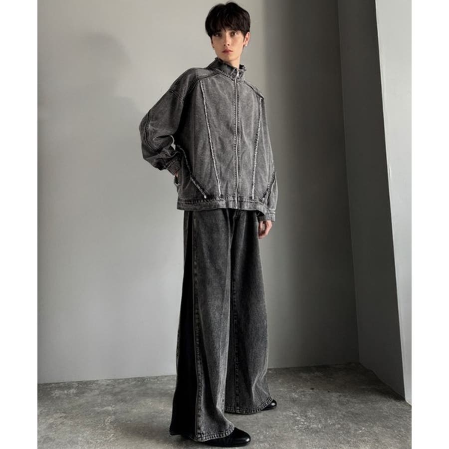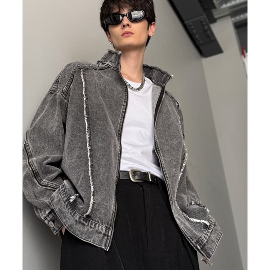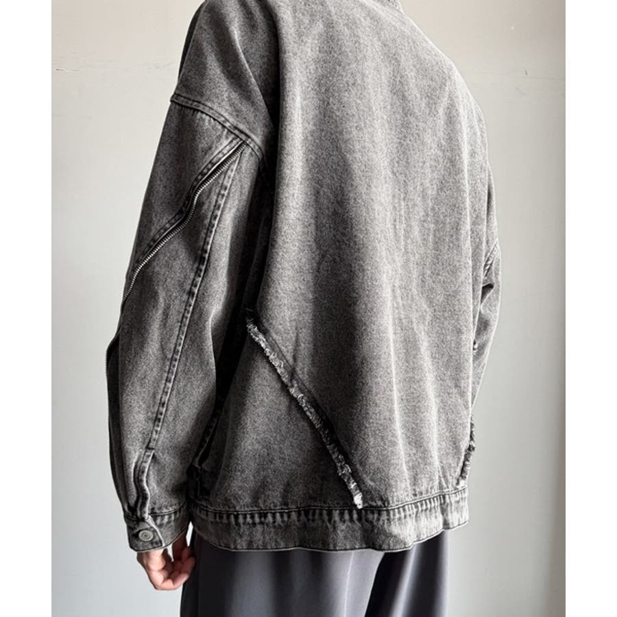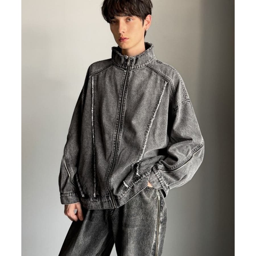 切りっぱなしのフリンジと切替ファスナーを施したデニムブルゾン。