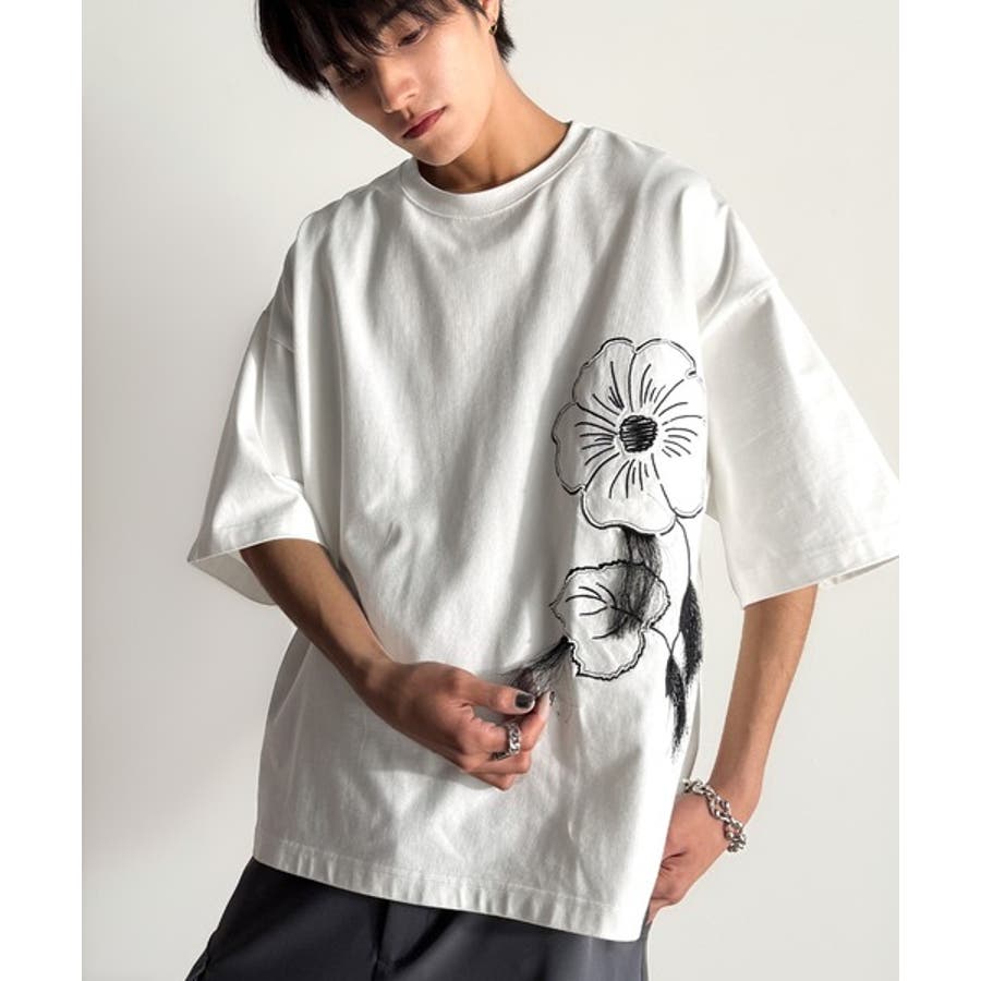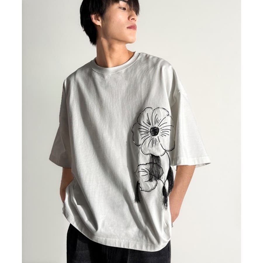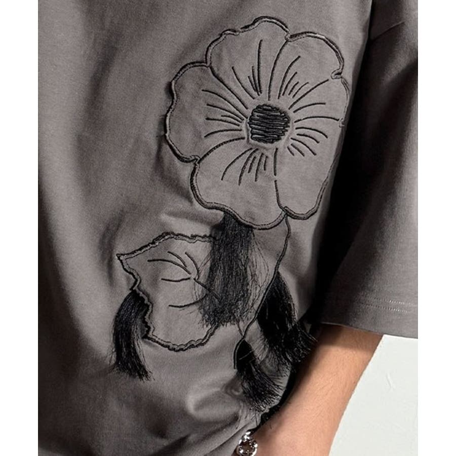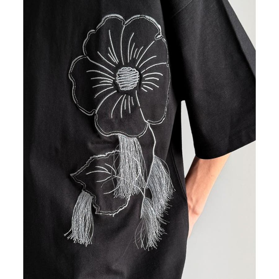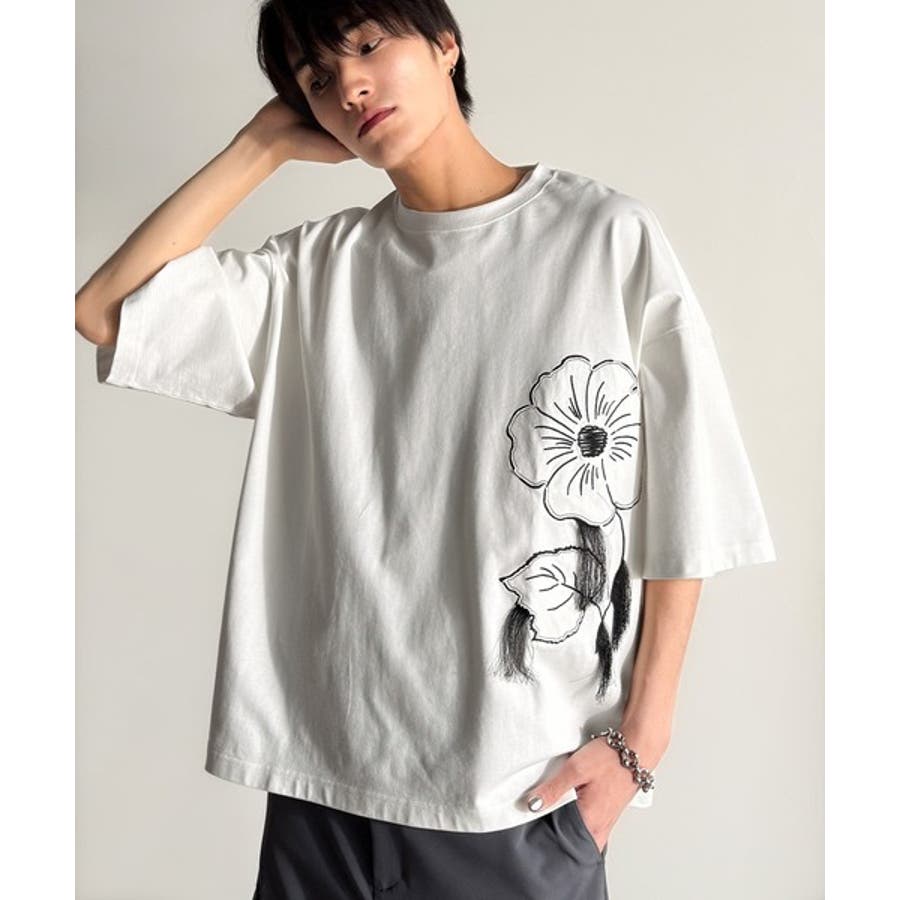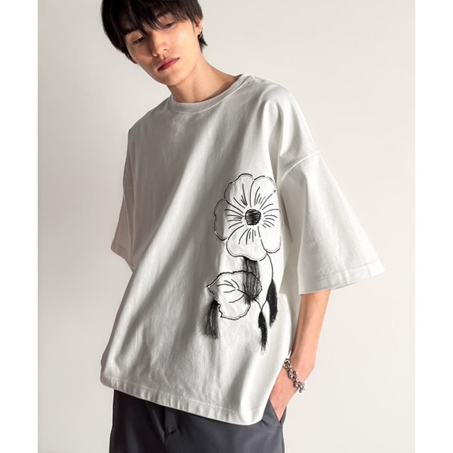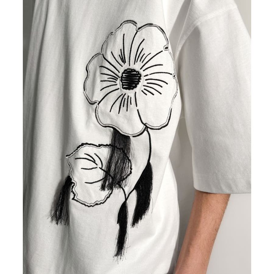 「Flower Stitch Applique Design T-Shirt/綿100%フラワーステッチアップリケデザインTシャツ」